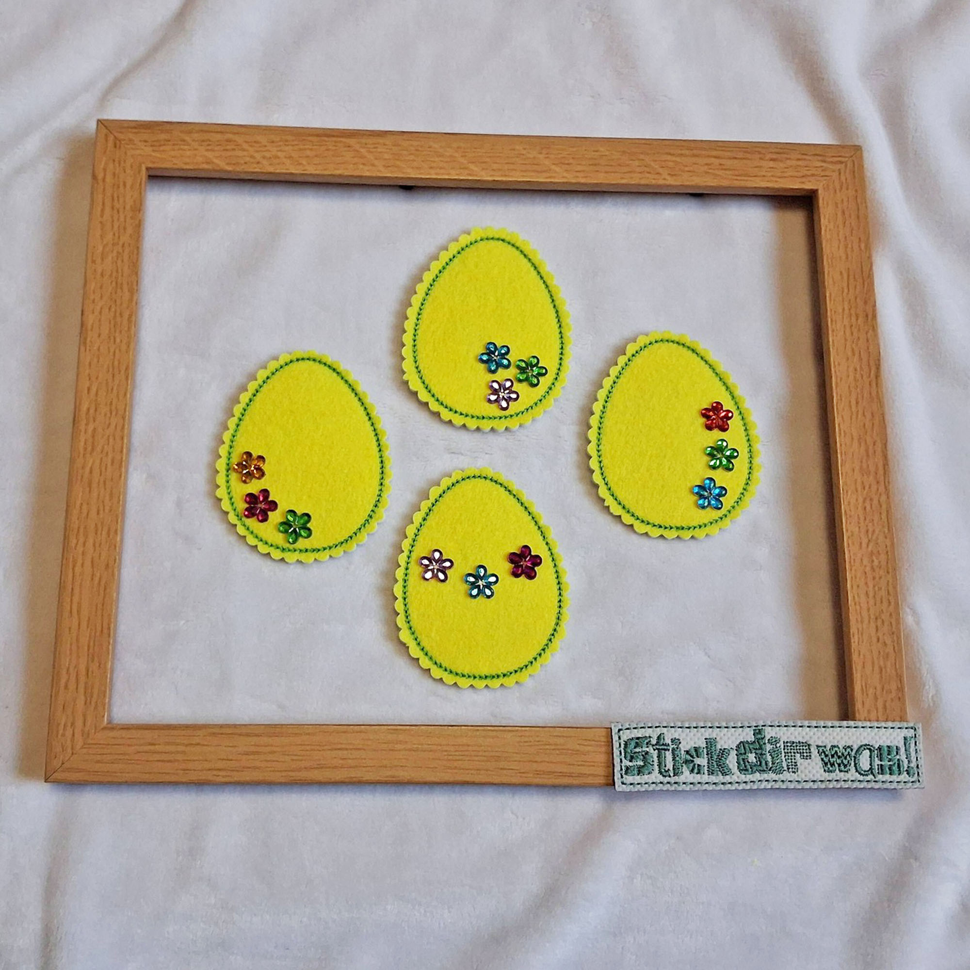 Stickdatei Ei als ITH Doodle Applikation. Die Eier sind mit wenigen Sequenzen besonders schnell und einfach gestickt.