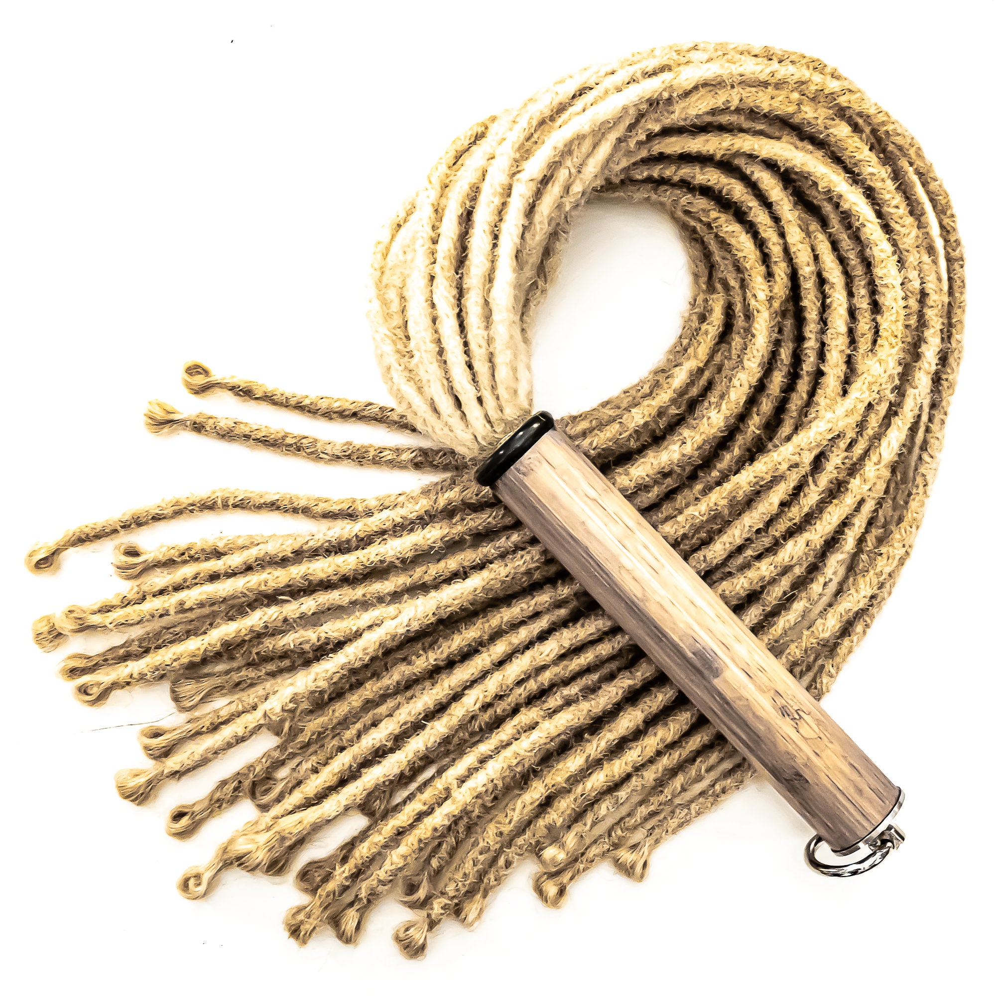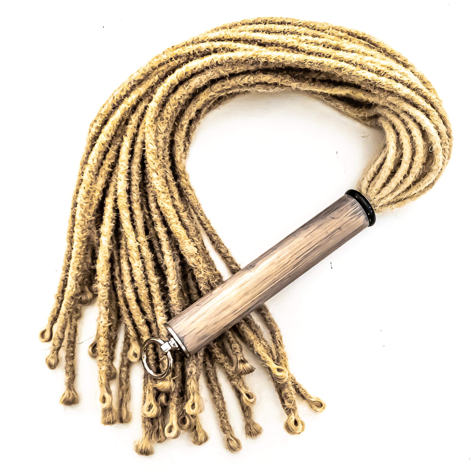 Flogger mit 30 dicken Dreadlocks aus künstlichem Haar in blond, ca. 61cm/24", davon ca. 17cm/7" Griff aus individuell gefärbtem Bambusholz, veredelt mit feinstem Lack und abgeschlossen mit unserem neuen großen O-Ring aus V2A Edelstahl.