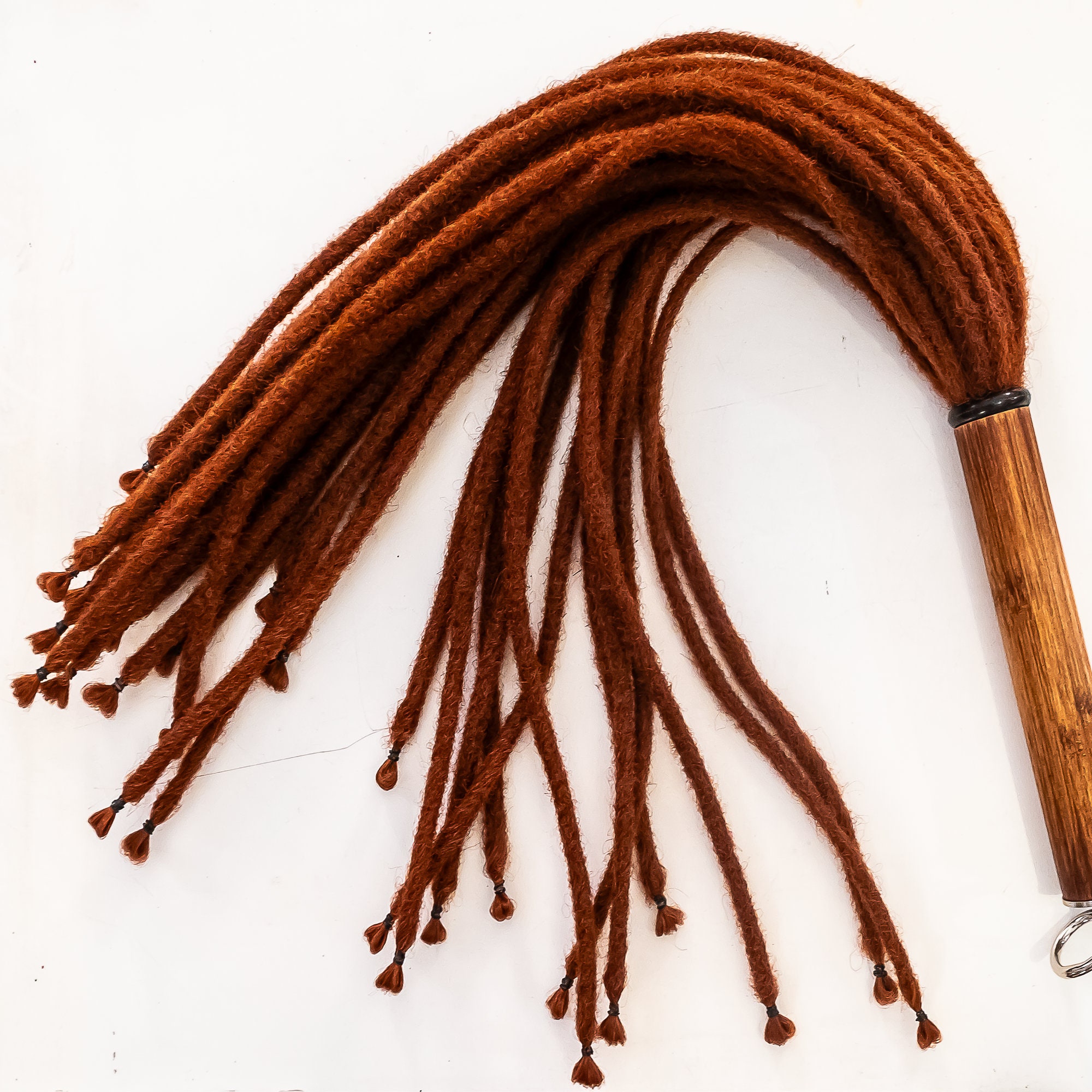 Flogger mit 30 Dreadlocks aus künstlichem Haar in rotbraun, ca. 61cm/24", davon ca. 17cm/7" Griff aus individuell gefärbtem Bambusholz, veredelt mit feinstem Lack und abgeschlossen mit unserem neuen großen O-Ring aus V2A Edelstahl.