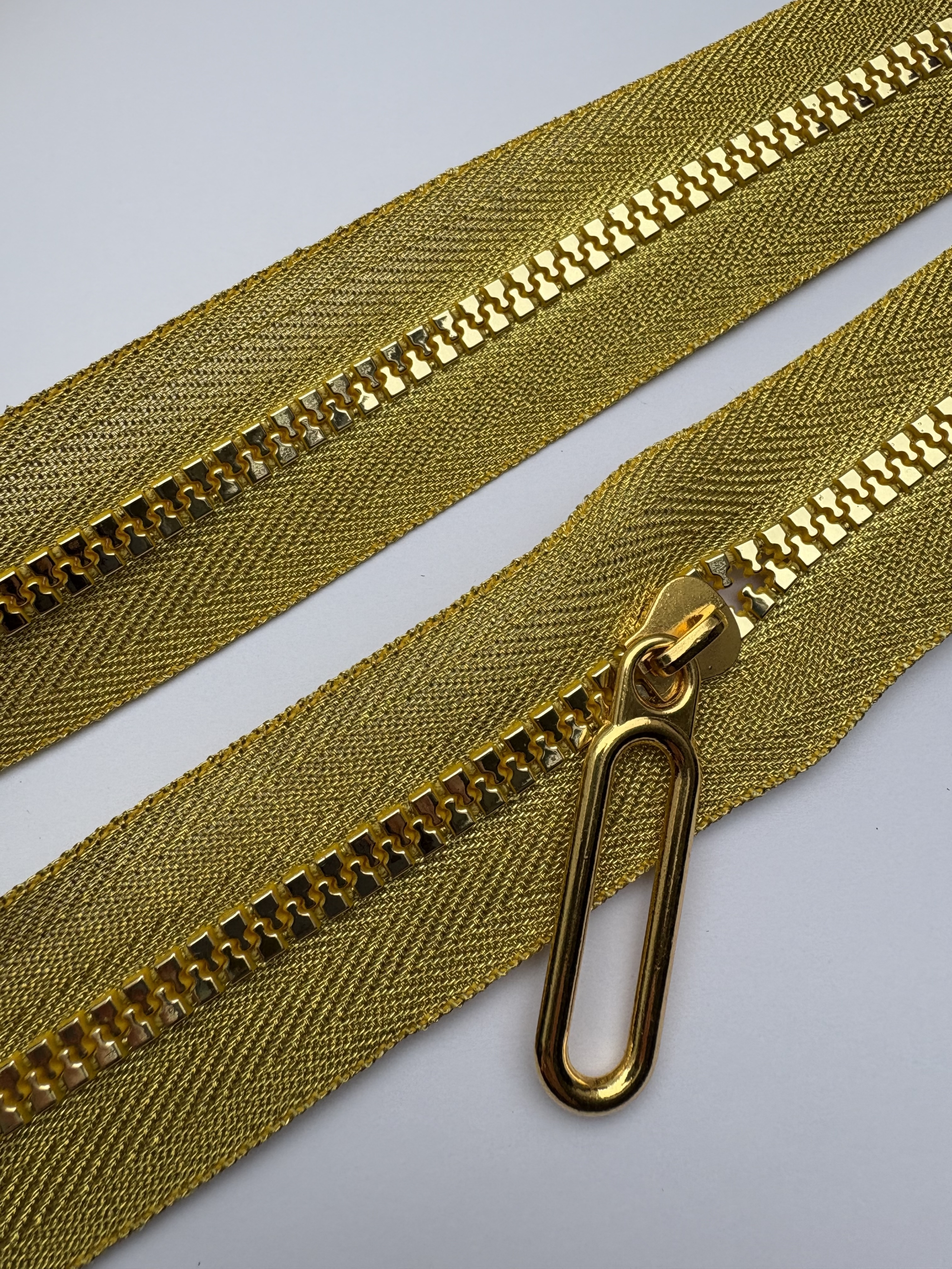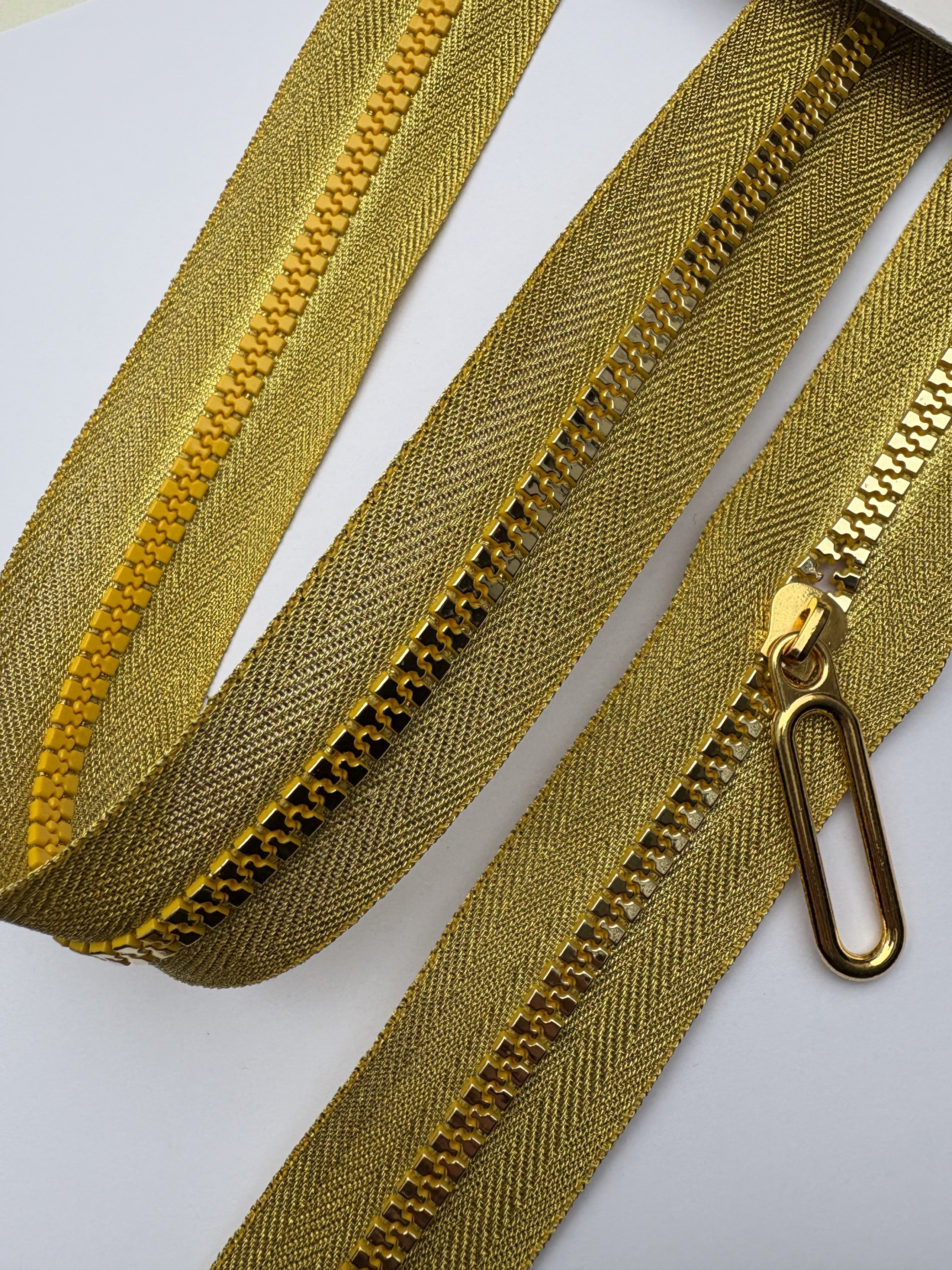Effektvoller Knochen-Reißverschluss in glänzendem Metallic-Gold – ideal für Taschen, Accessoires, Kleidungsstücke oder kreative Nähprojekte.