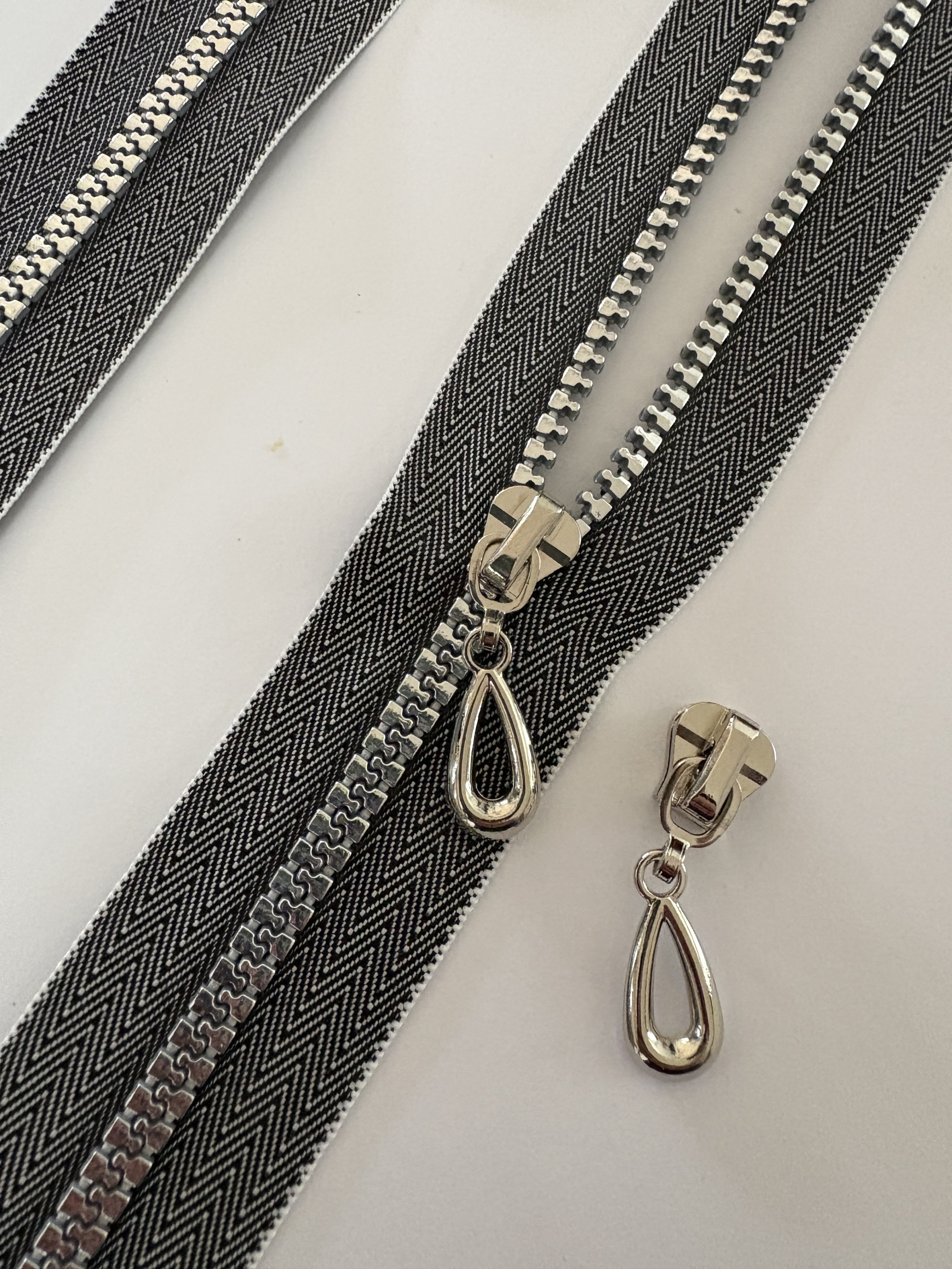 Menge: ab 1 m Reißverschluss & 2 Stück Zipper / Schieber in der Farbe silber in "Tropfen-Form"