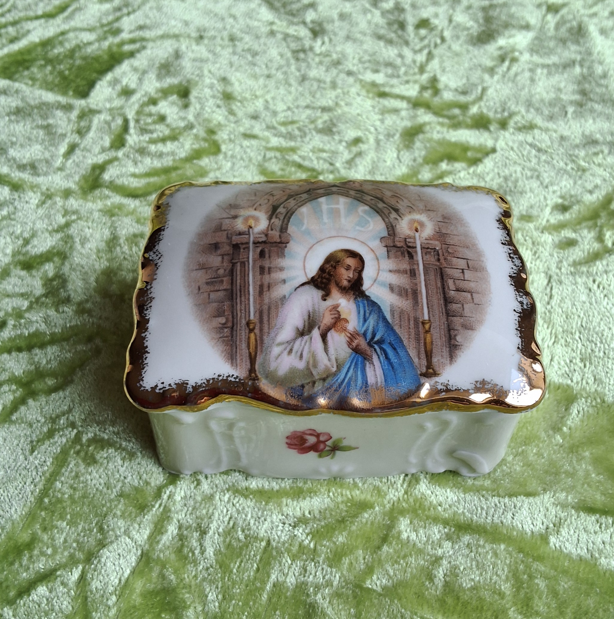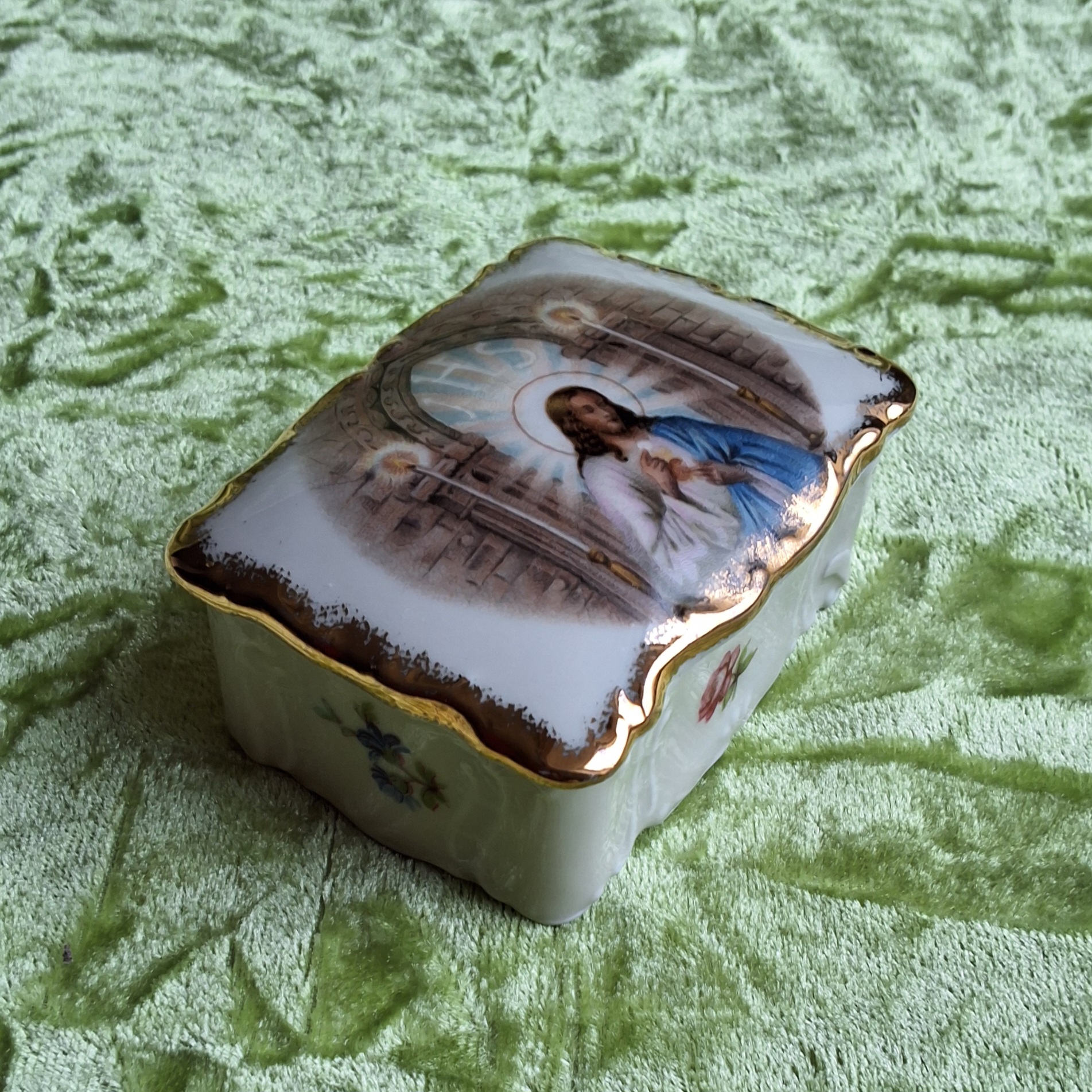 Dieses zierliche Porzellandöschen aus feinem, geschwungenen Porzellan mit breiter Goldborte, wurde oft als Schmuck- oder Rosenkranzdose verwendet. Es zeigt Jesus, Tempelsäulen im Hintergrund, der auf sein flammendes Herz zeigt. Ausdruck für die göttliche Liebe zu uns Menschen.
