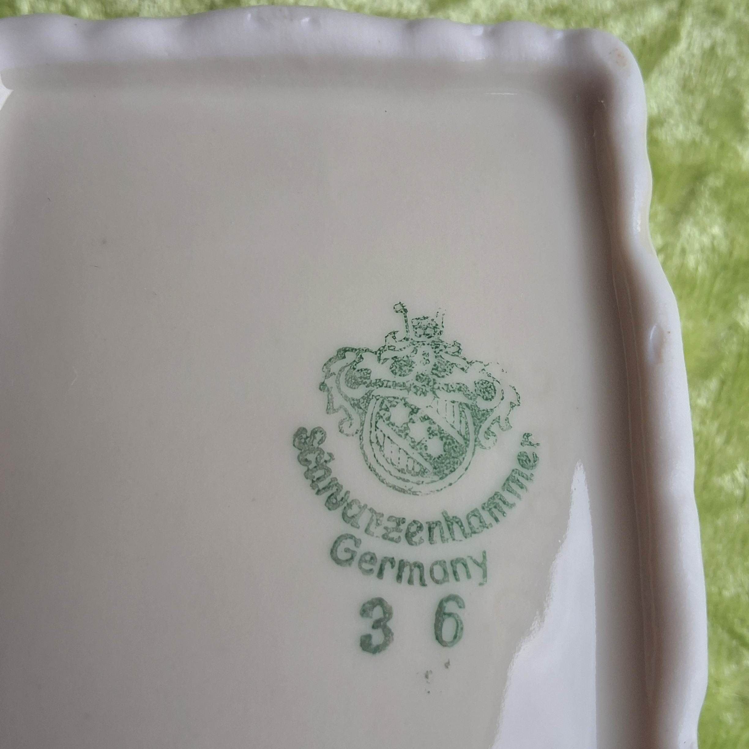 Die Gestaltung - die abgerundeten, geschwungenen Kanten und Linien, der Goldrand und das religiöse Motiv sowie der grüne Porzellanstempel "Schwarzenhammer unter einem Wappen", sprechen für eine kunsthandwerkliche Fertigung zwischen den Jahren um 1949 bis etwa 1952.