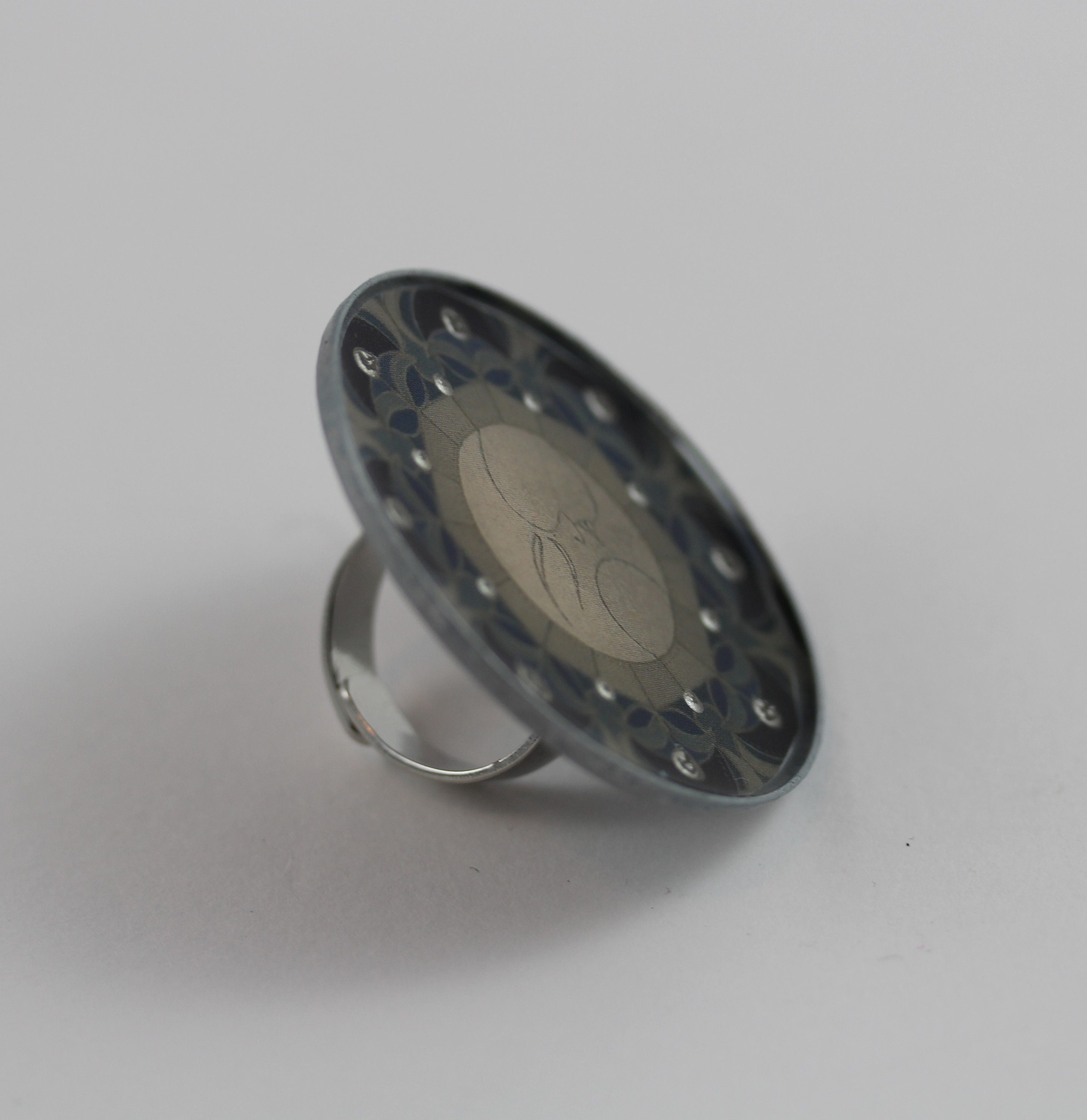 Der Ring ist aus glänzend silberfarbenem Metall, Künstlerfarben, Motiv unter Resinguss.