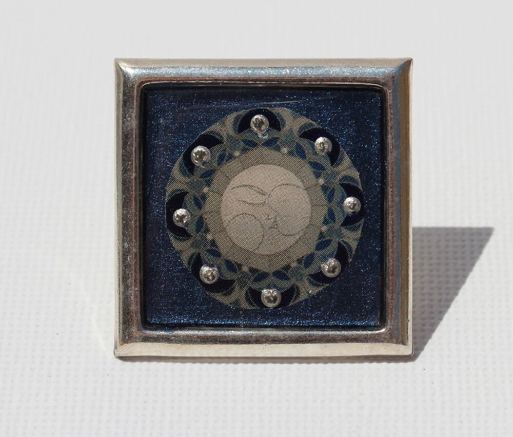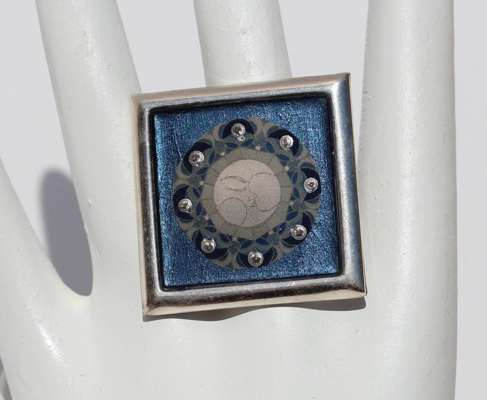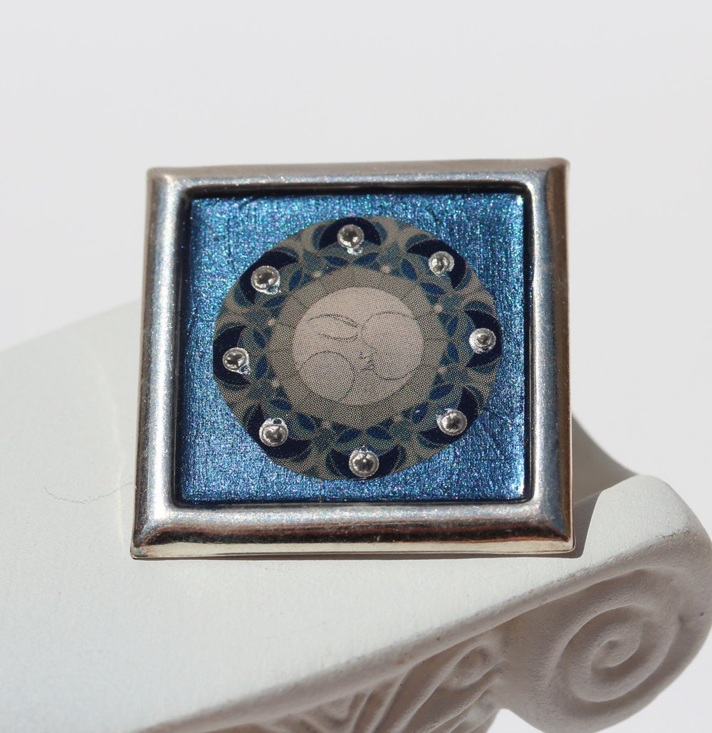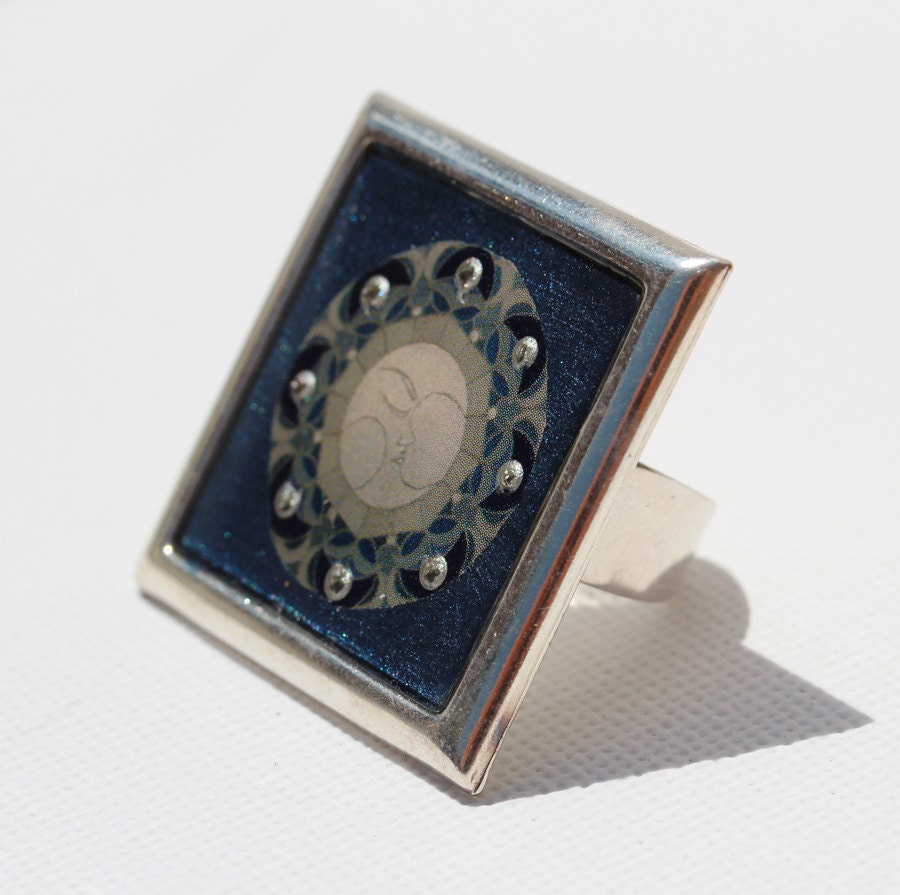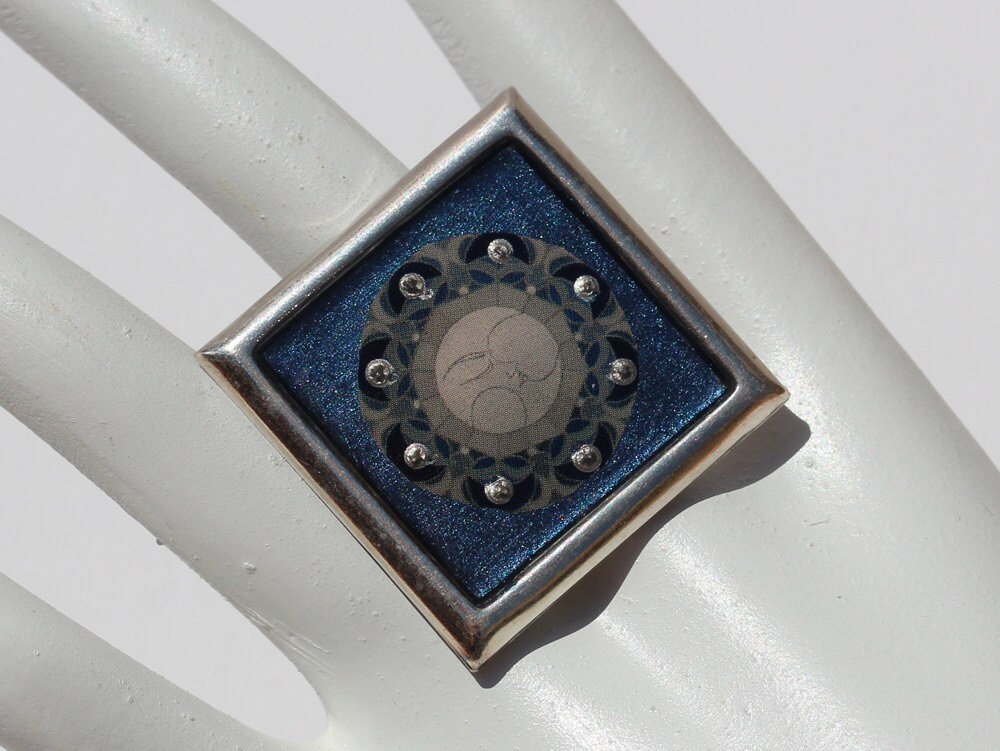 Ein wundervoller Ring mit dem Mond Mandala Motiv "Lunasacrada" auf silbrig dunkelblauem Hintergrund. Das Bild ist von Hand eingearbeitet in einem schönen silberfarbenen Ring mit quadratischem Rahmen.