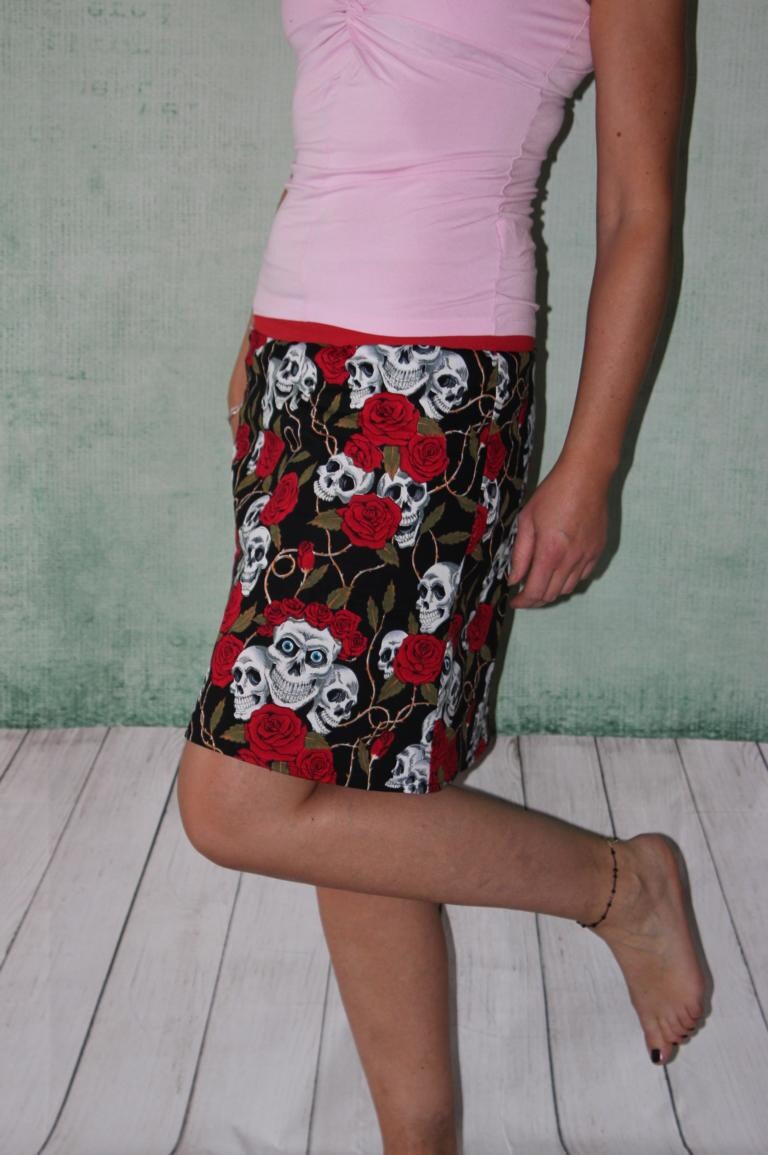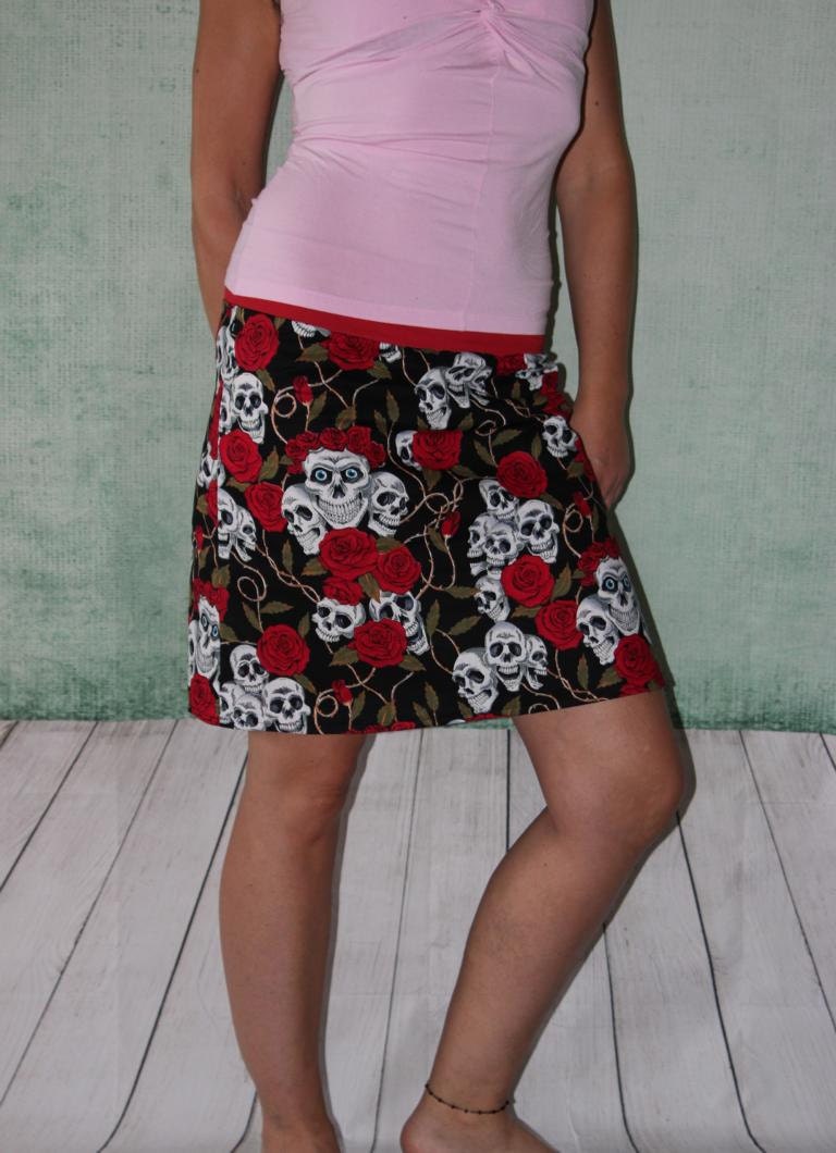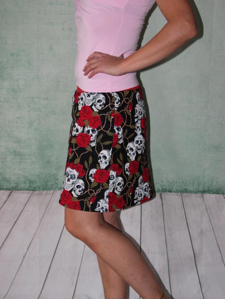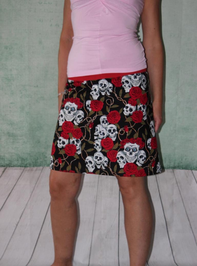Rock aus bunten Baumwollstoff mit großen Rosen und Totenköpfen.