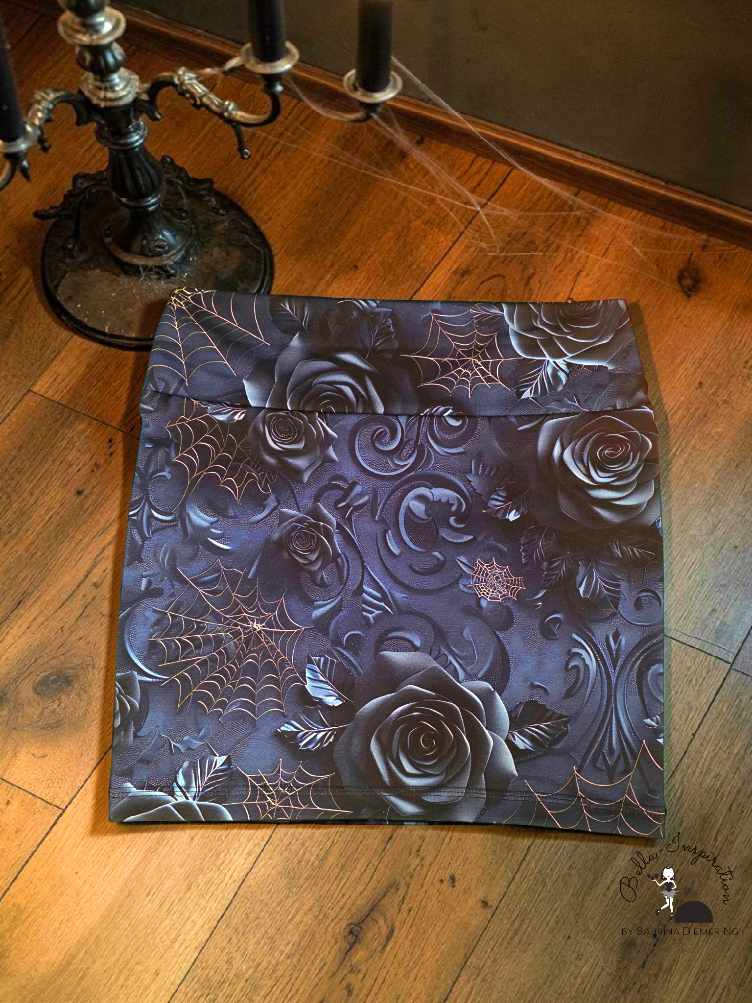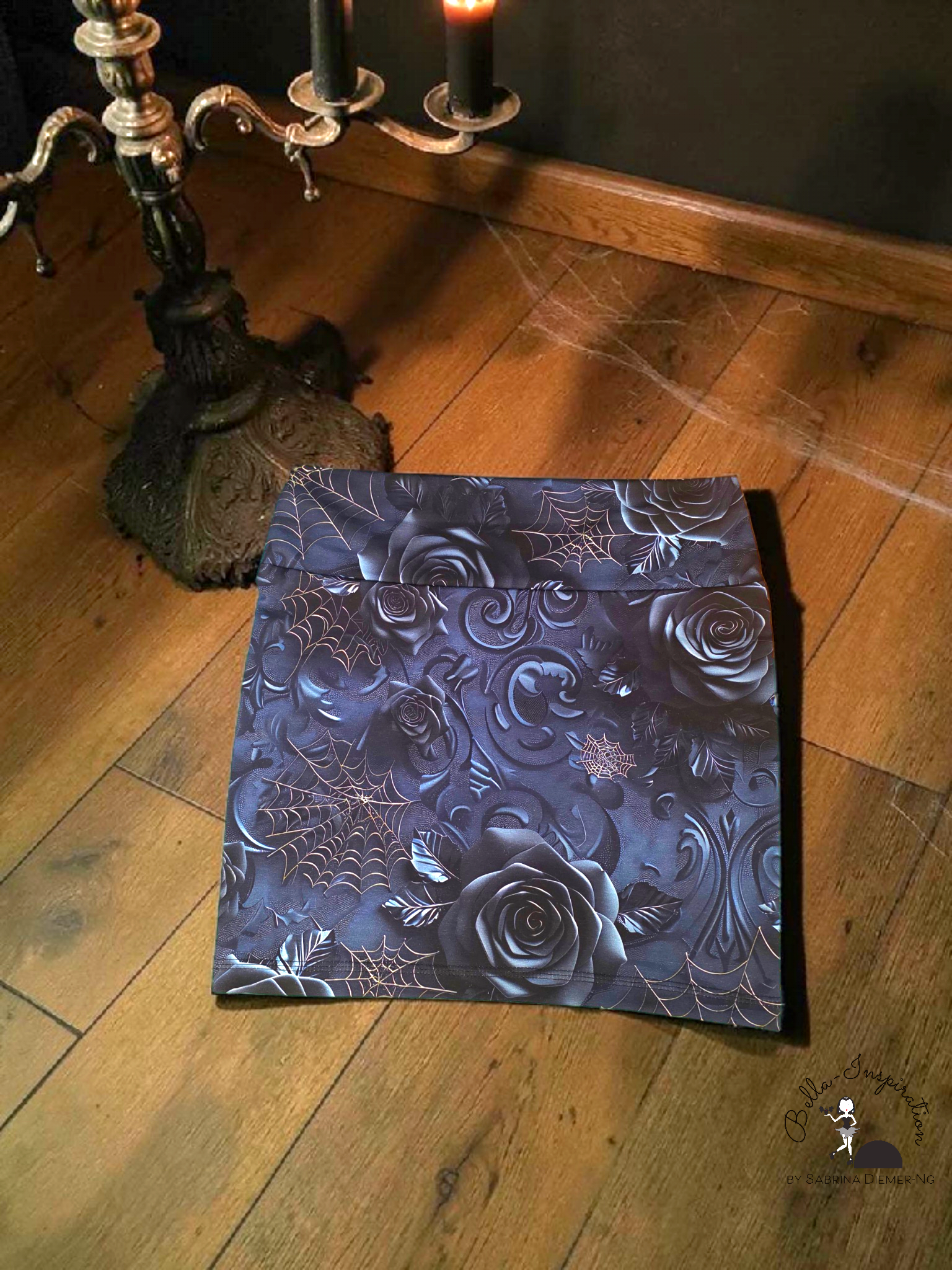 Süßer Minirock in Blautönen mit Rosen und Spinnennetzen.