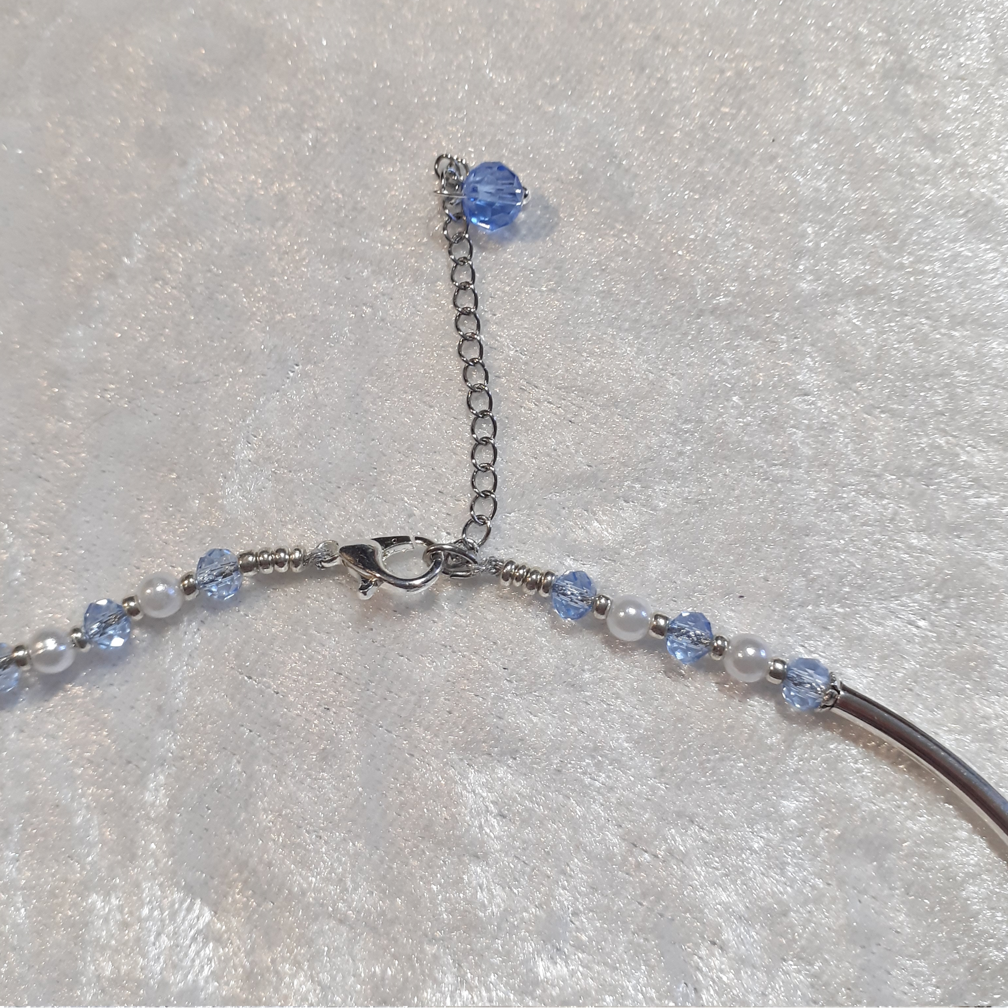 Diese Kette besteht aus einer Kombination von blauen Glasperlen, silberfarbenen Rörhrenperlen und cremefarbenen Wachsperlen.