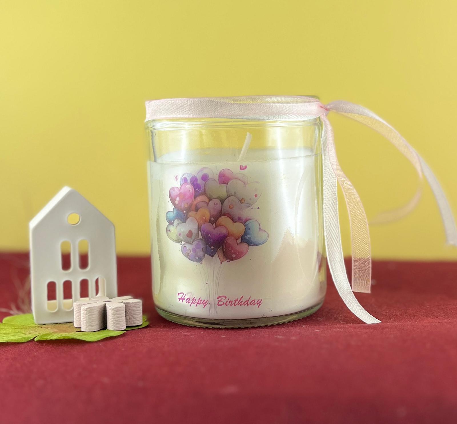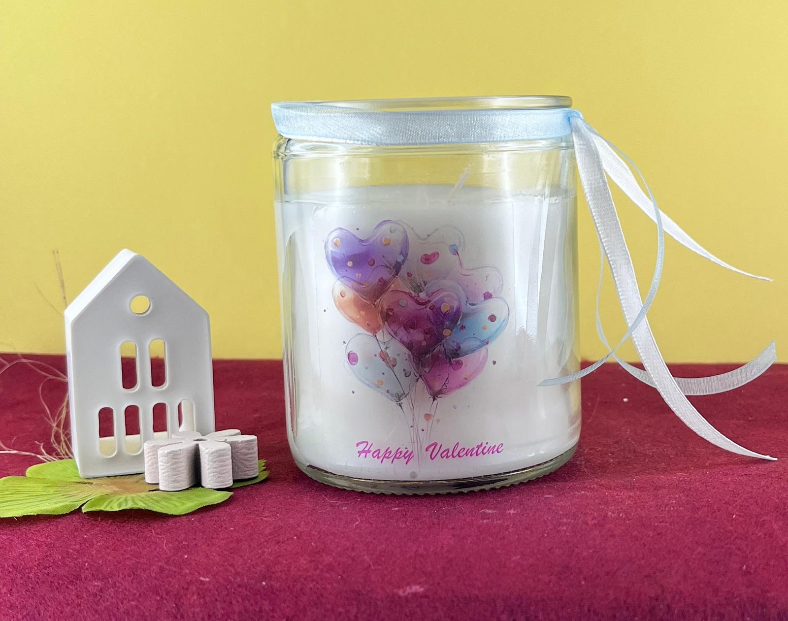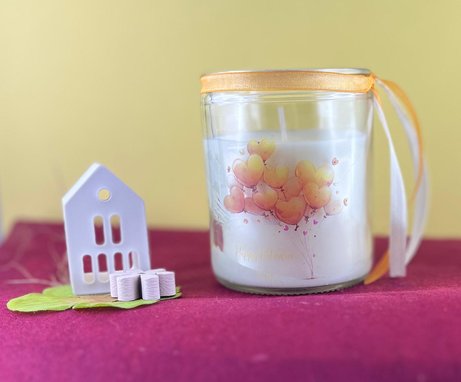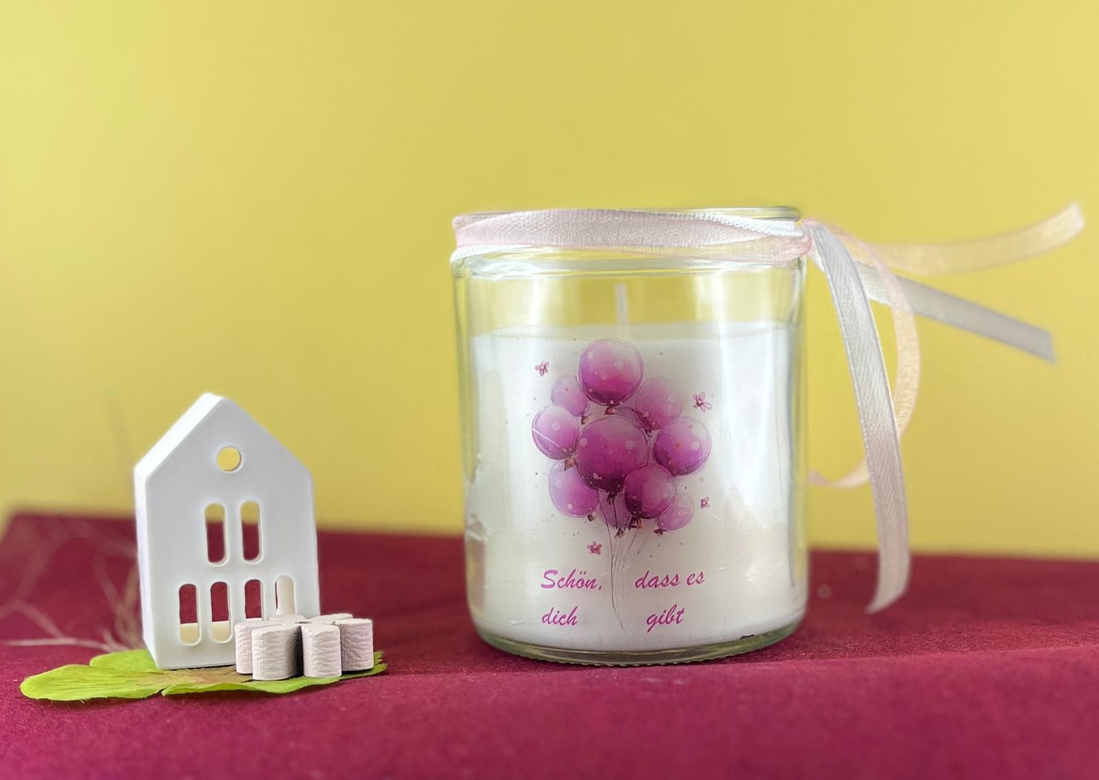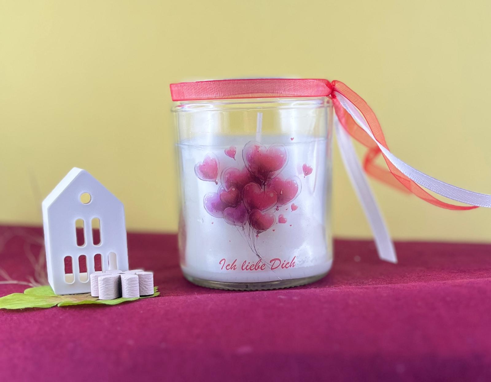Verleihen Sie dem Valentins- oder Geburtstag eine ganz besondere Note mit unserer wunderschönen Kerze im Glas! Diese handgefertigte Kerze ist nicht nur ein Highlight in jedem Raum, sondern auch ein wahres Statement der Liebe. Die Kerze wird verziert, mit bezaubernden Luftballons in Herzform verziert, die auf Wasserschiebefolie gedruckt und in Handarbeit liebevoll aufgetragen werden. Die Botschaft der Liebe und Zuneigung auf wundervolle Weise vermitteln.