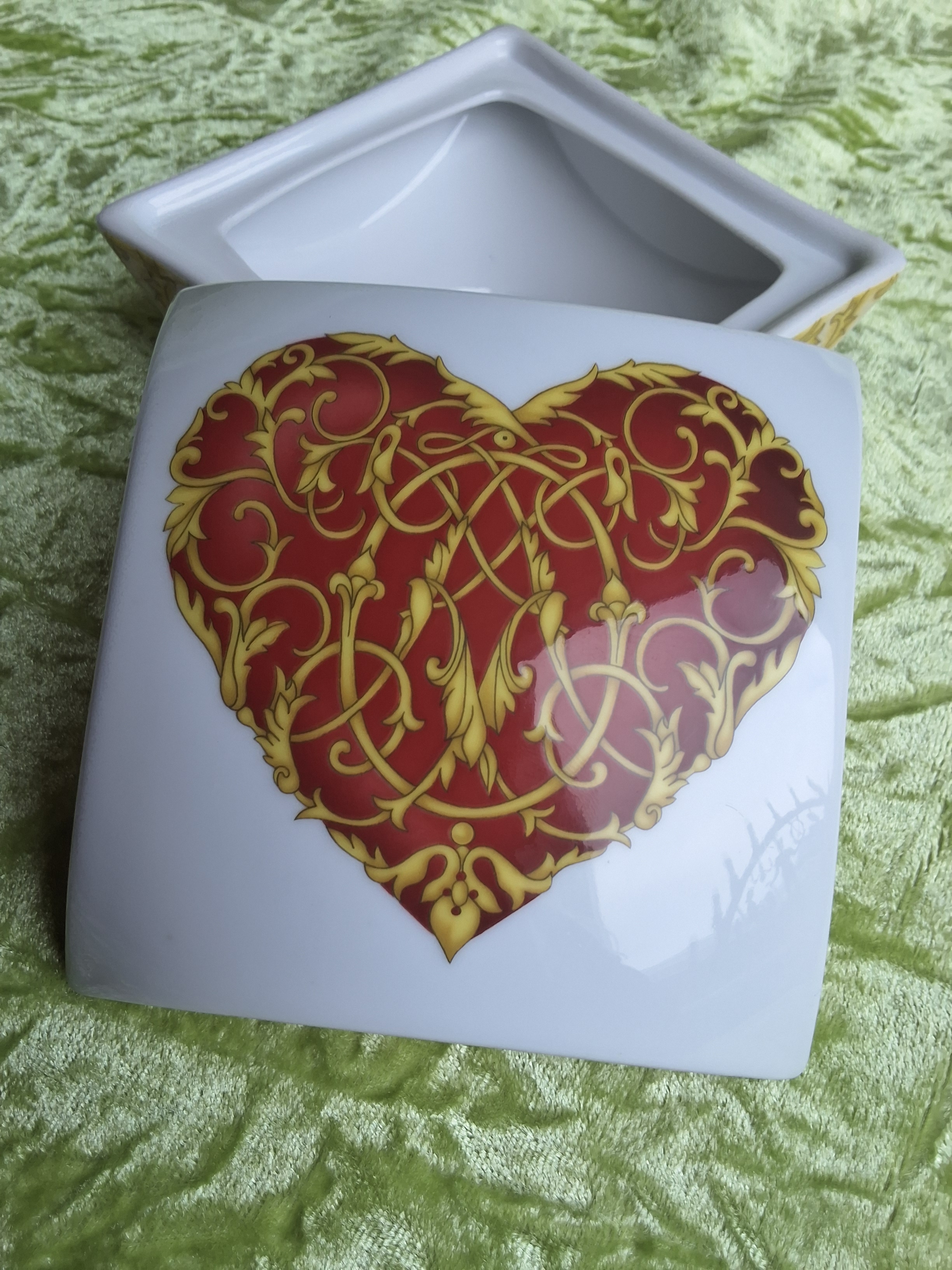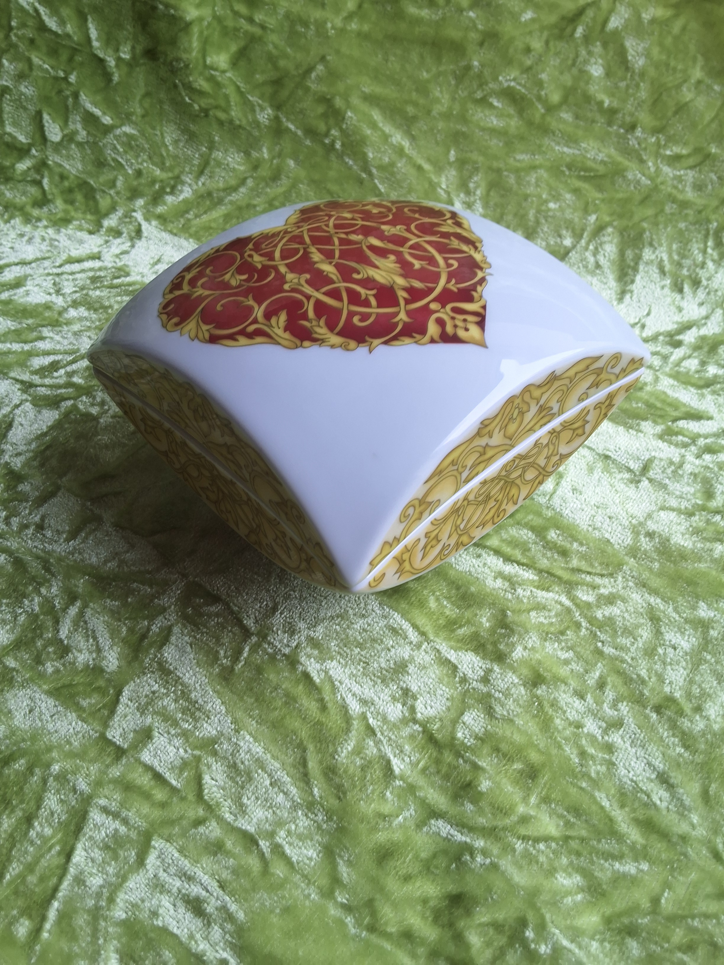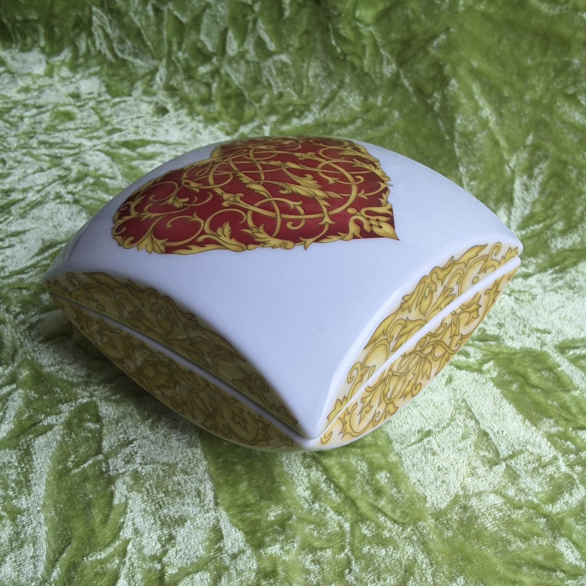 Außergewöhnlich und extravagant ist diese formschöne elegante Porzellandose von Hutschenreuther. Florentisch geschwungene Ornamente in verschiedenen Gelbnuancen verschönern die stark abgerundeten Seiten dieser quadratischen Bonbonniere.