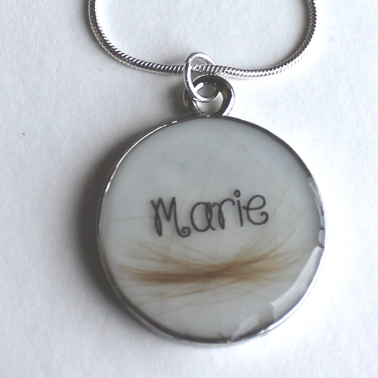 Der Kettenanhänger ist rund und hat einen Durchmesser von ca. 2,5 cm. Die feinen Haare sind lose eingeschlossen. Zusätzlich habe auch den Namen eingefügt.
