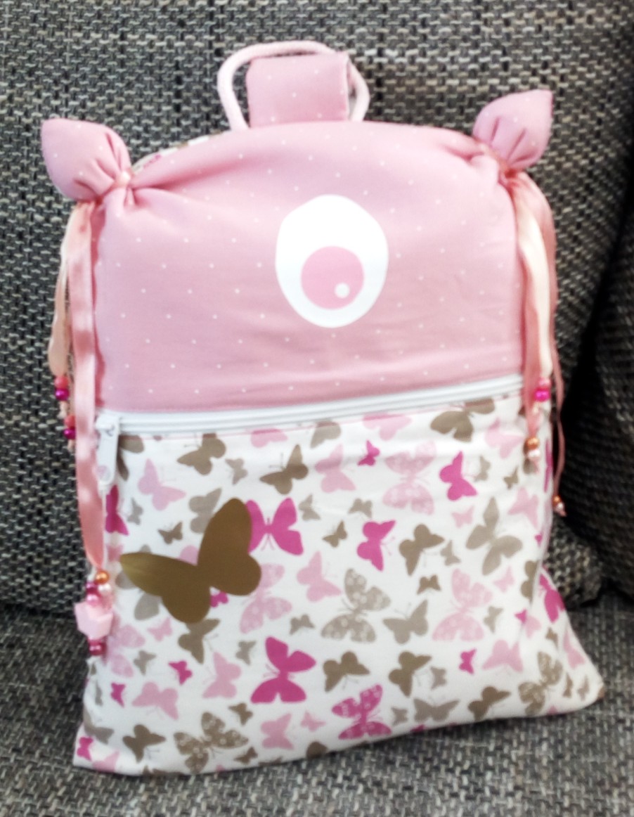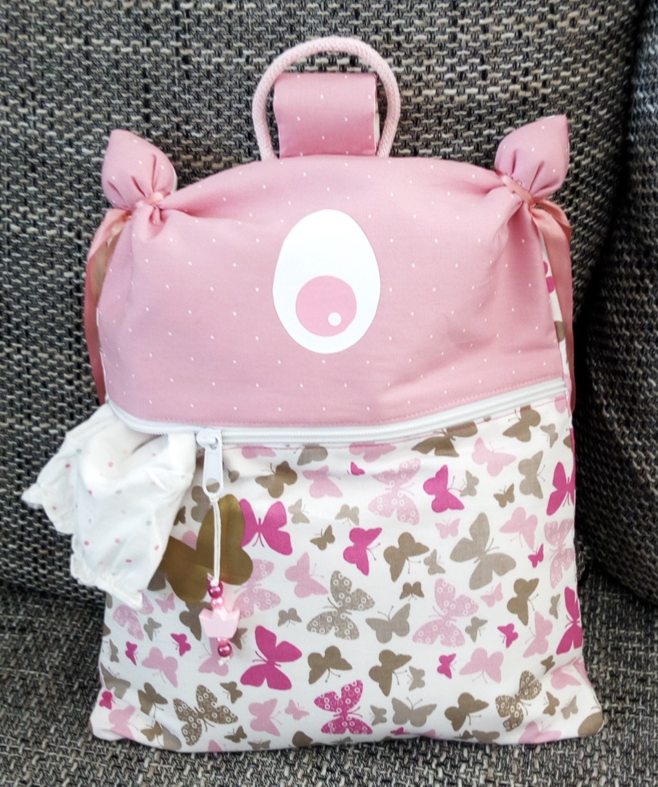 Baumwolle gefüttert mit Vlies, wahlweise mit Monsterauge. Schönes Muster für Mädels. Vorne mit Reißverschluss, daran ein Anhänger für leichteres öffnen und hinten mit Aufhänger mit Druckknopf.