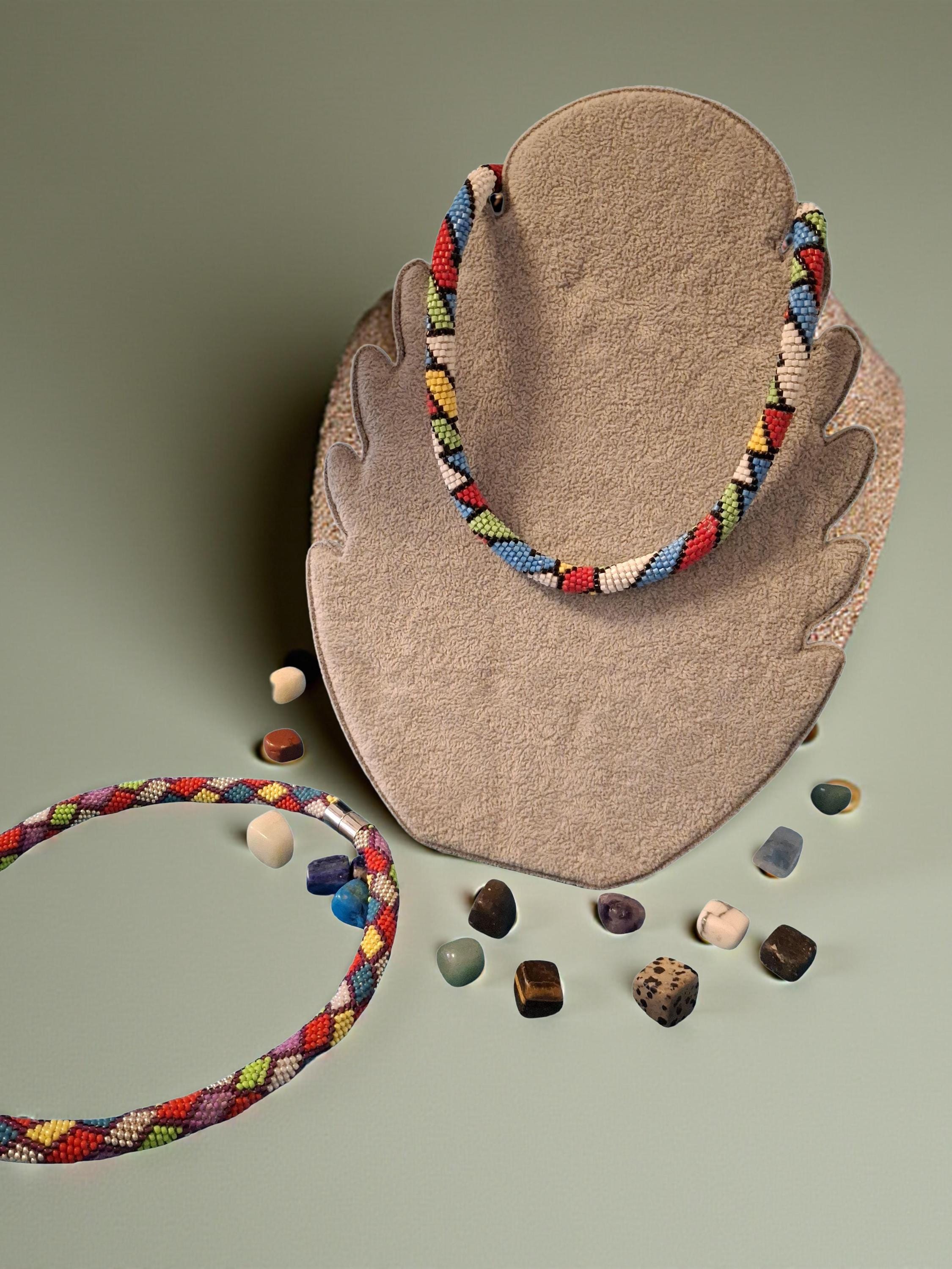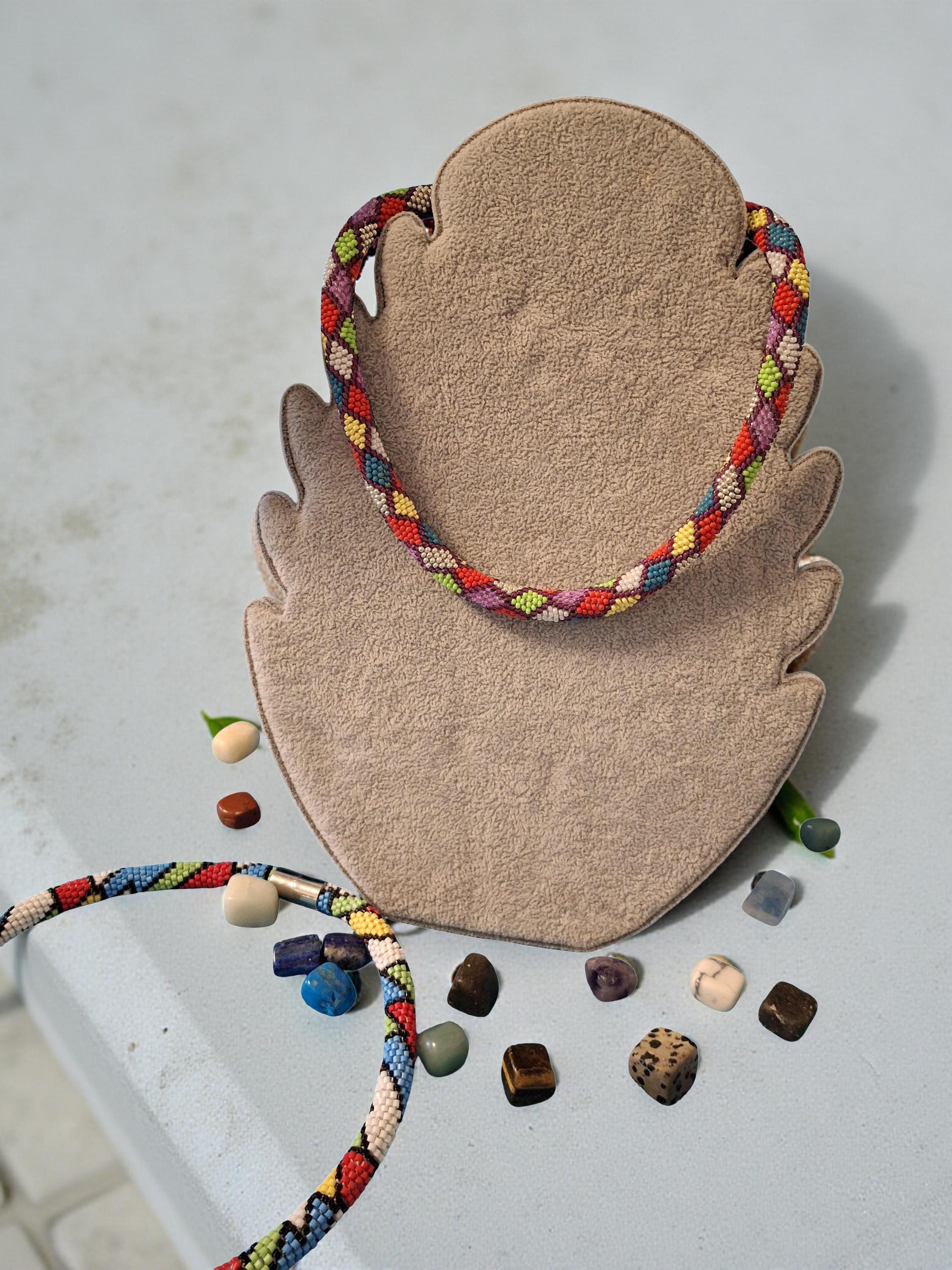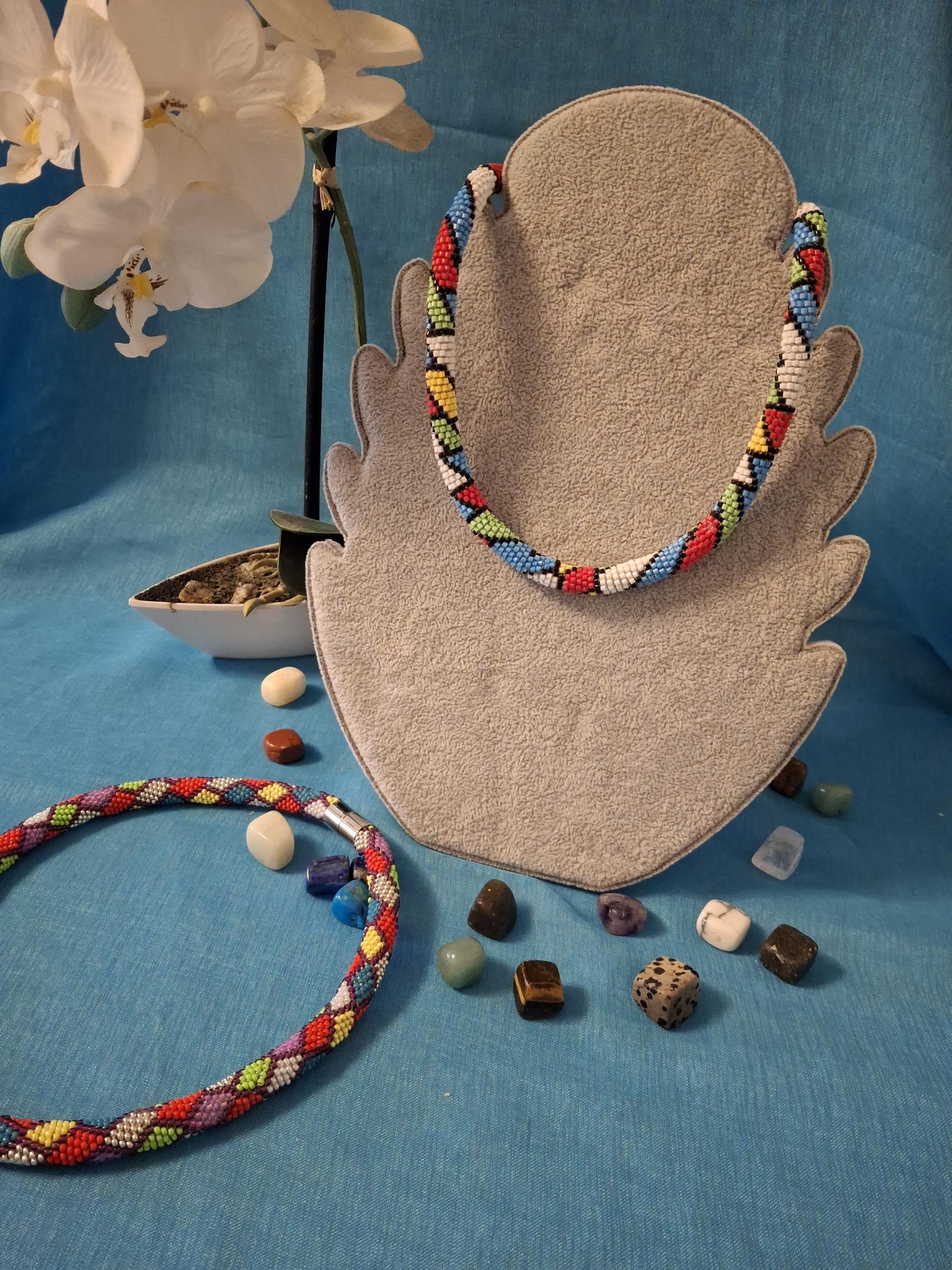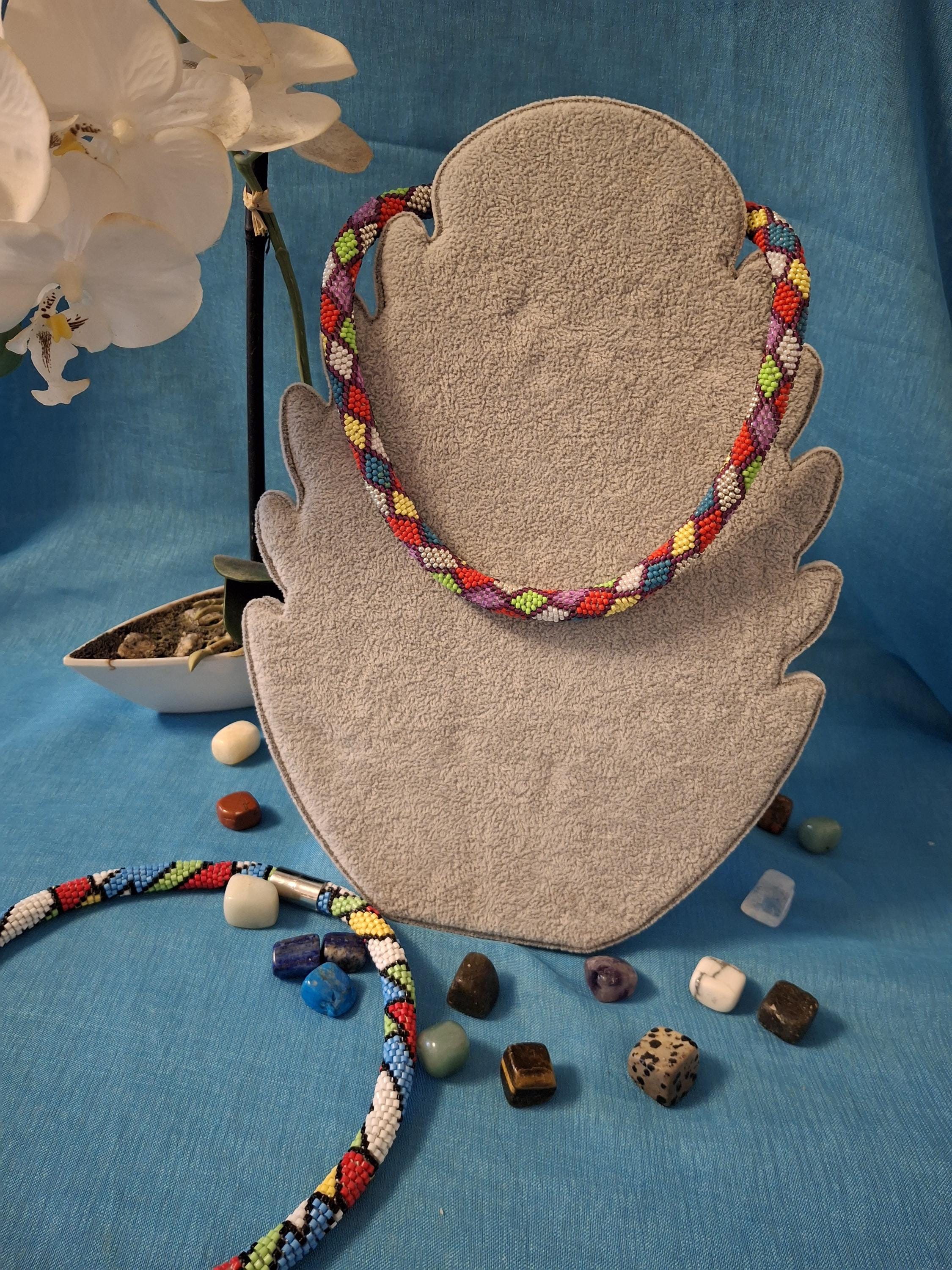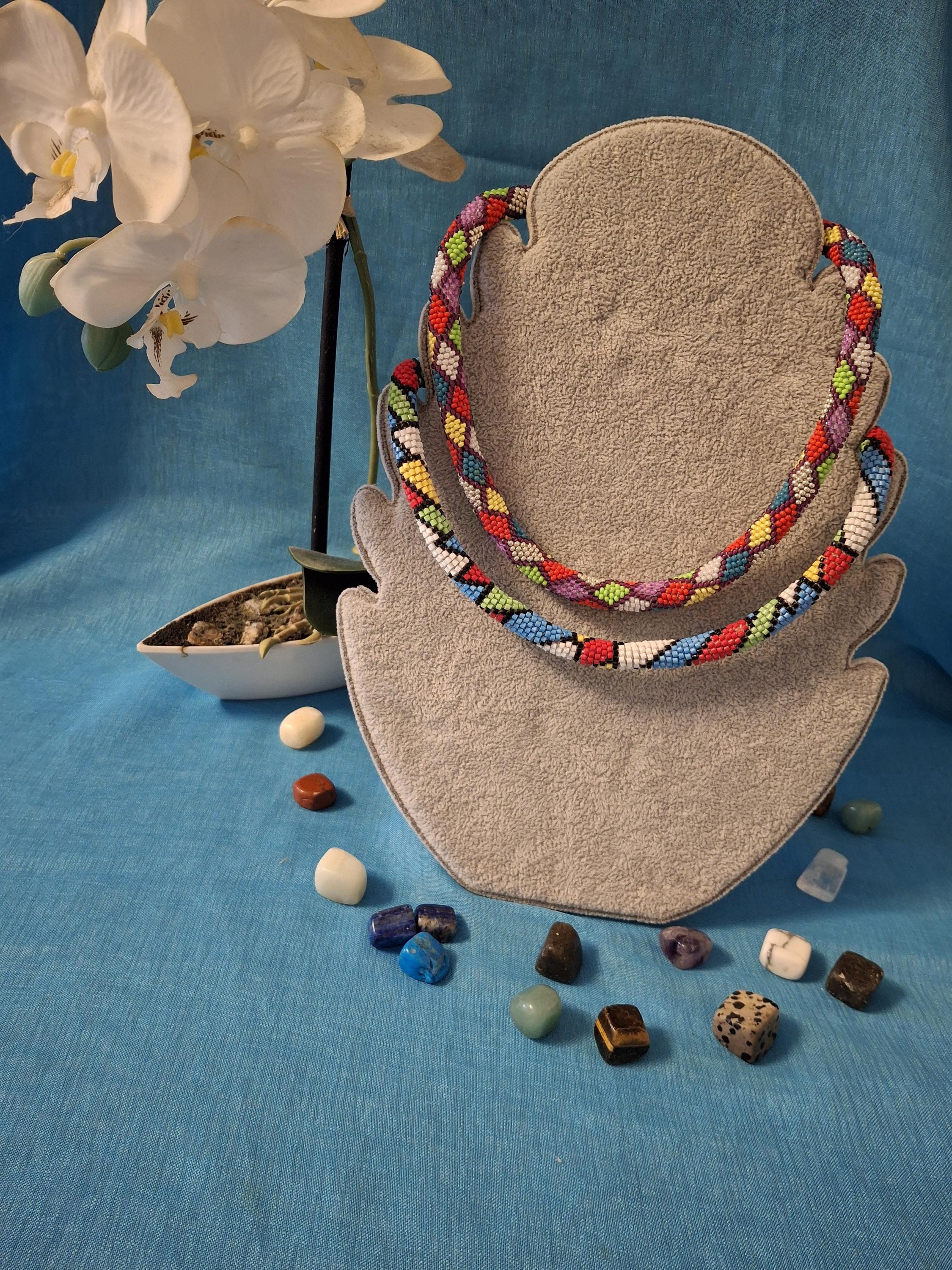 Diese einzigartige und wunderschöne handgefertigte Häkelkette verfügt über ein buntes Geo Muster.