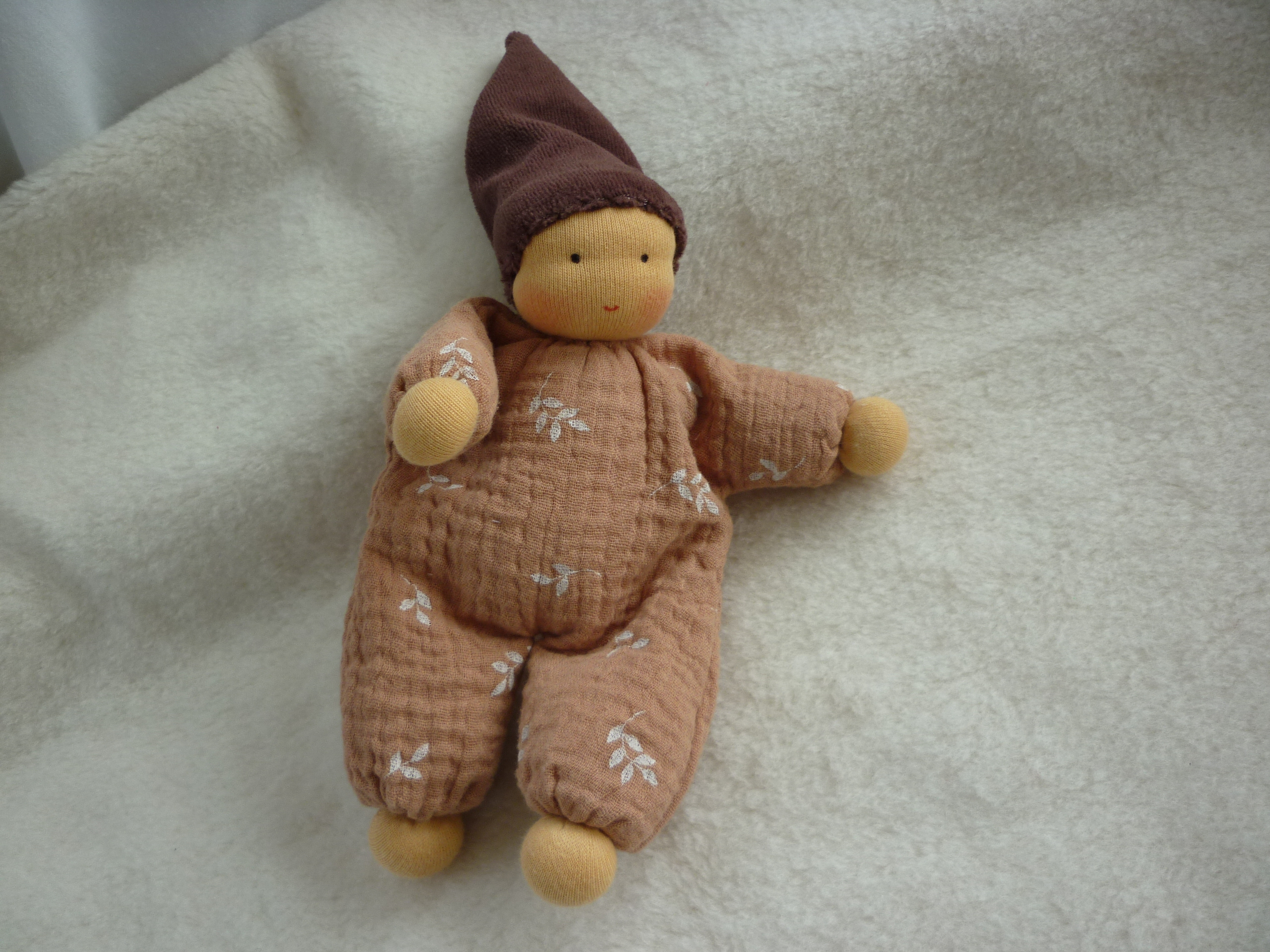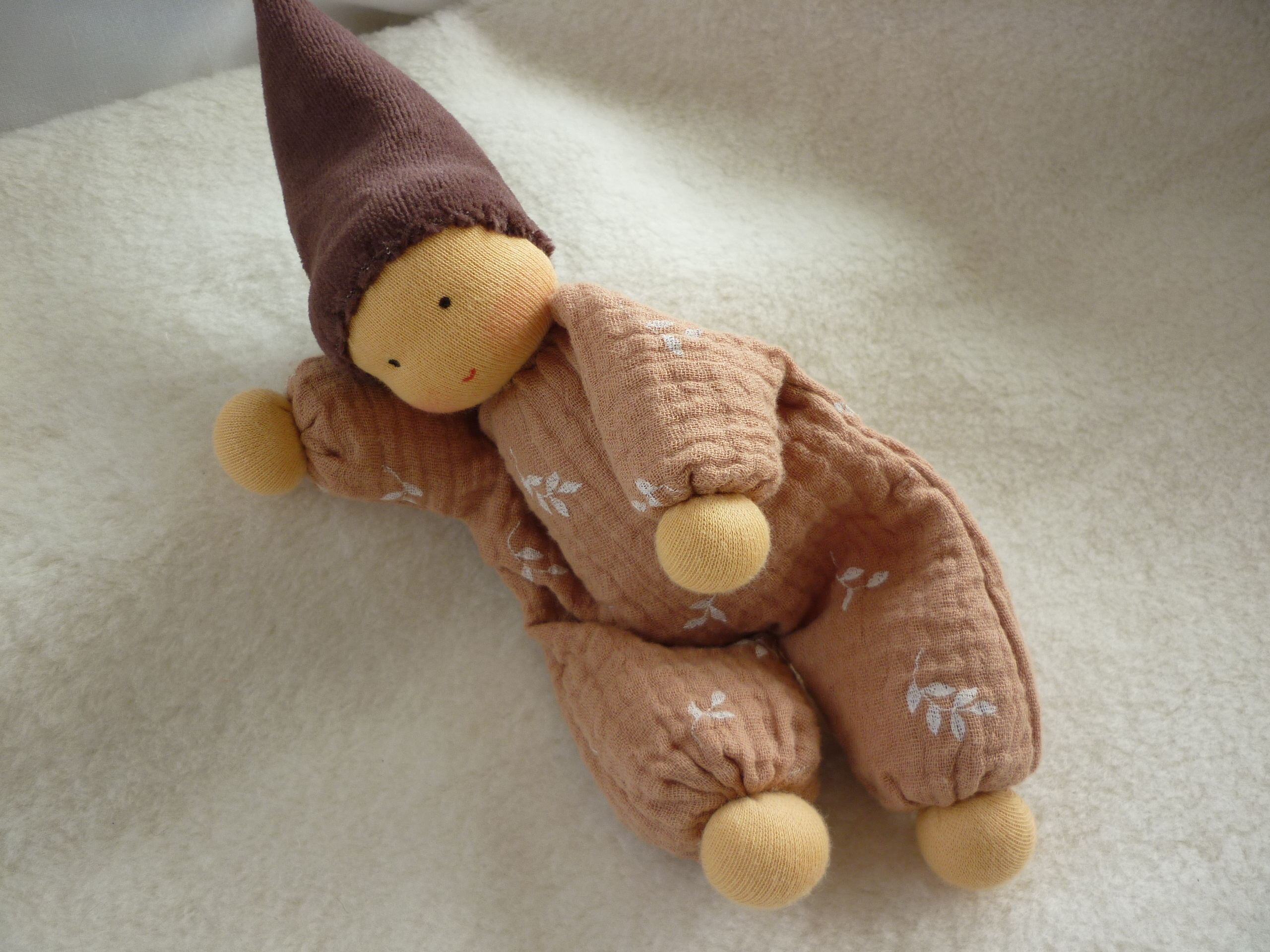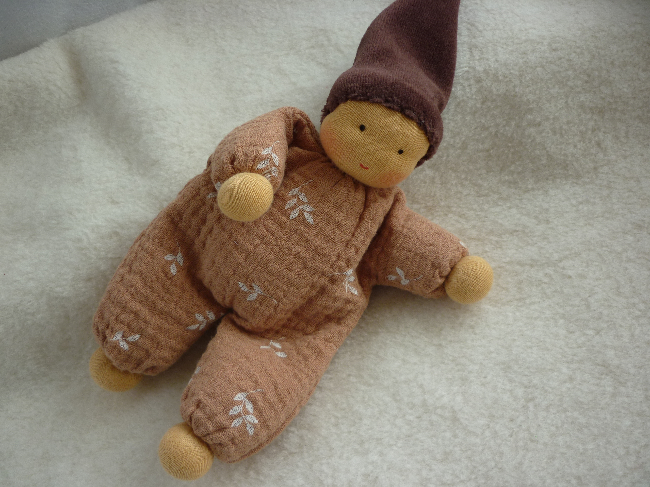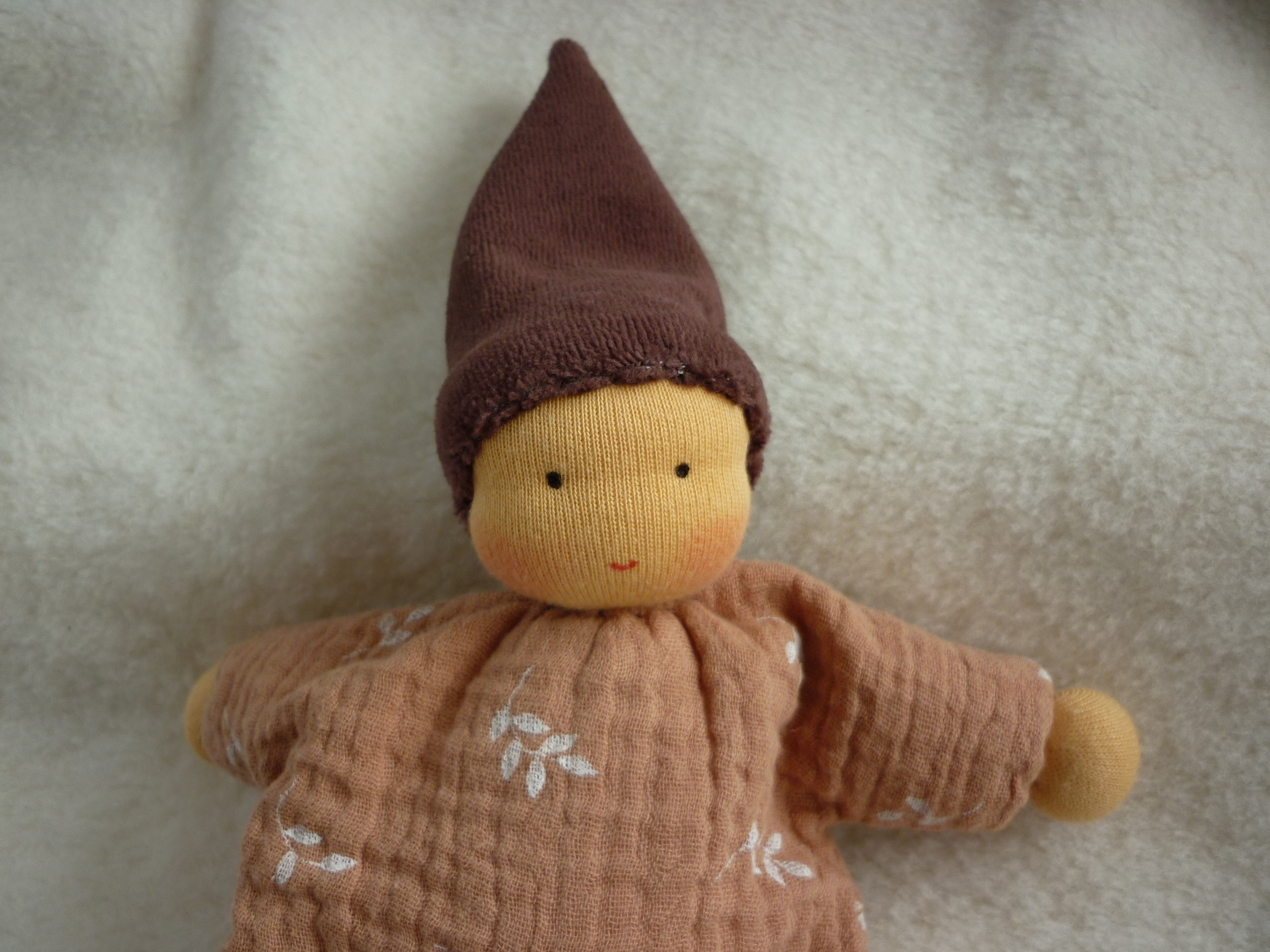 Der Körper ist aus karamellfarbenem Musselin double gauze genäht und nur der Rumpf leicht gefüllt. Weil der Musselin ein ganz zarter, leichter Stoff ist, habe ich ihn doppellagig mit einem feinen, weißen Baumwollstoff innen vernäht. Der Kopf, die Hände und Füße sind aus Schweizer Puppentrikot, mit Bio-Schafwolle gefüllt. Die braunen Augen und der  Mund sind mit wasserfester Stofffarbe aufgemalt, die braune Zipfelmütze aus Nicki ist fest an den Kopf genäht.