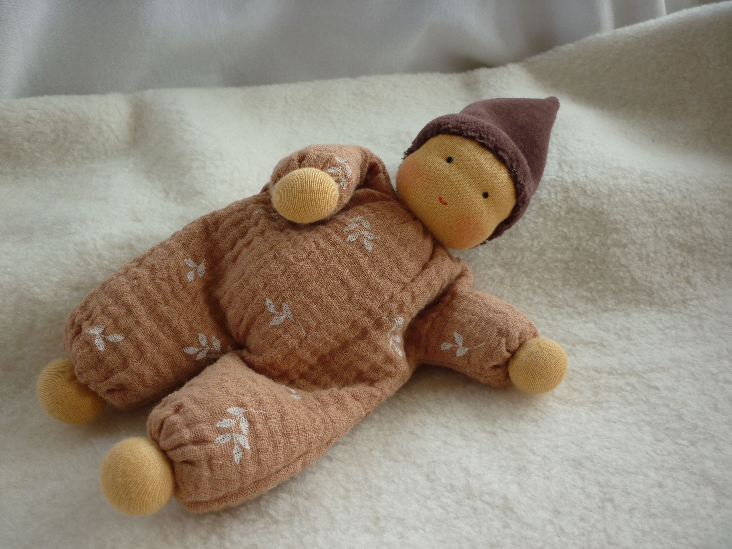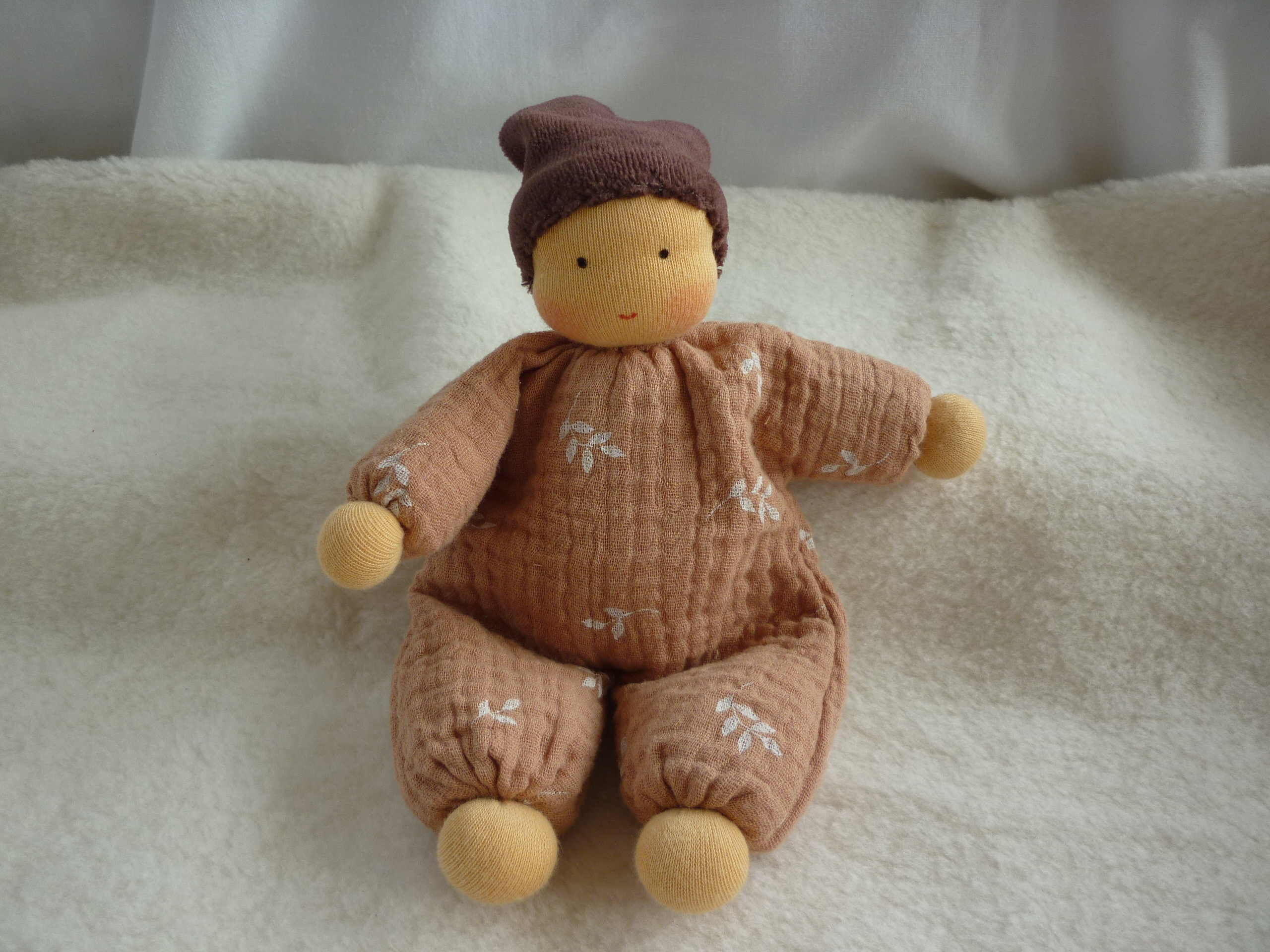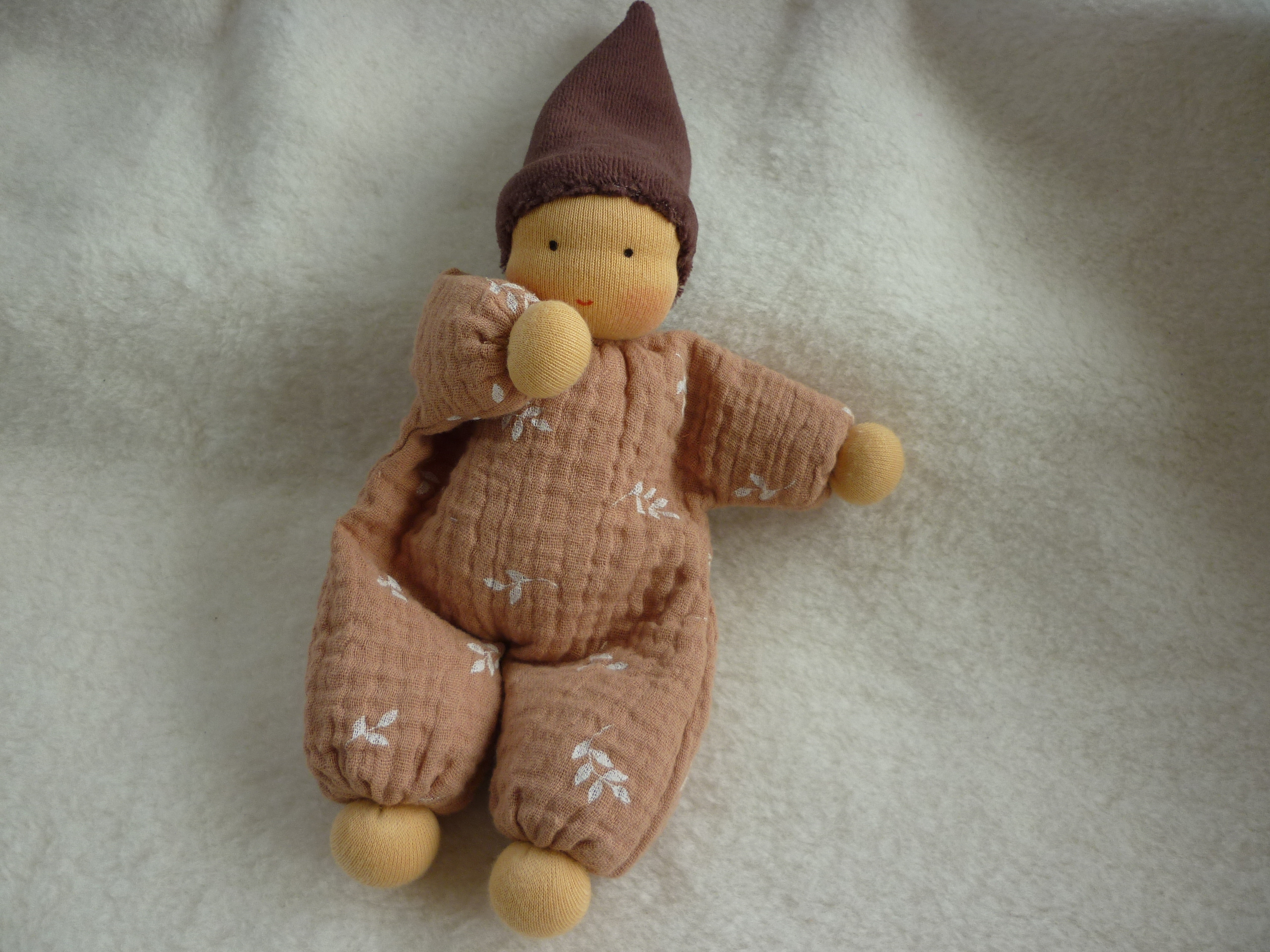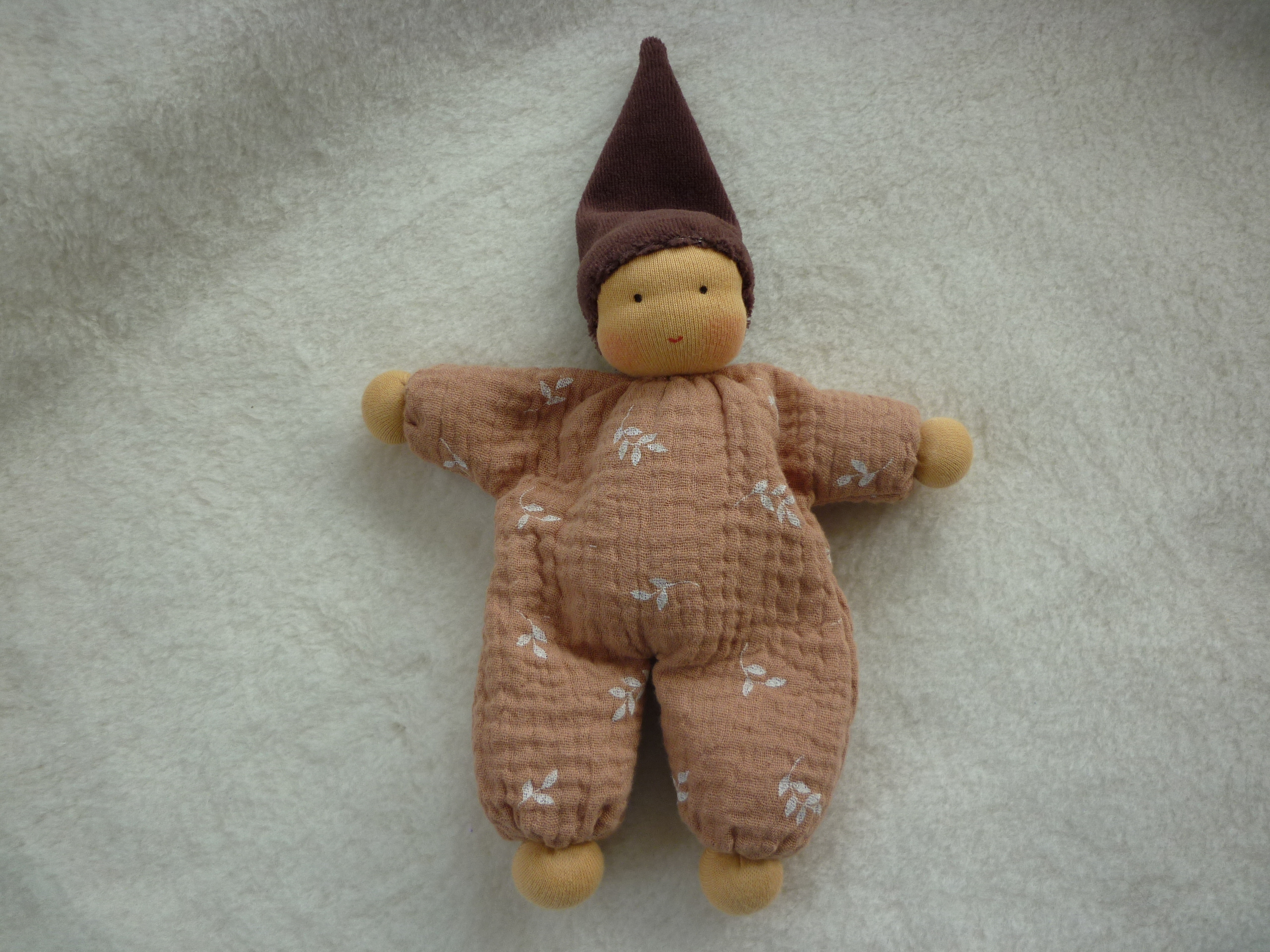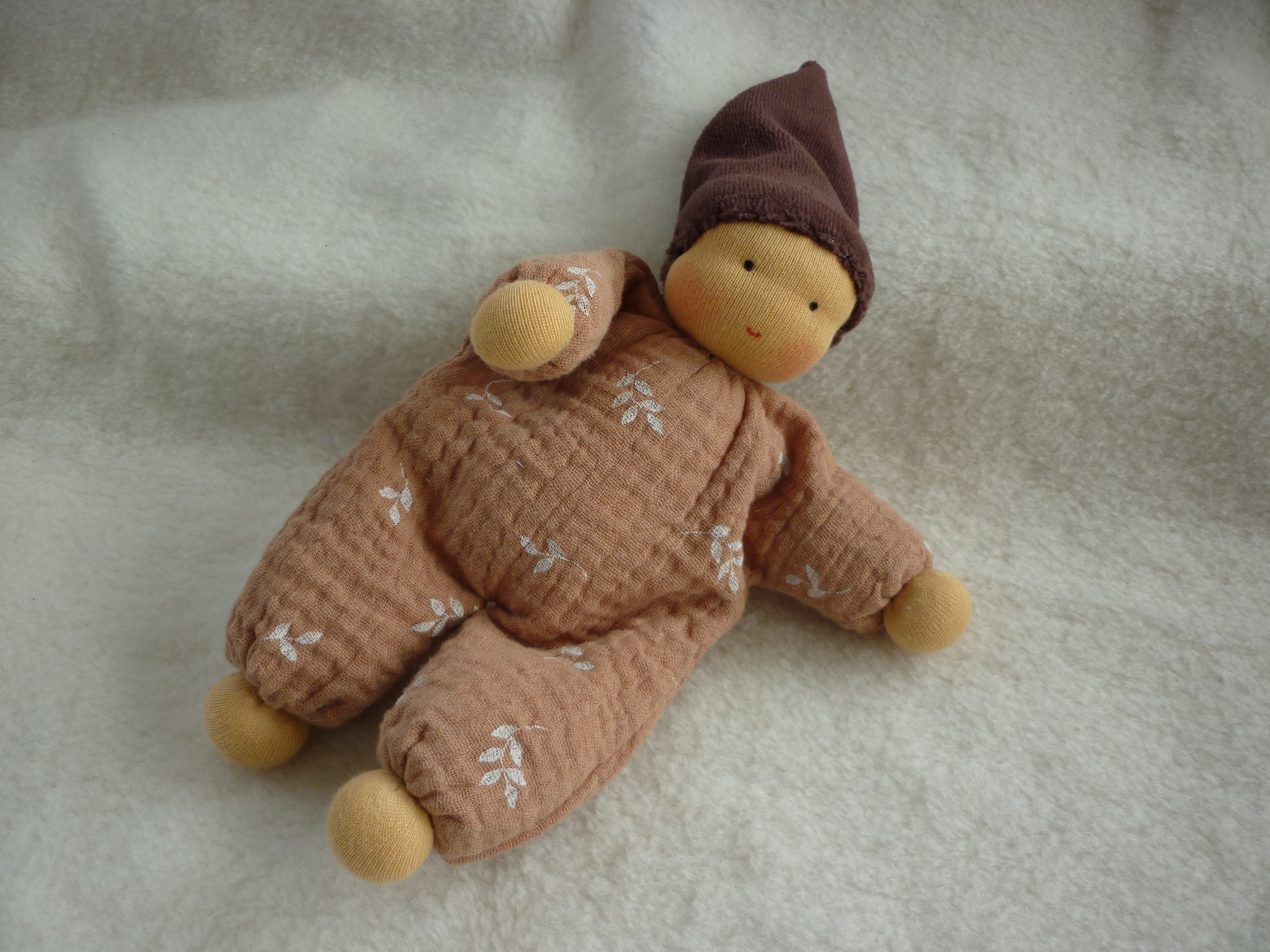 Der Körper ist aus karamellfarbenem Musselin double gauze genäht und nur der Rumpf leicht gefüllt. Weil der Musselin ein ganz zarter, leichter Stoff ist, habe ich ihn doppellagig mit einem feinen, weißen Baumwollstoff innen vernäht. Der Kopf, die Hände und Füße sind aus Schweizer Puppentrikot, mit Bio-Schafwolle gefüllt. Die braunen Augen und der  Mund sind mit wasserfester Stofffarbe aufgemalt, die braune Zipfelmütze aus Nicki ist fest an den Kopf genäht.