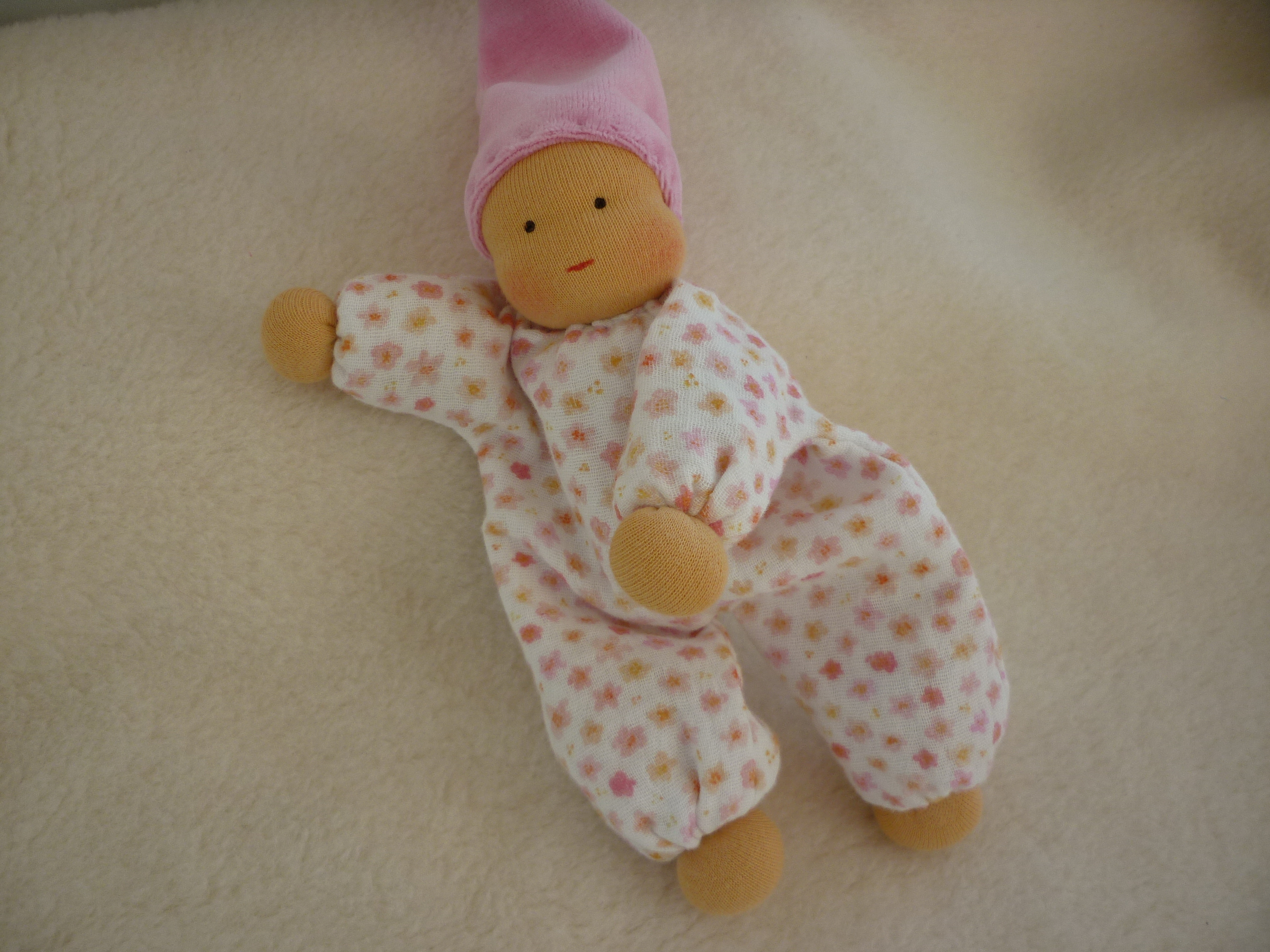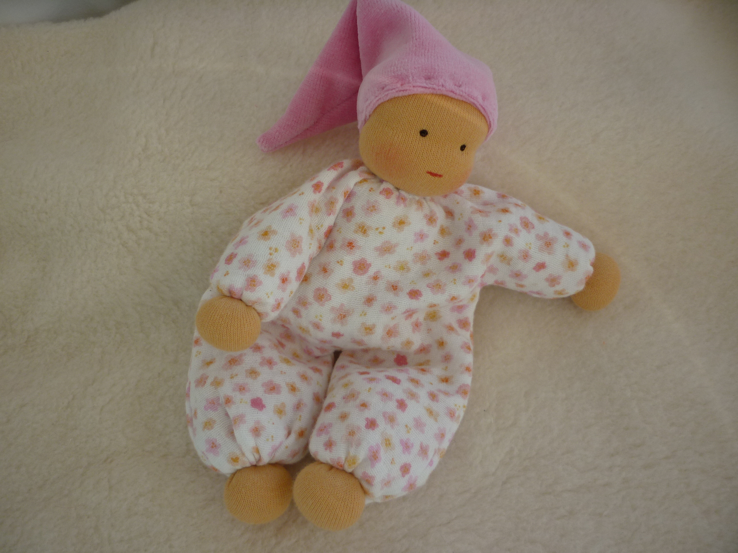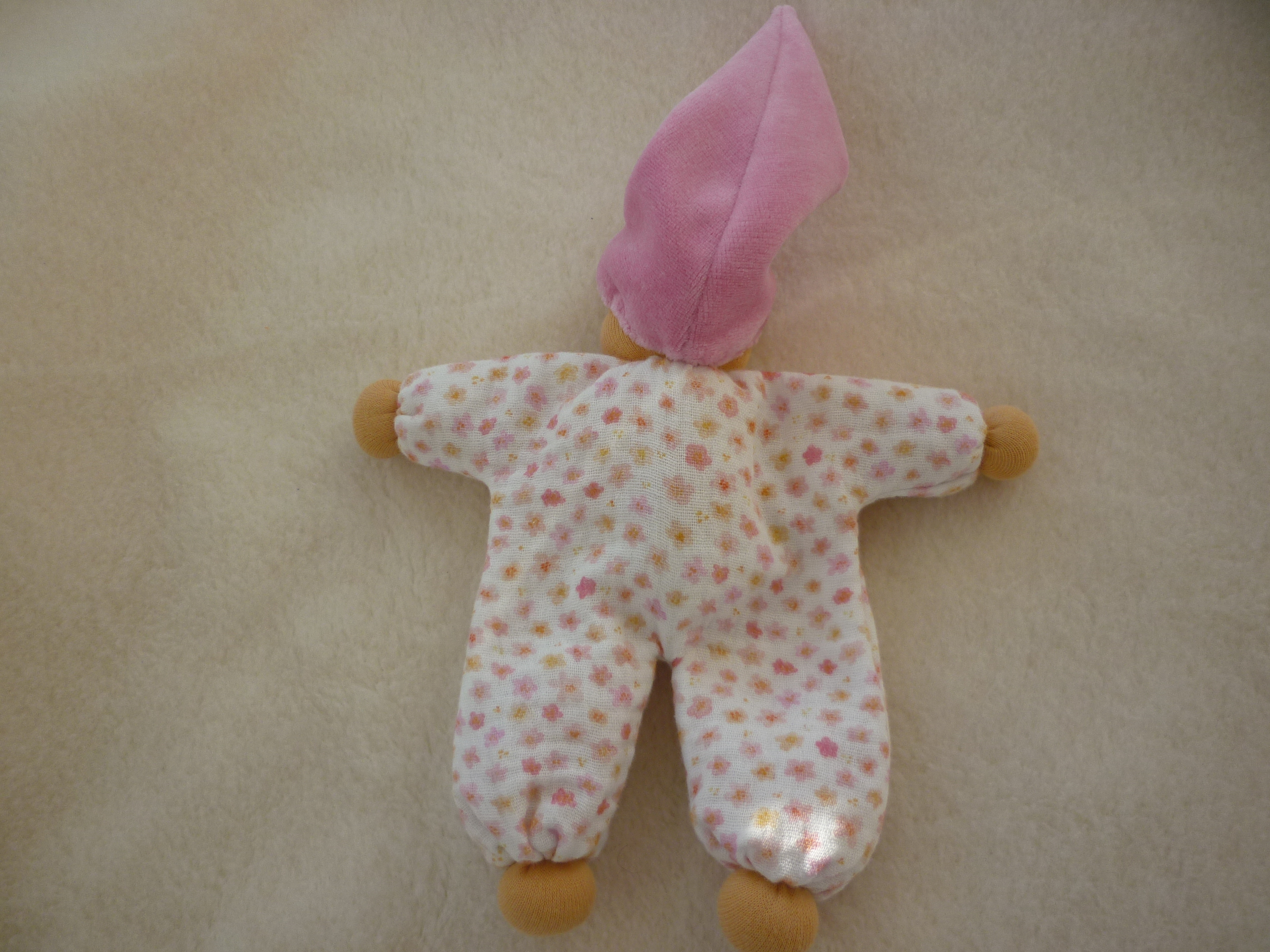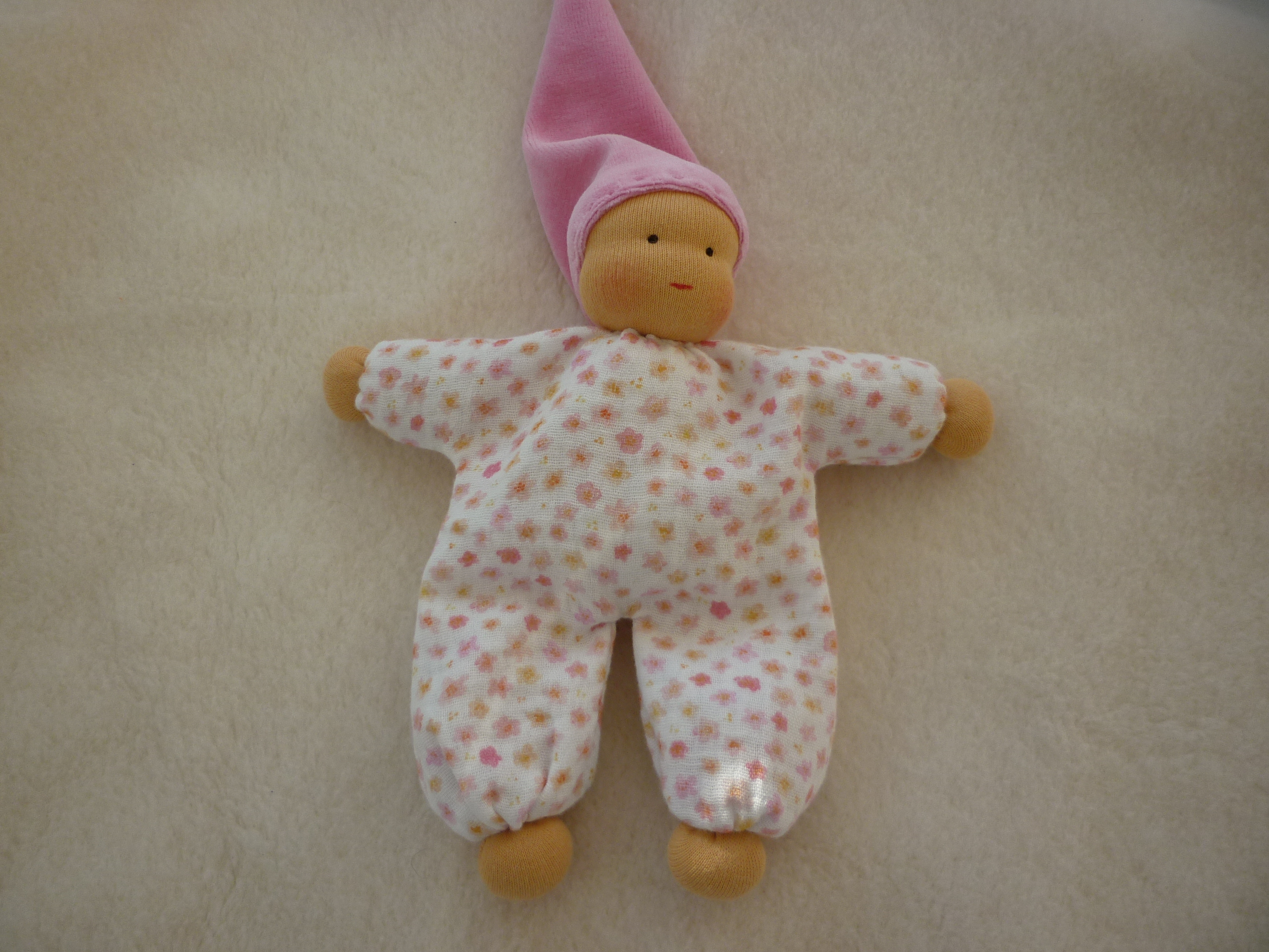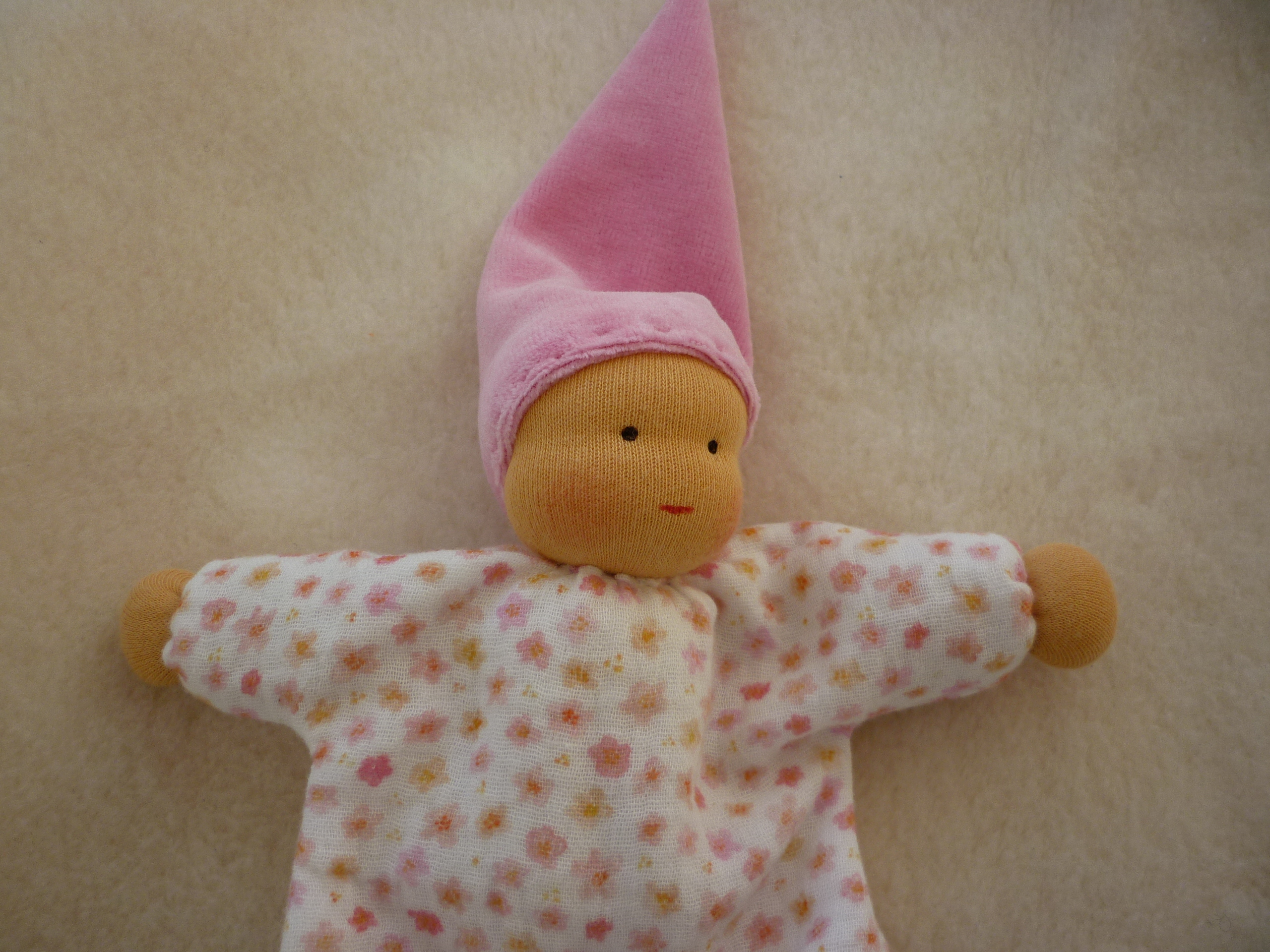 Der Körper ist aus weißem Blümchen-Musselin double gauze genäht und nur der Rumpf und die Gliedmaßen leicht gefüllt. Weil der Musselin ein ganz zarter, leichter Stoff ist, habe ich ihn doppellagig mit einem feinen, weißen Baumwollstoff vernäht. Der Kopf, die Hände und Füße sind aus Schweizer Puppentrikot, mit Bio-Schafwolle gefüllt. Die braunen Augen und der Mund sind mit wasserfester Stofffarbe aufgemalt, die Zipfelmütze aus Nicki ist fest an den Kopf genäht.