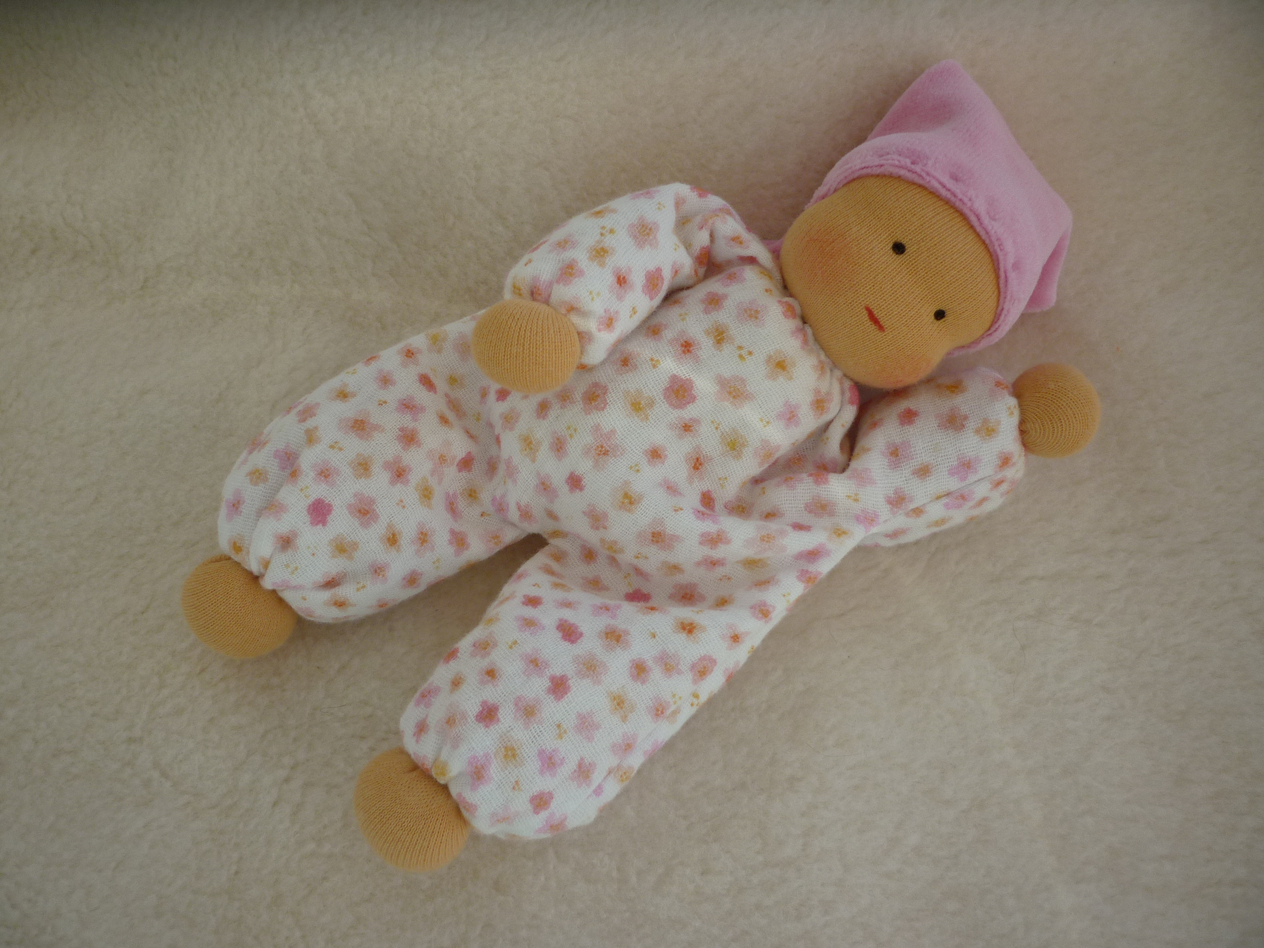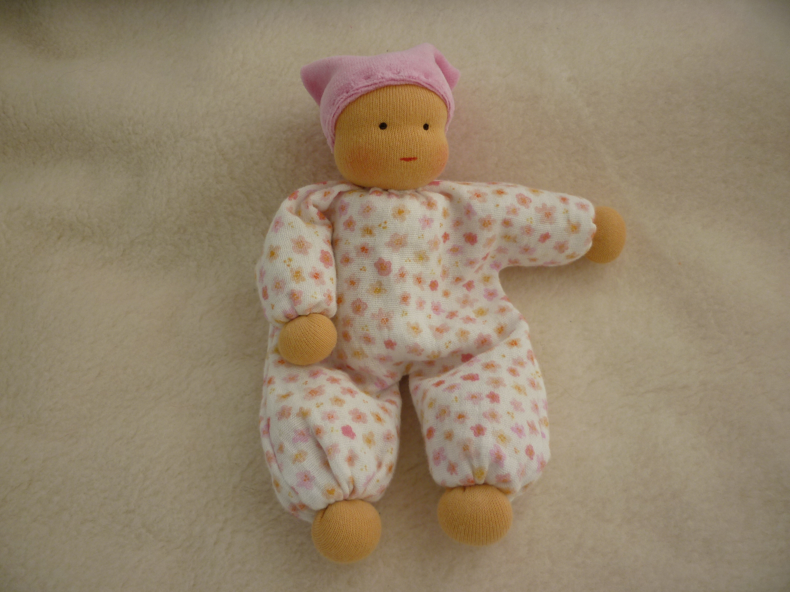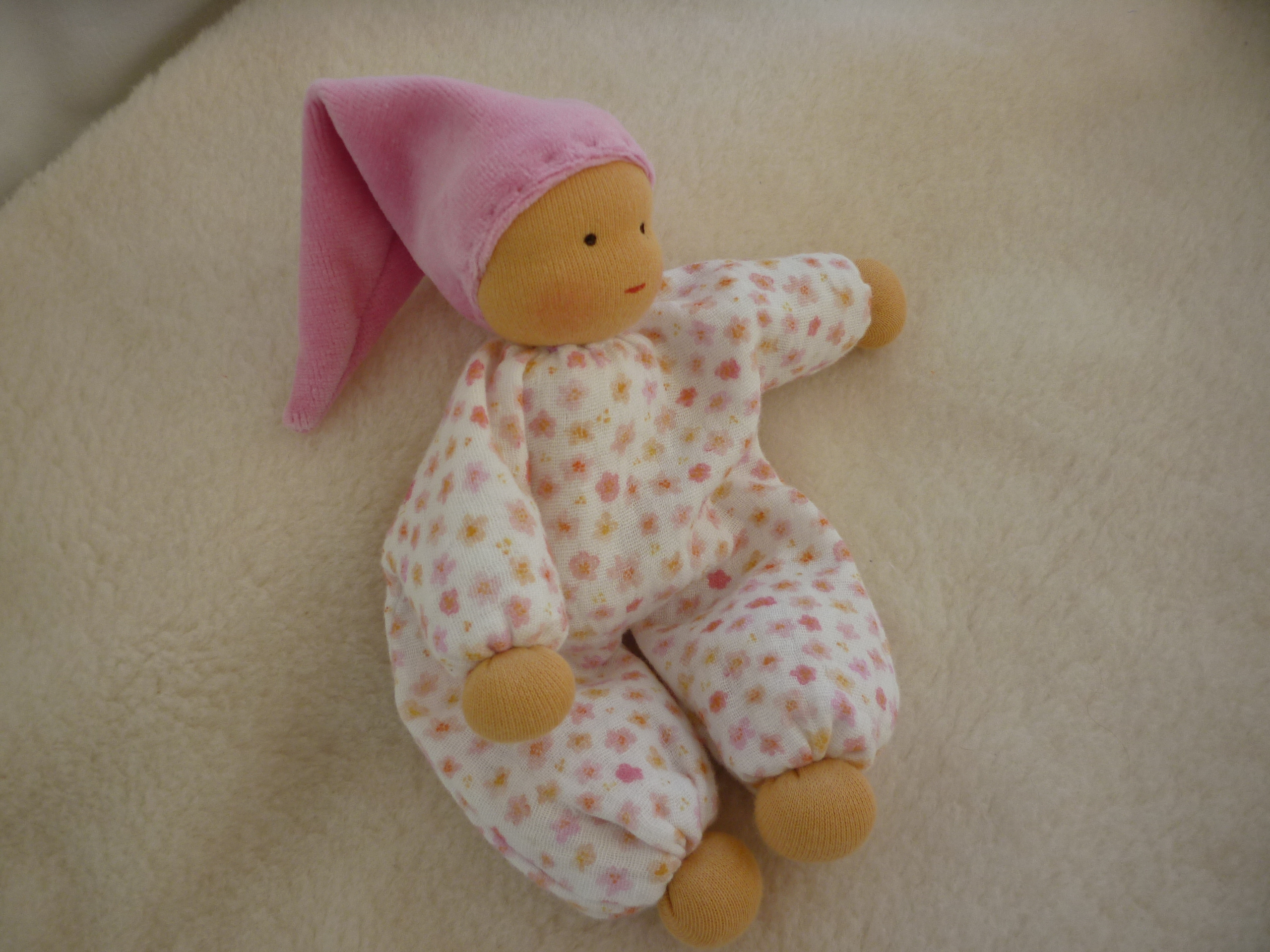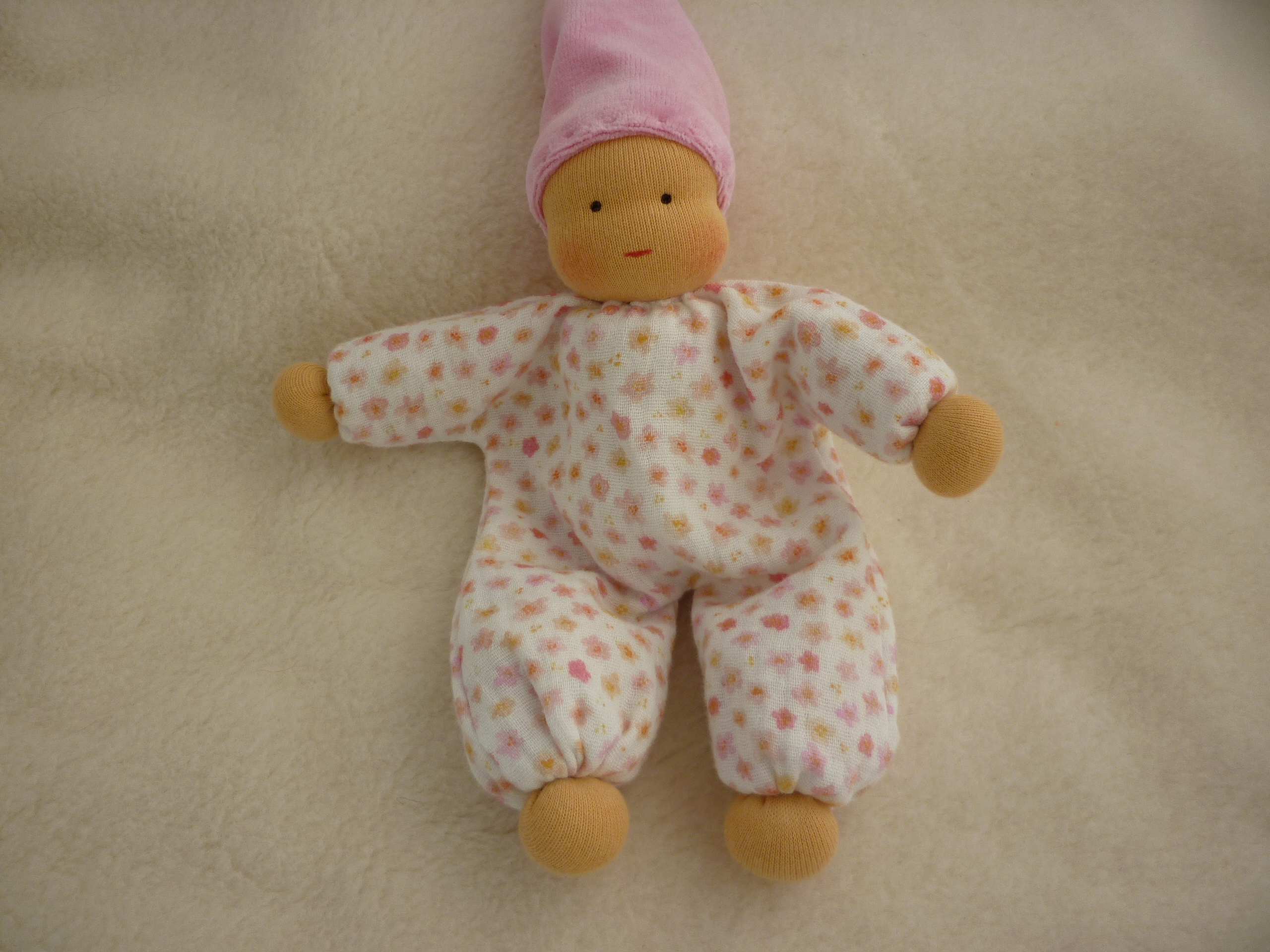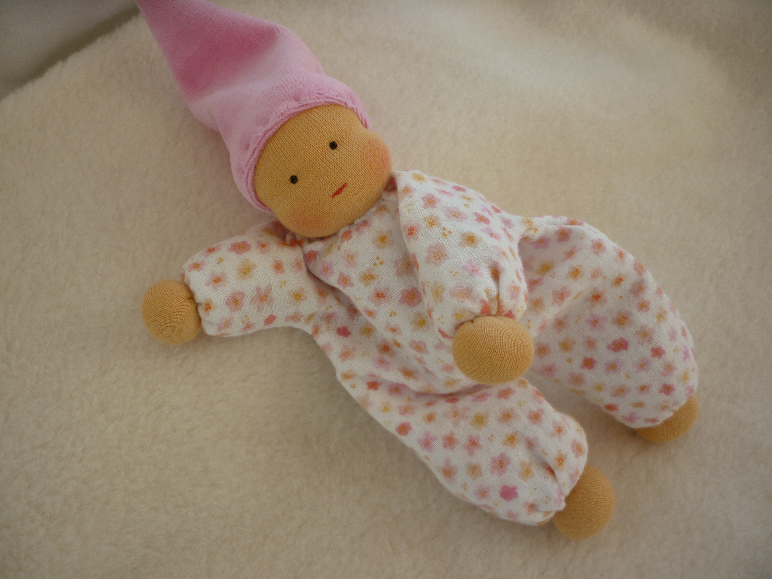 Der Körper ist aus weißem Blümchen-Musselin double gauze genäht und nur der Rumpf und die Gliedmaßen leicht gefüllt. Weil der Musselin ein ganz zarter, leichter Stoff ist, habe ich ihn doppellagig mit einem feinen, weißen Baumwollstoff vernäht. Der Kopf, die Hände und Füße sind aus Schweizer Puppentrikot, mit Bio-Schafwolle gefüllt. Die braunen Augen und der Mund sind mit wasserfester Stofffarbe aufgemalt, die Zipfelmütze aus Nicki ist fest an den Kopf genäht.