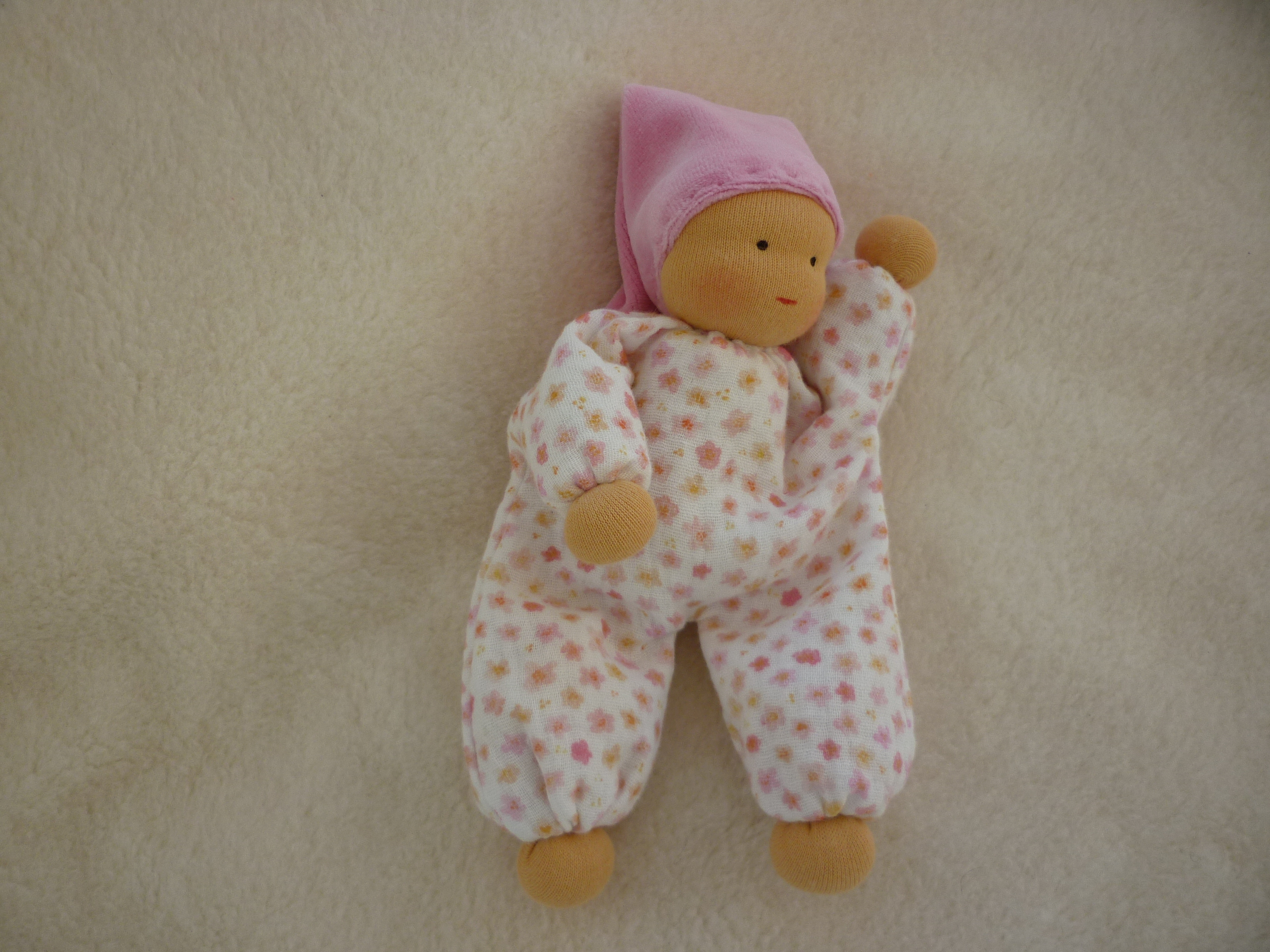 Das Püppchen ist 19 cm lang, mit Mütze 28 cm, und von Hand zu Hand 18 cm breit.