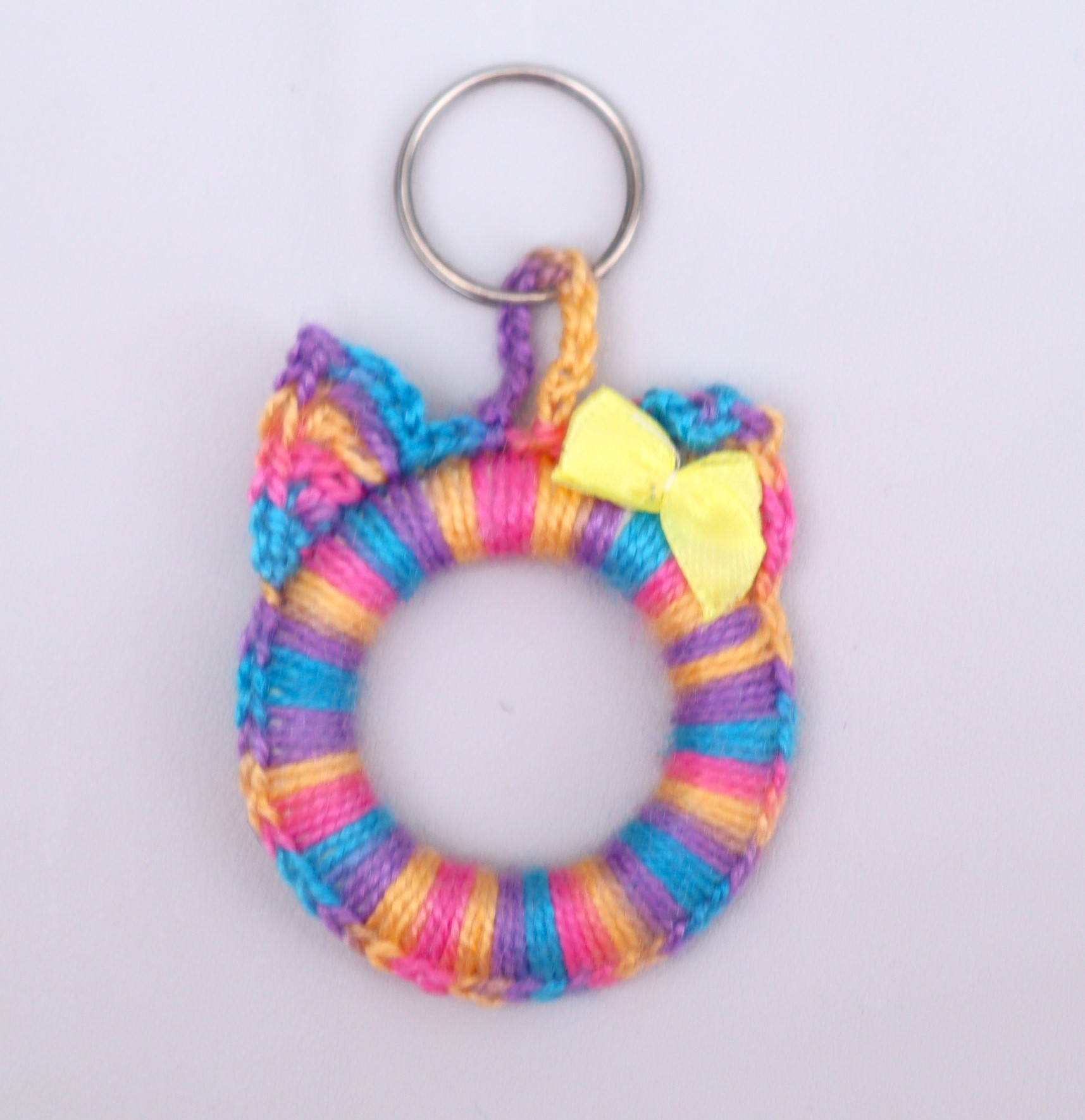 Zuckersüßer Schlüsselanhänger in Form eines Katzenkopfes , gehäkelt aus einem hübschen bunten Garn. Ein Öhrchen habe ich mit einer hübschen Satinschleife verziert.Sie können diesen Anhänger auch sehr gut als Taschenbaumler verwenden oder mit Hilfe eines zarten Bandes auch als Fensterschmuck einsetzen.Jeder Katzenliebhaber/in wird sich auch bestimmt über so ein süßes Geschenk freuen.Es gibt also viele Einsatzmöglichkeiten für diesen Katzenkopfanhänger.