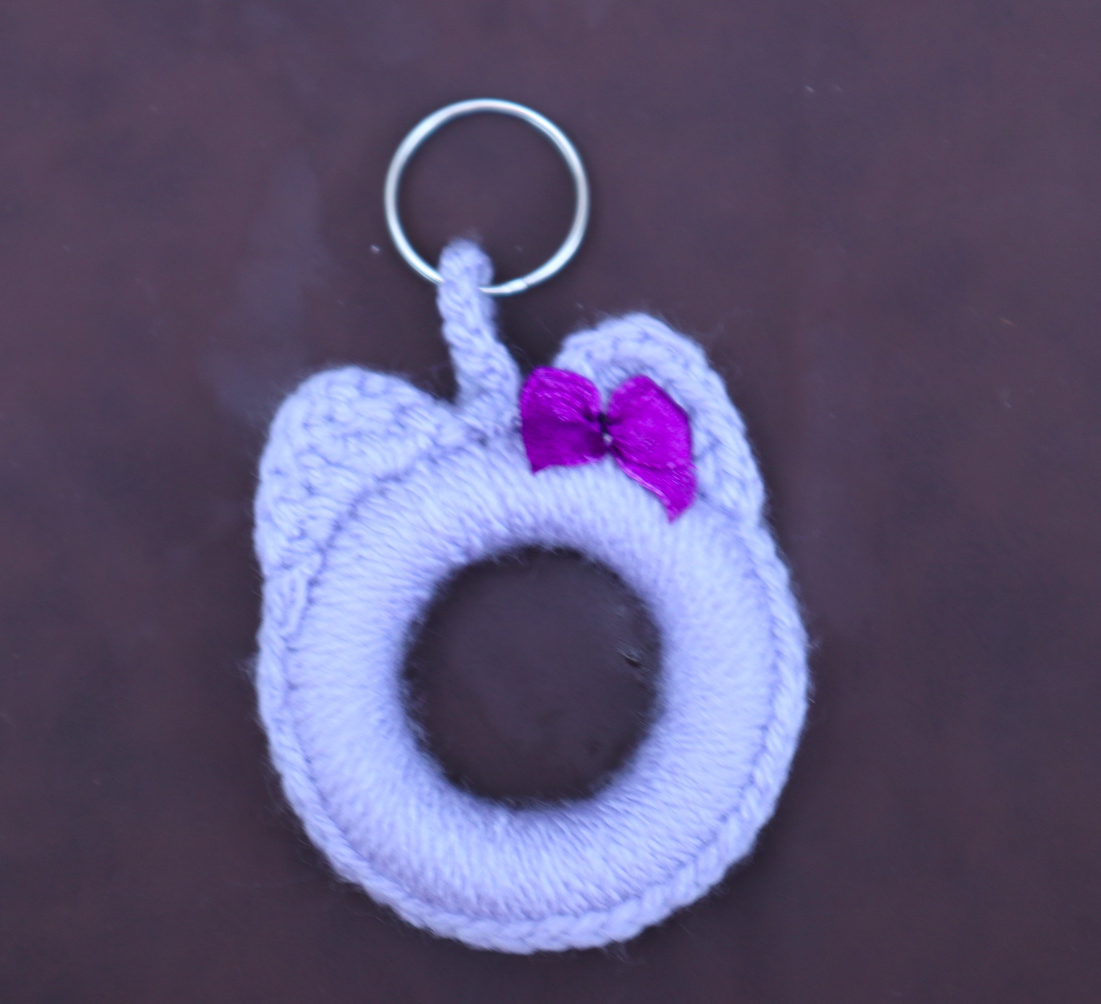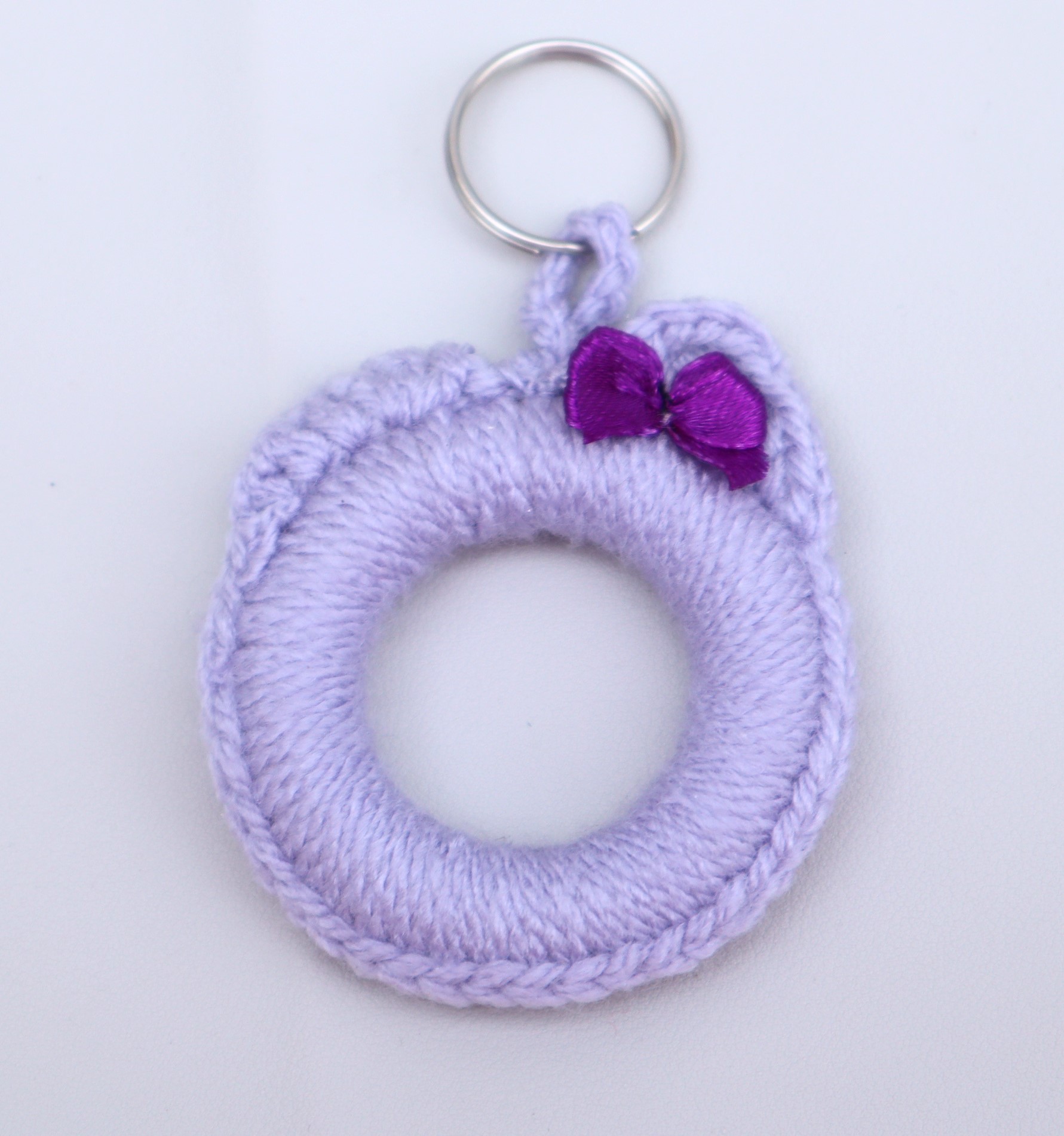 Zuckersüßer Schlüsselanhänger in Form eines Katzenkopfes , gehäkelt aus hübschen lilafarbigen Garnen. Ein Öhrchen habe ich mit einer hübschen Satinschleife verziert.