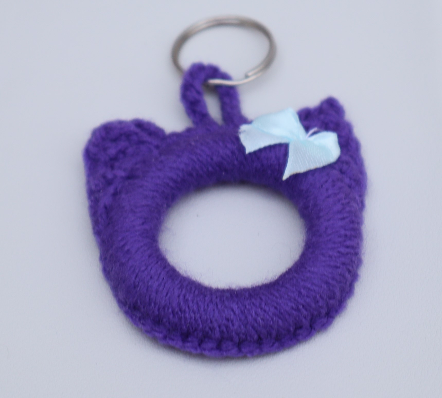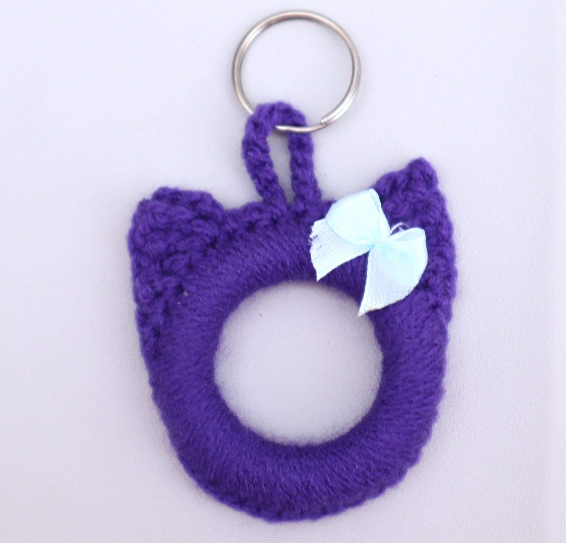 Zuckersüßer Schlüsselanhänger in Form eines Katzenkopfes , gehäkelt aus hübschen lilafarbigen Garnen. Ein Öhrchen habe ich mit einer hübschen Satinschleife verziert.