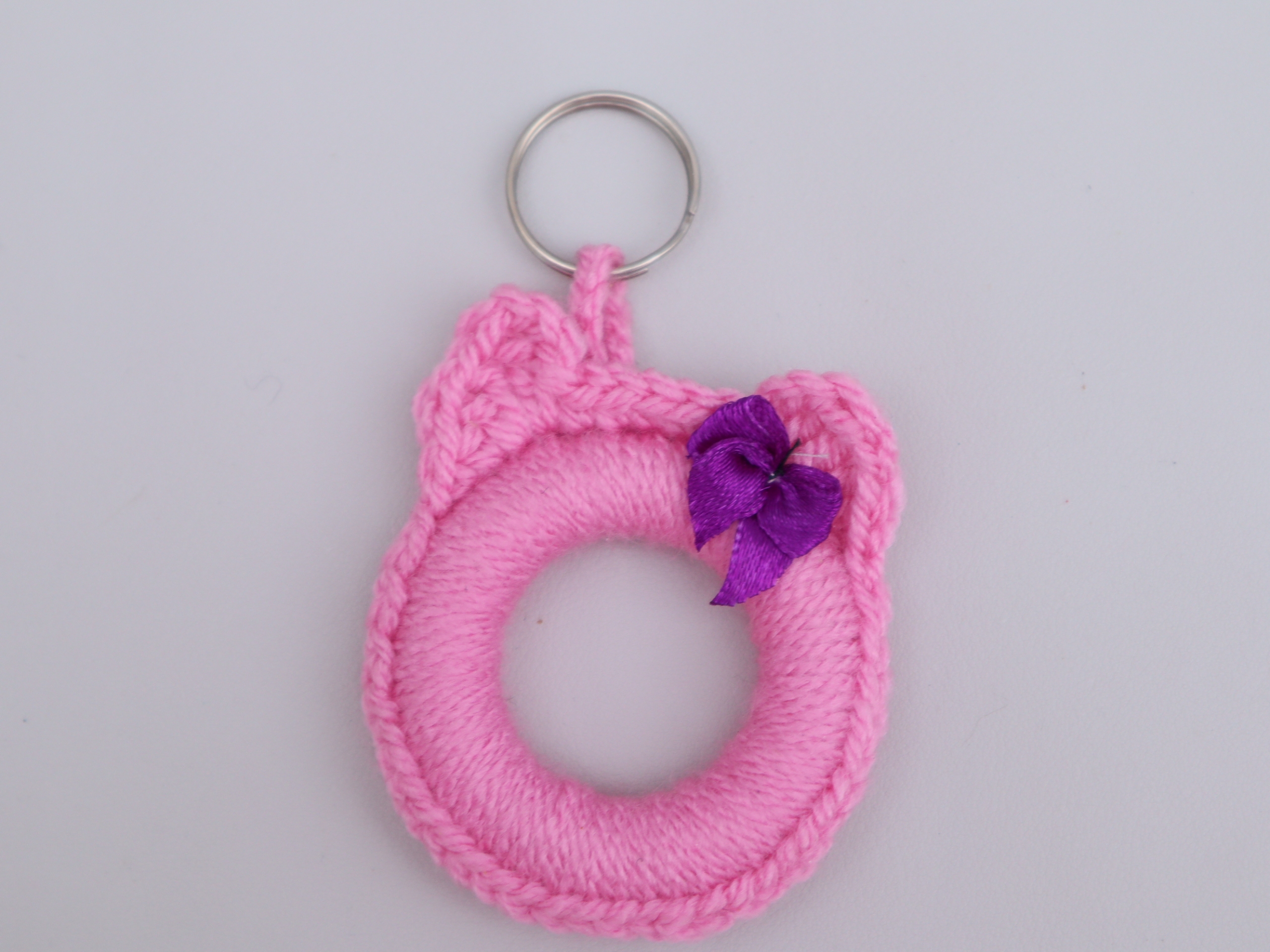 Zuckersüßer Schlüsselanhänger in Form eines Katzenkopfes , gehäkelt aus einem hübschen rosa Garn. Ein Öhrchen habe ich mit einer hübschen Satinschleife verziert.