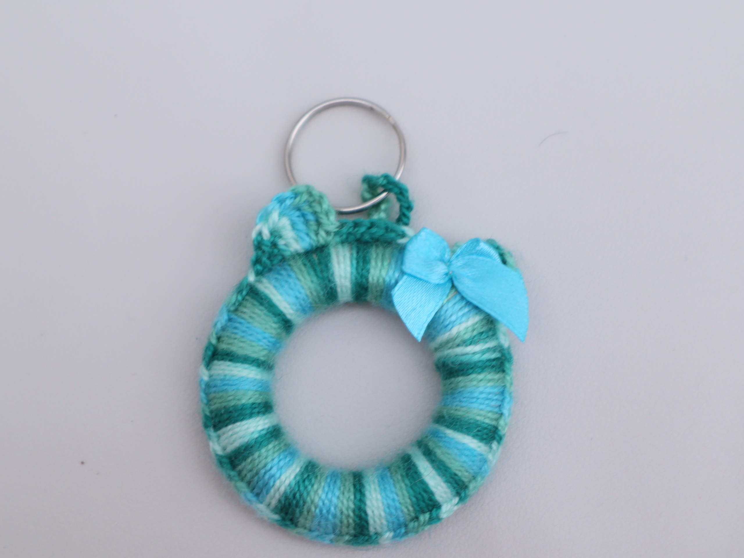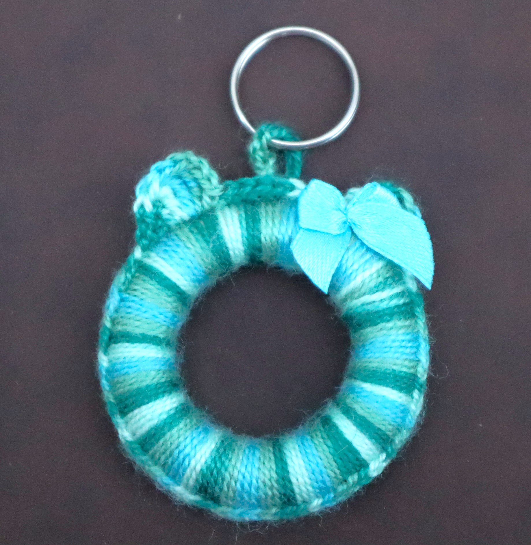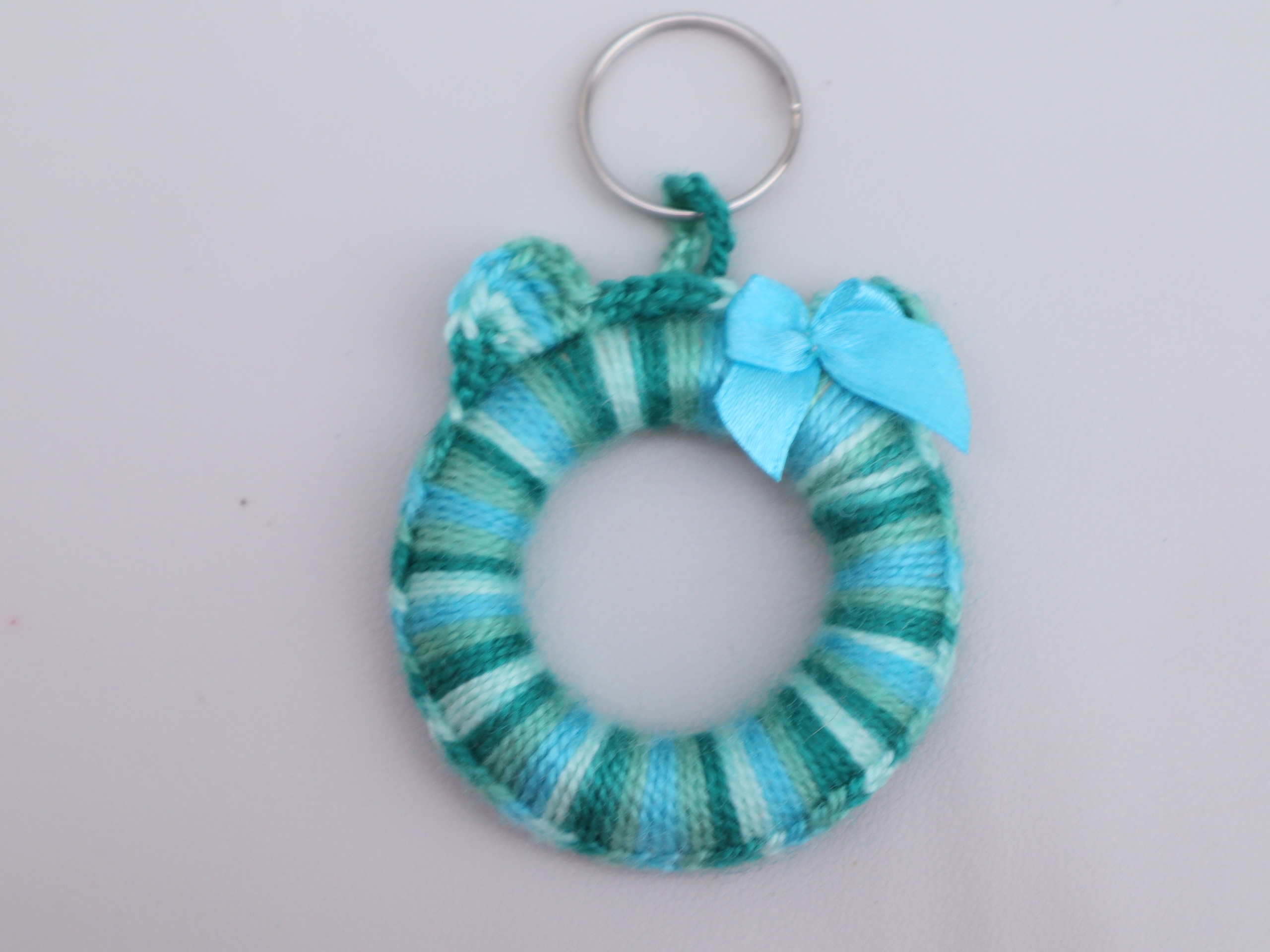 Zuckersüßer Schlüsselanhänger in Form eines Katzenkopfes , gehäkelt aus einem hübschen türkisen Garn. Ein Öhrchen habe ich mit einer hübschen Satinschleife verziert.