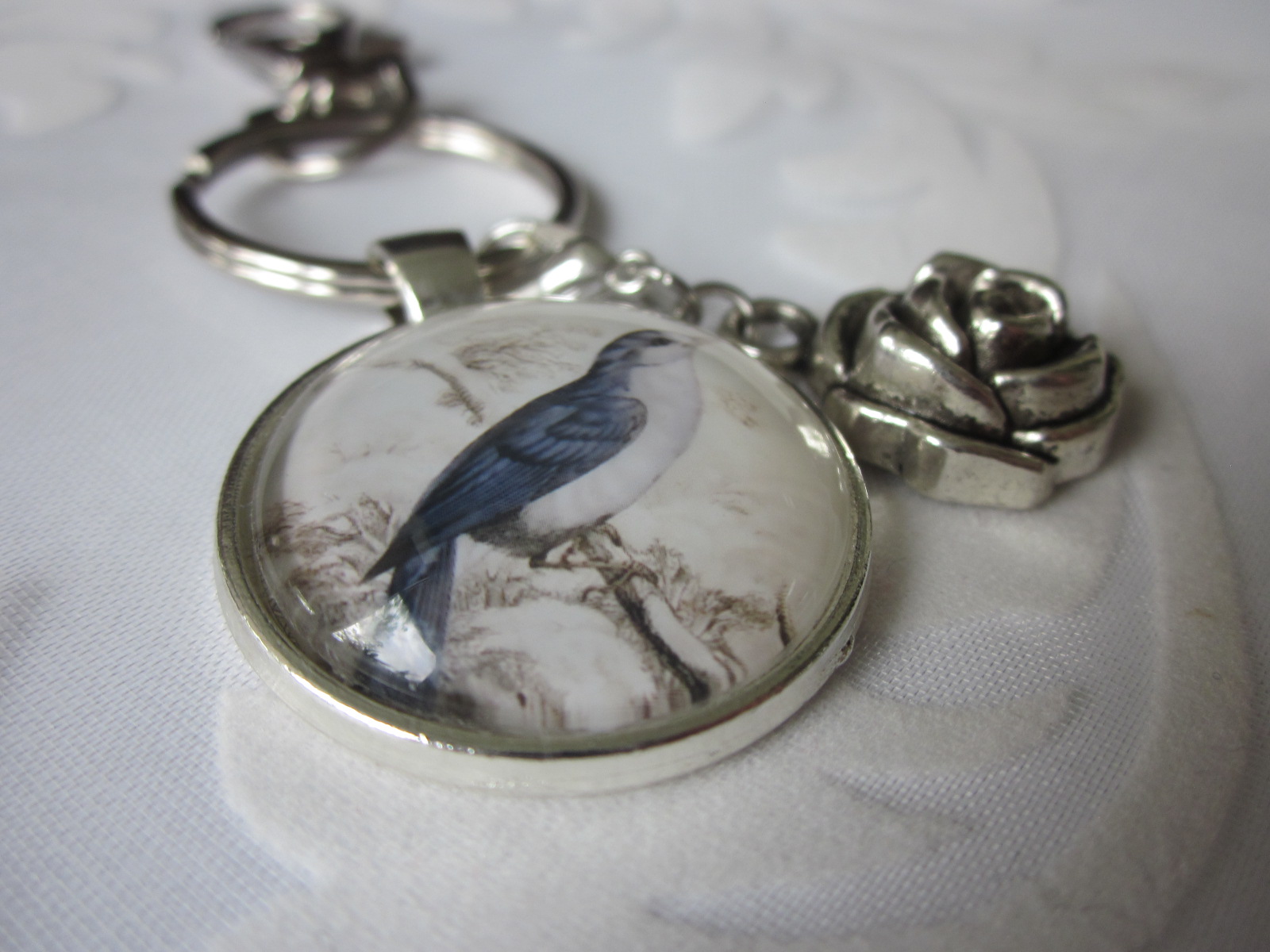 Hübscher Schlüsselanhänger mit einem Cabochon (Glasstein) mit einem illustrierten Vogel-Motiv in Blau und Braun auf beigefarbenem Grund sowie einem silberfarbenem Rosen-Charm. Der Durchmesser des Cabochons beträgt 2,5 cm. Die Gesamtlänge des Schlüsselanhängers ist ca. 9 cm. Wunderbar für die eigenen Schlüssel oder als Geschenk mit besonderem Charme für alle, die Tiere und Blumen lieben!