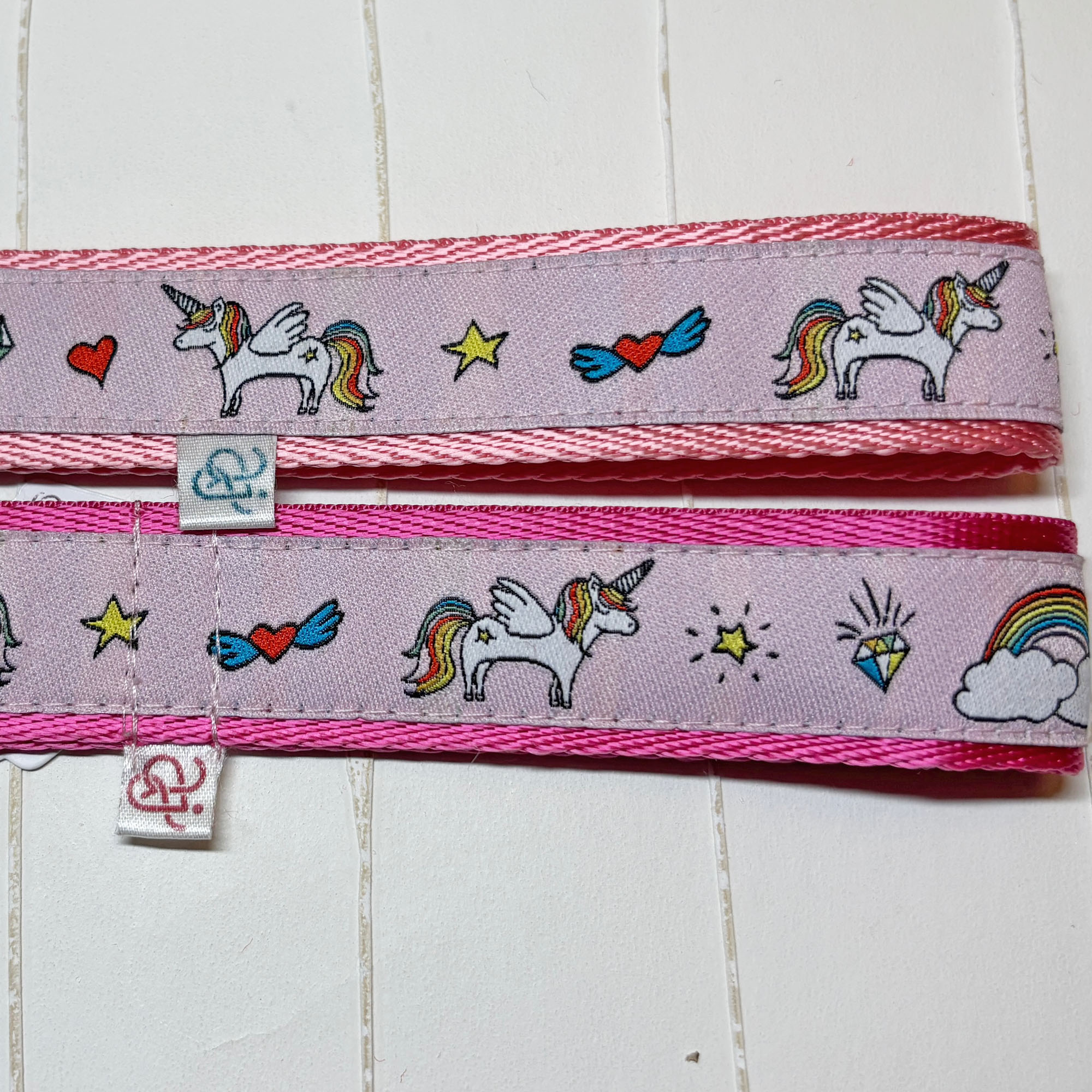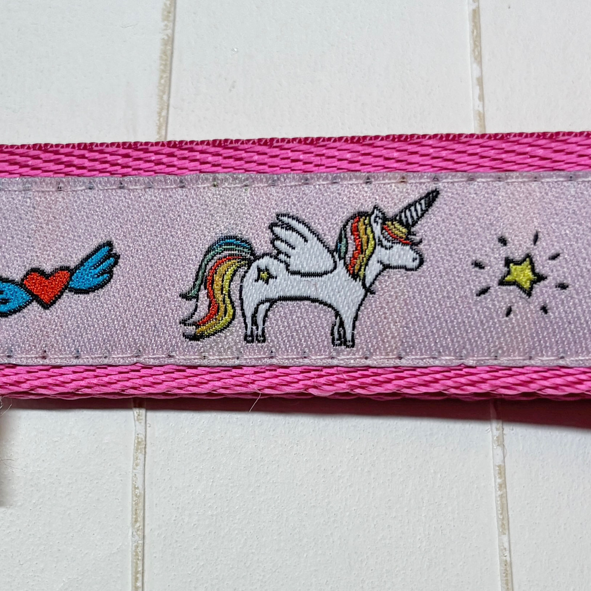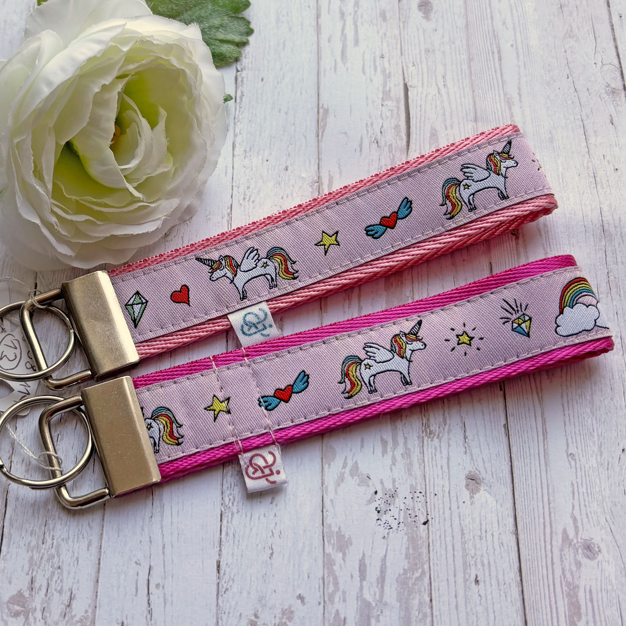 Schlüsselband aus bunter Borte mit Einhörnern auf Webband an stabilen Metallklammern mit Schlüsselring