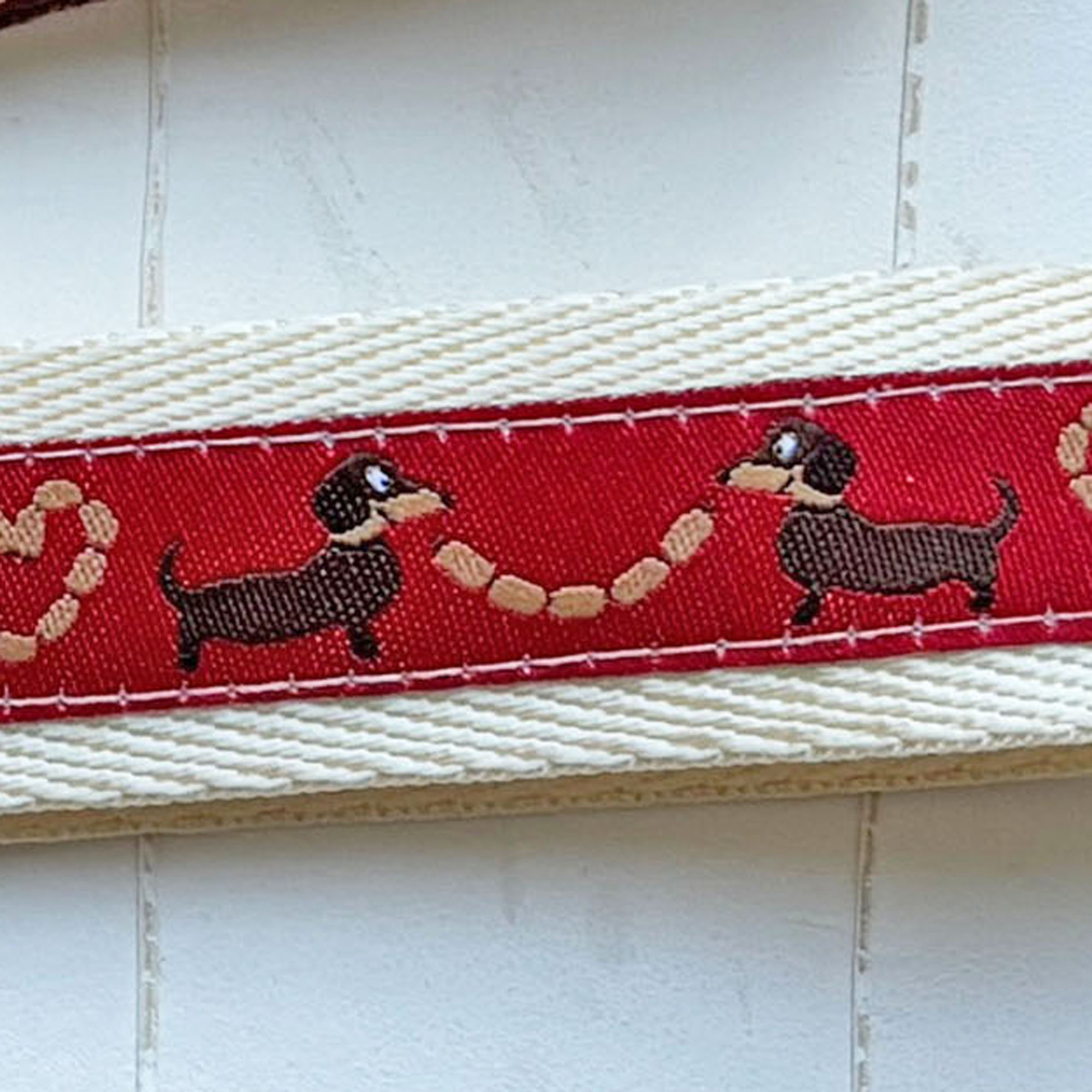 50 Dackel mit Würstchen auf cremefarbenem Webband