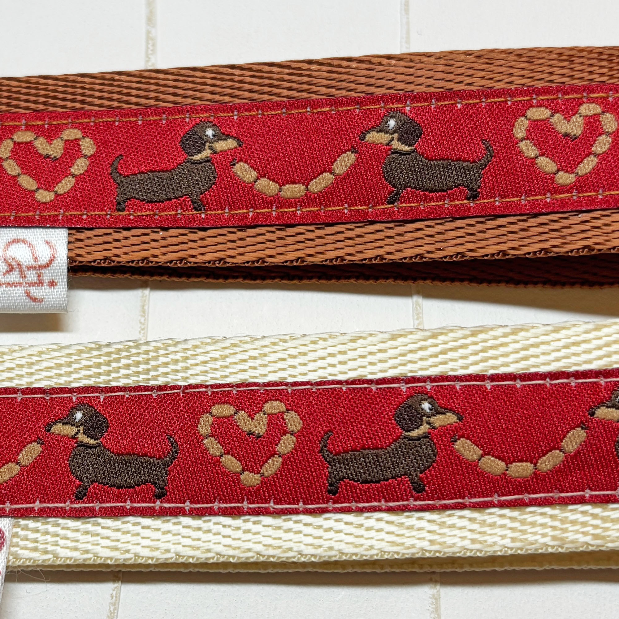 135 Dackel mit Würstchen auf braunem Webband