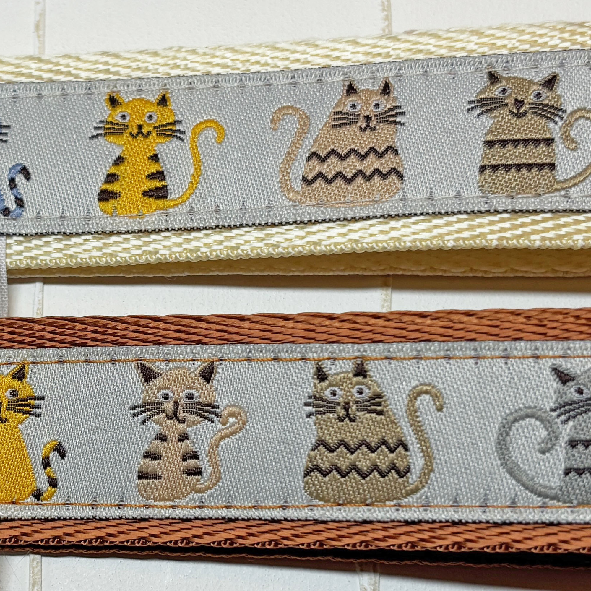 92 bunte Katzen auf braunem Webband