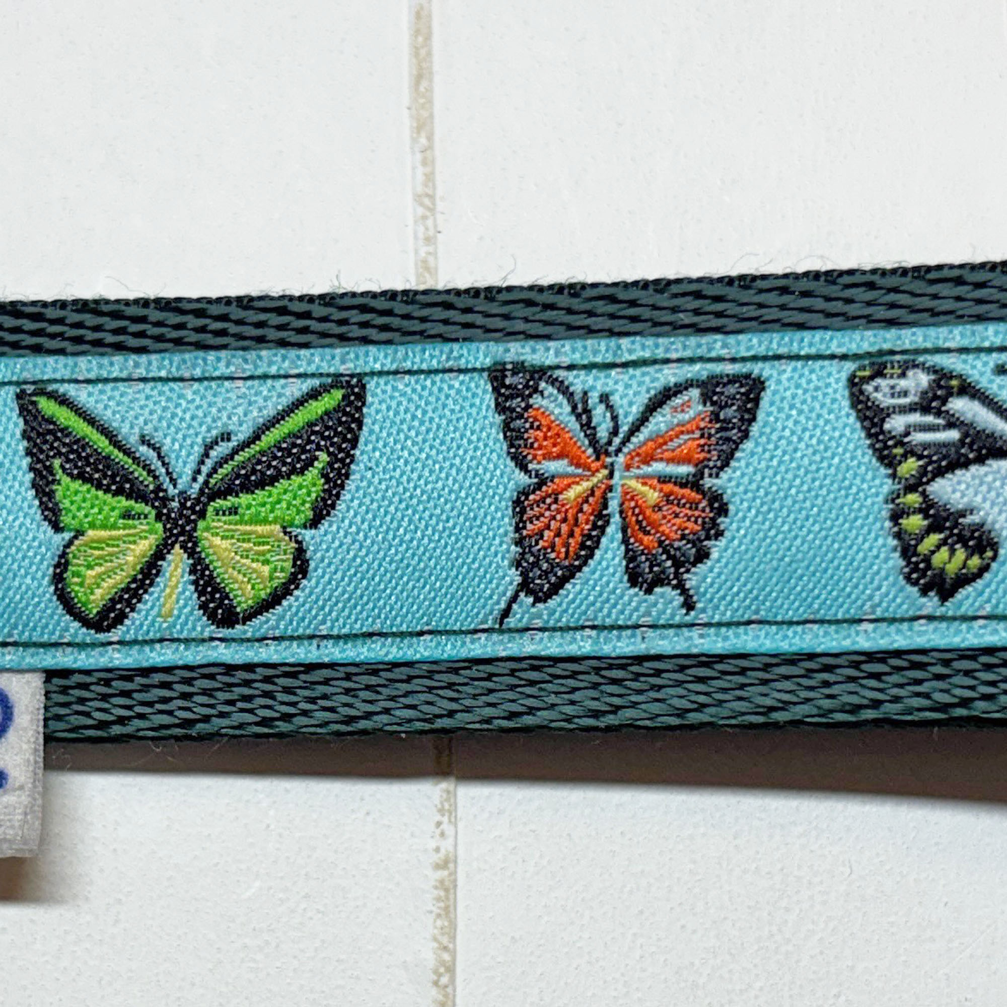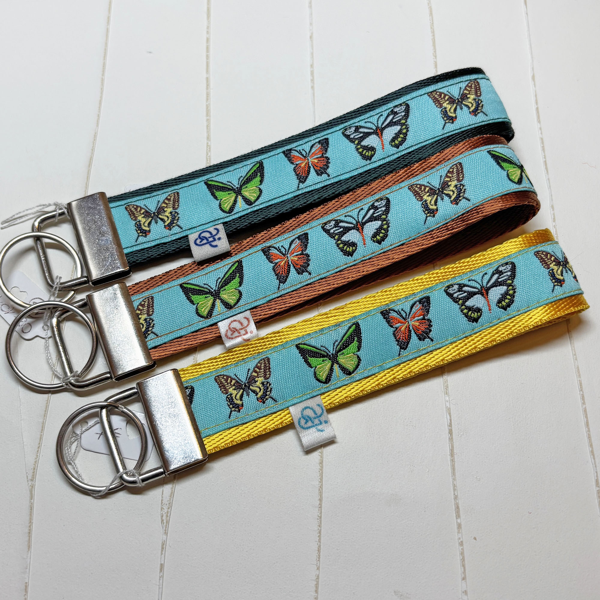Schlüsselband aus bunter Borte mit Schmetterlingen auf Webband an stabilen Metallklammern mit Schlüsselring