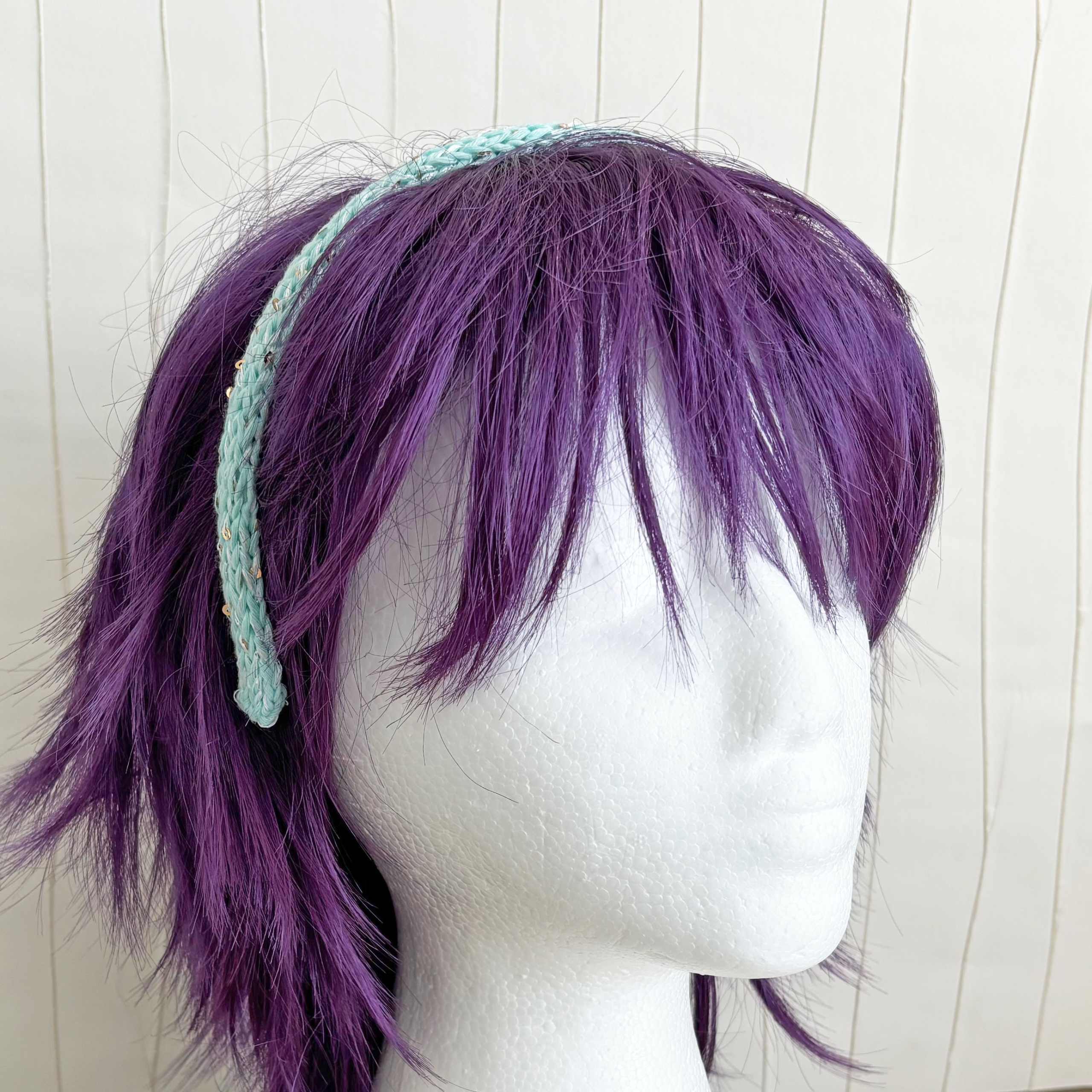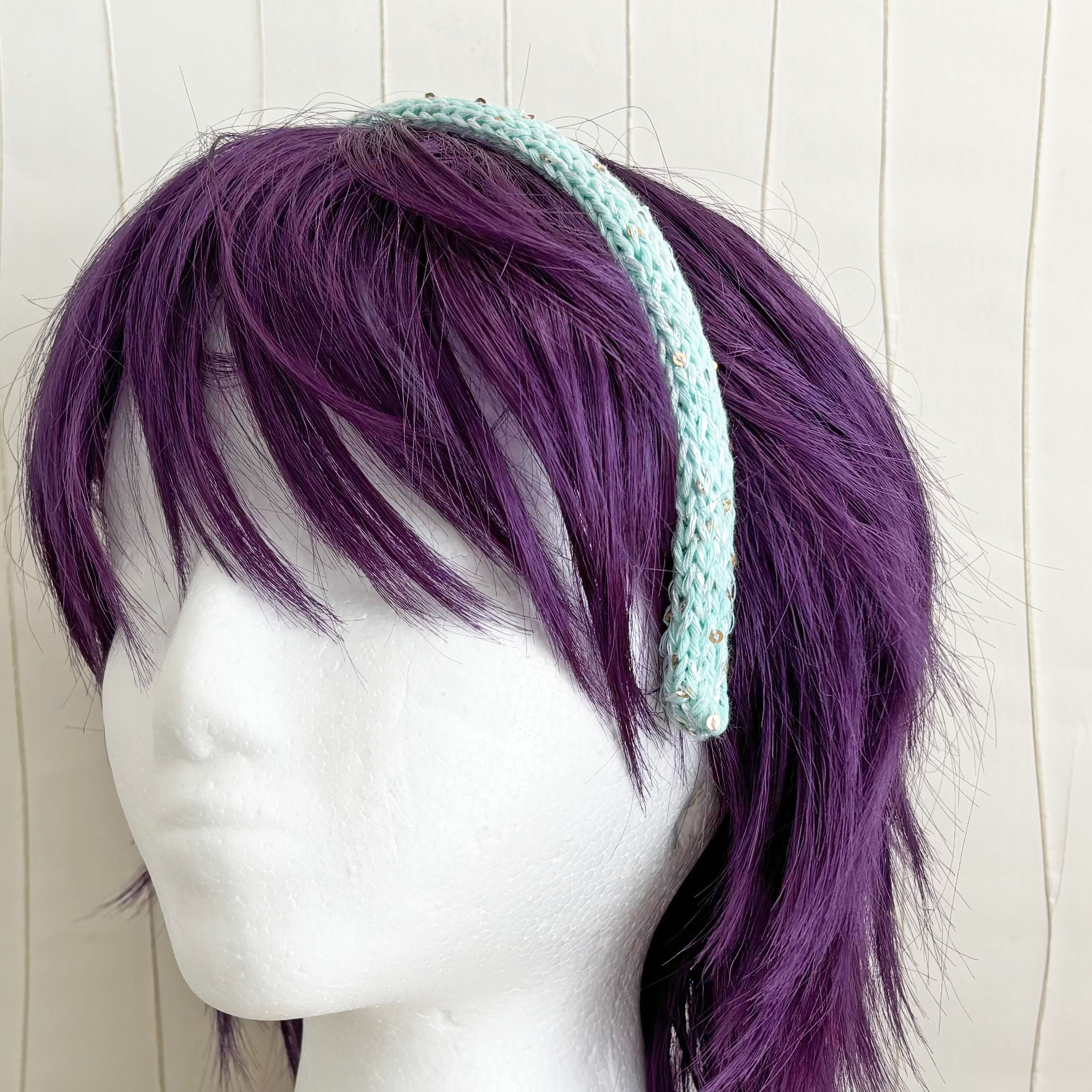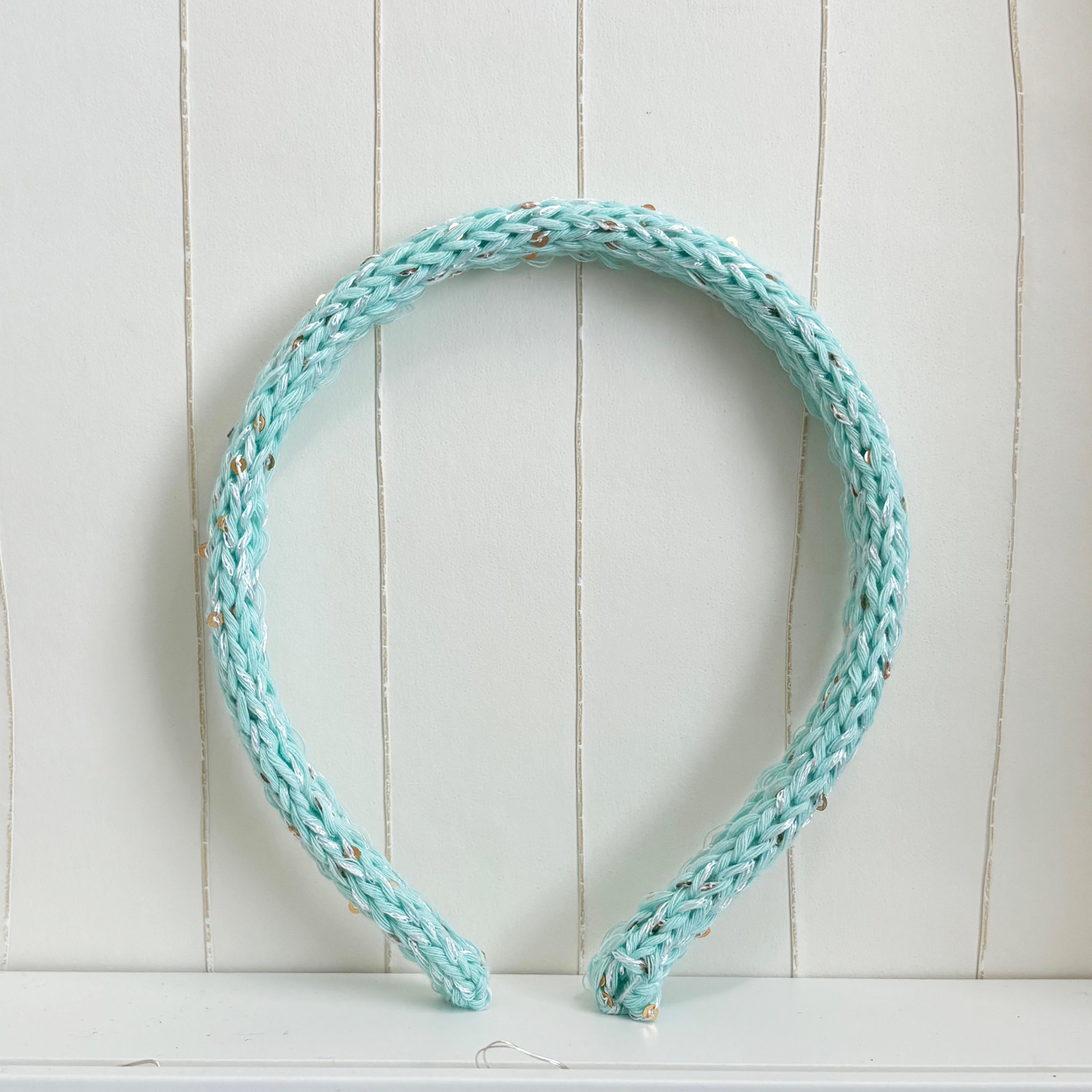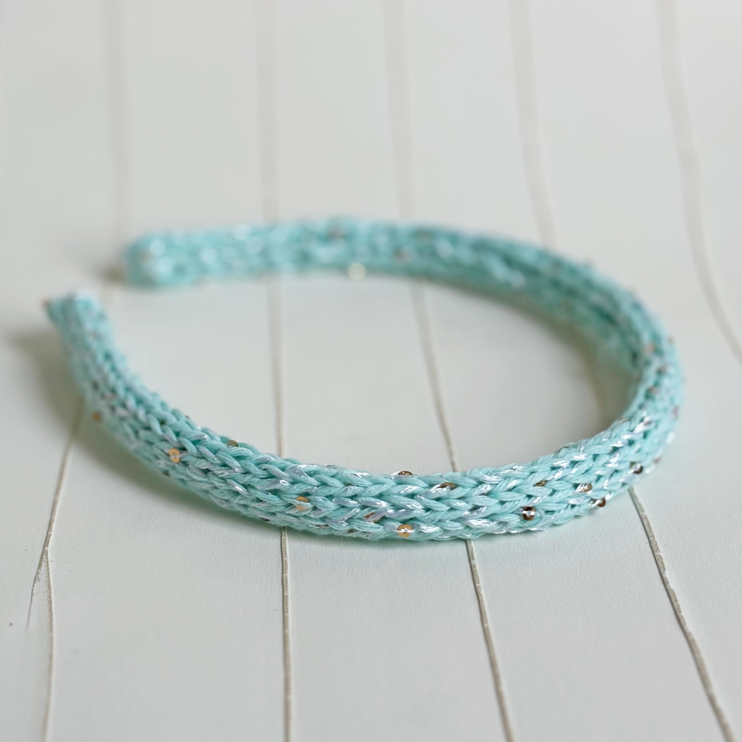 - Schmaler Haarreifen mit gestricktem Bezug aus mintgrüner Baumwolle mit kleinen silbernen Pailletten, Handarbeit als Icord gestrickt