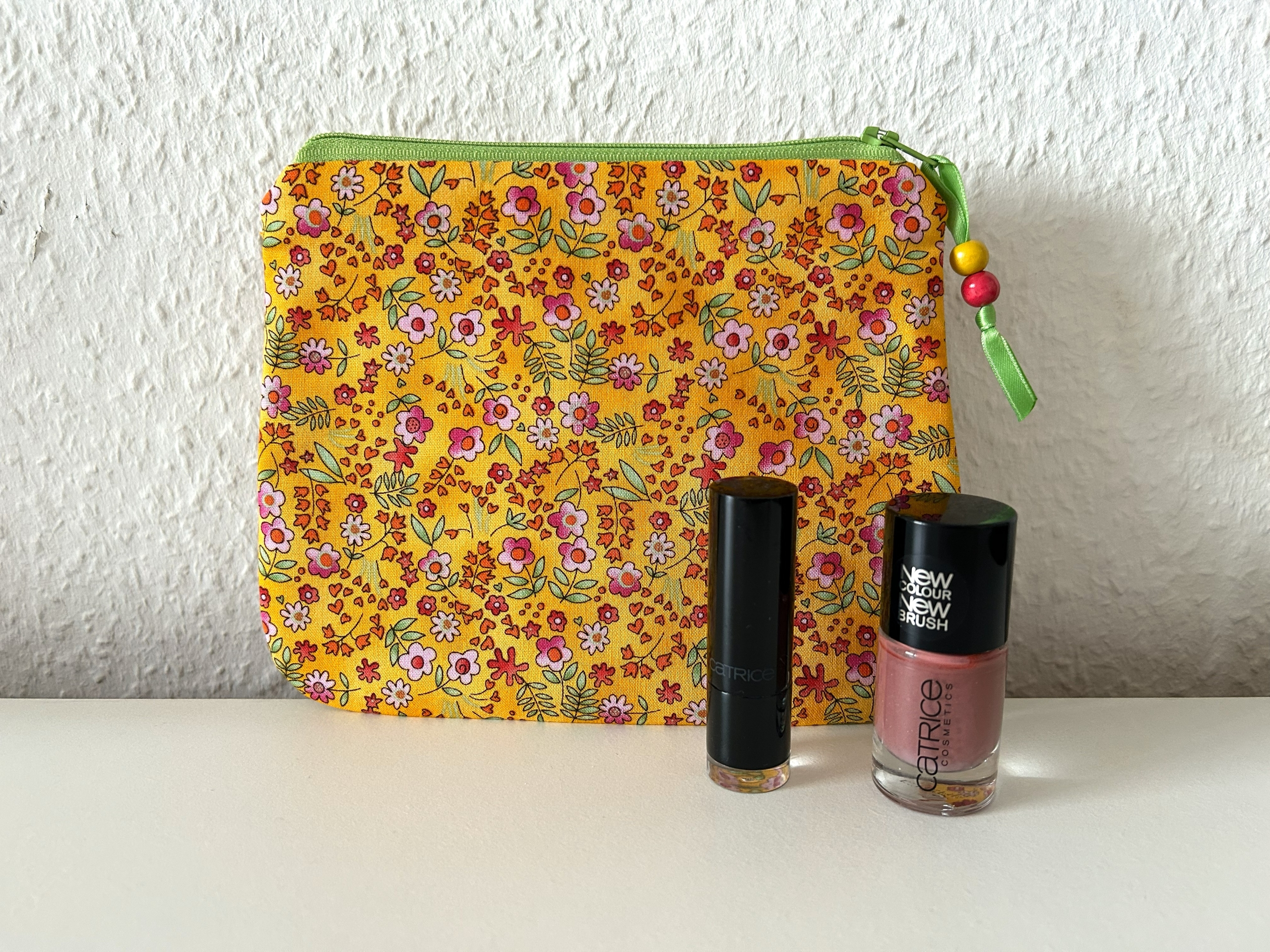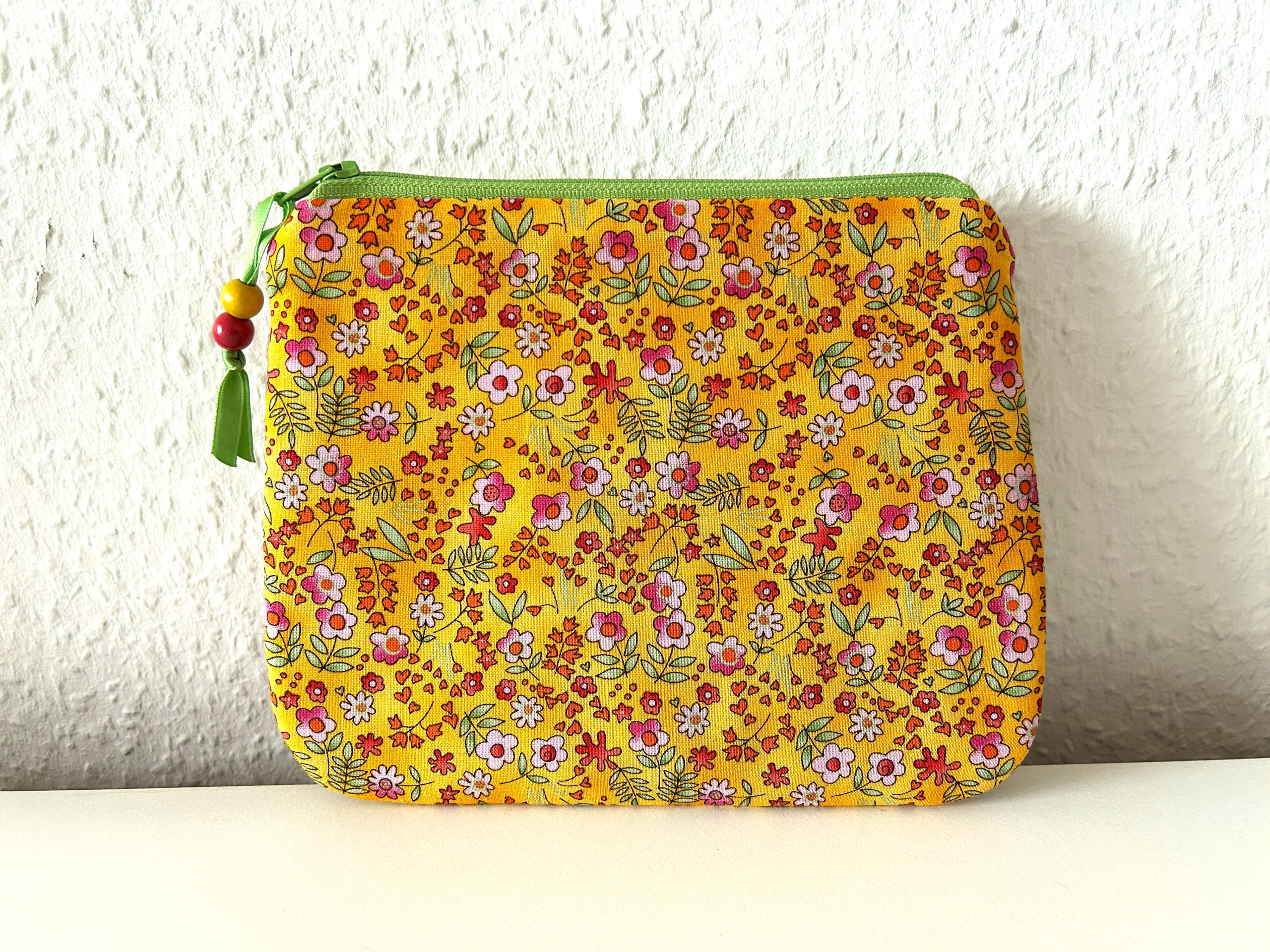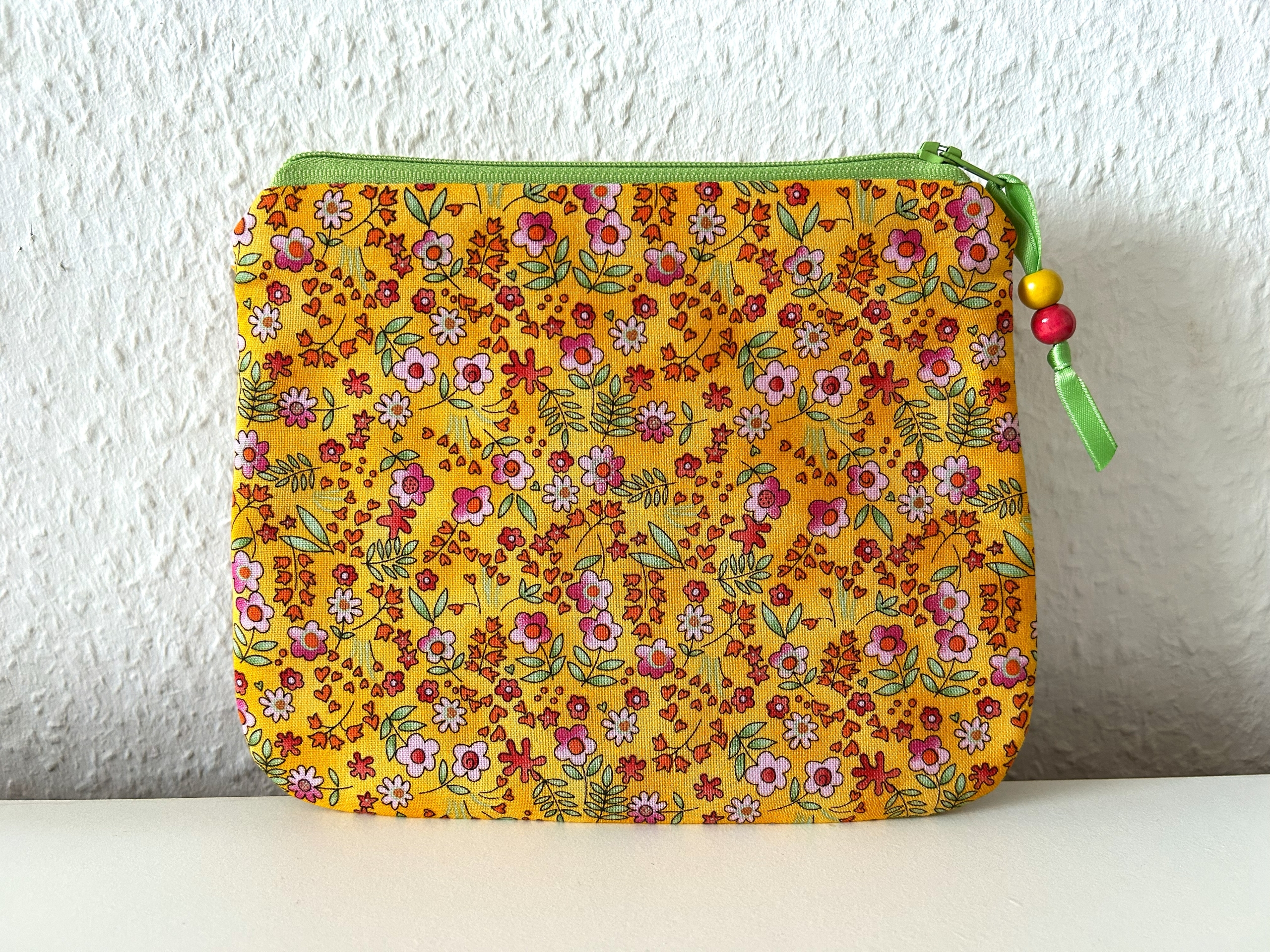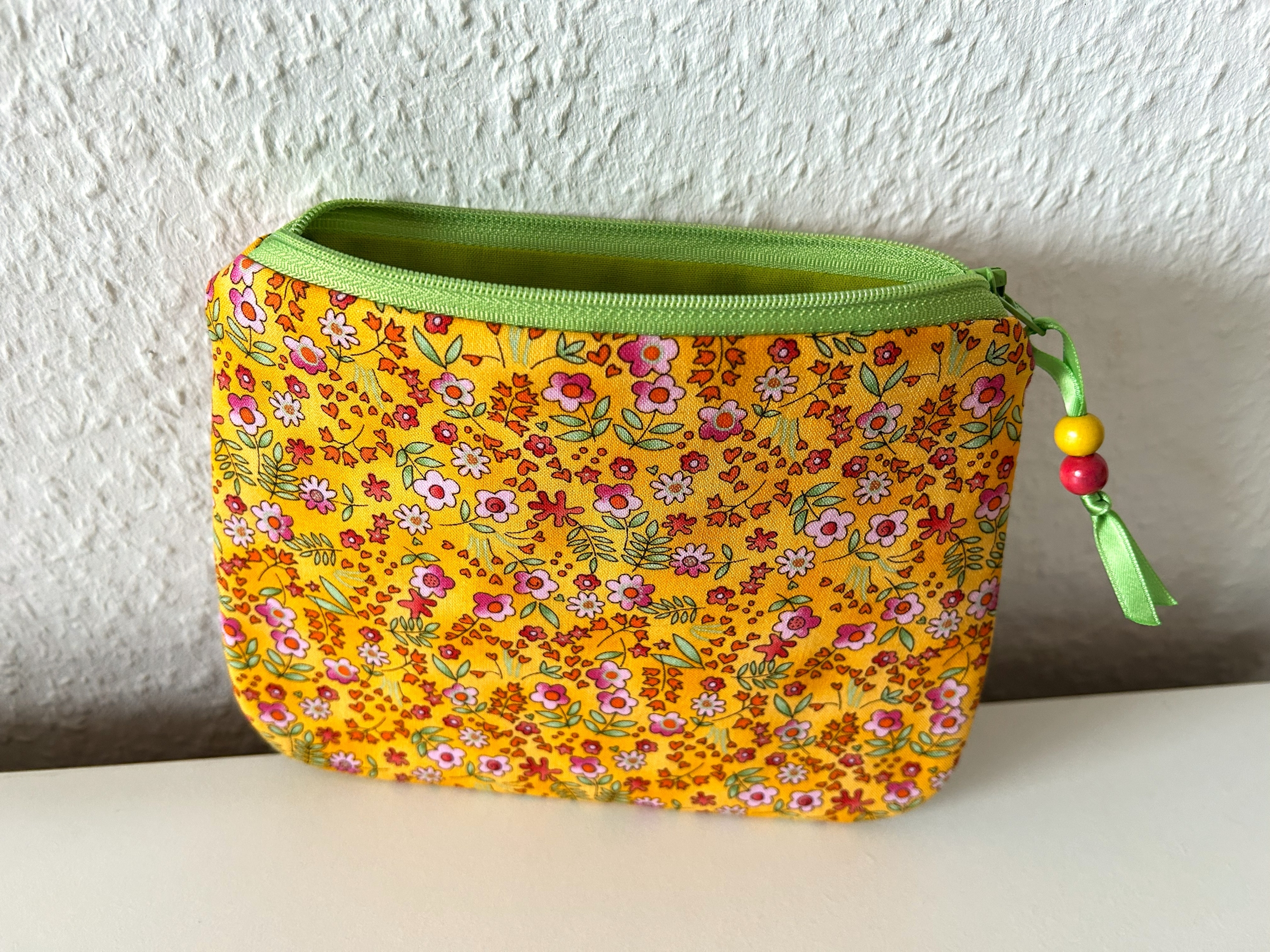 Schönes Reißverschlußtäschchen aus einem gelb-grün-roten Baumwollstoff mit Blümchenmuster.