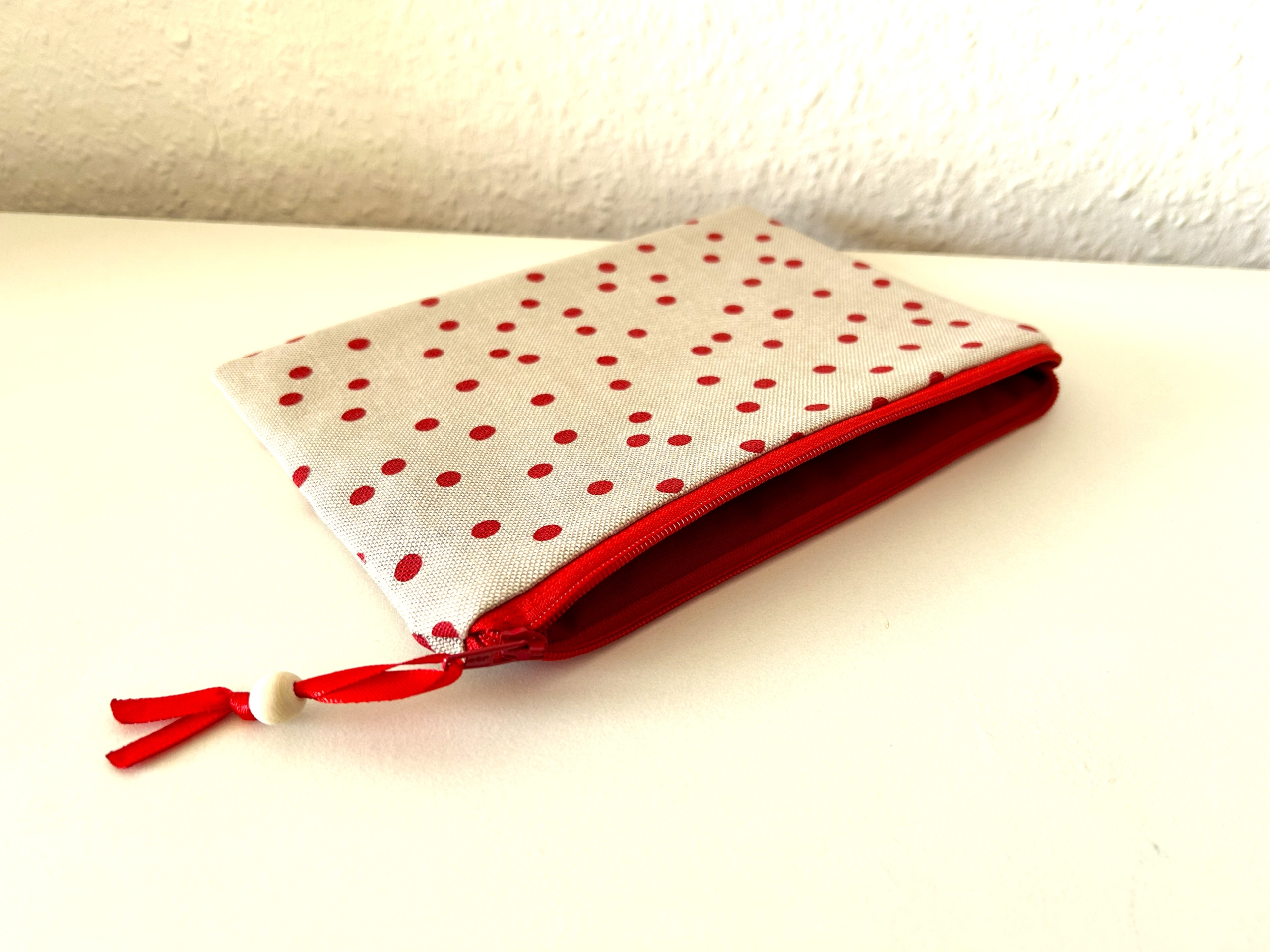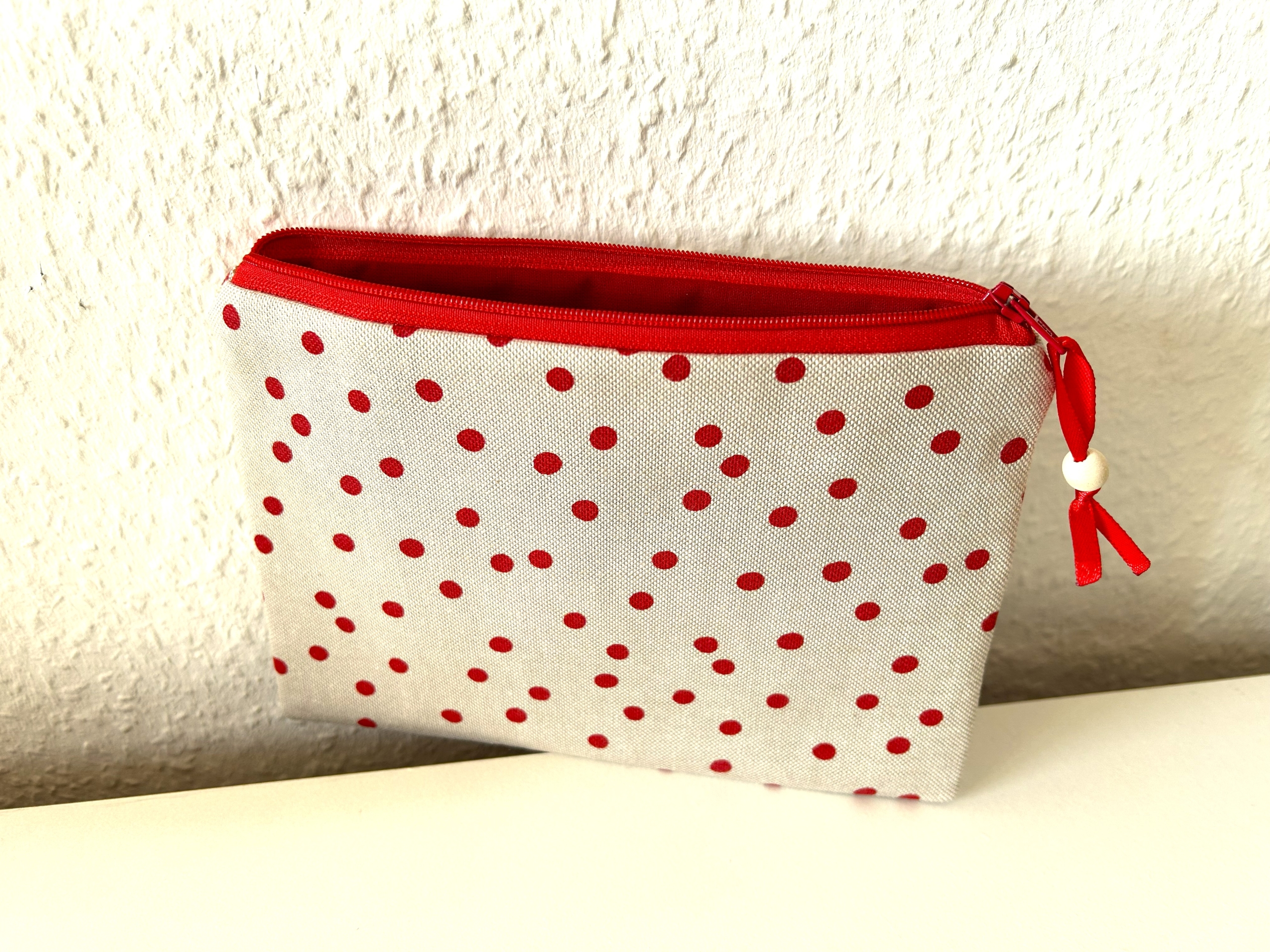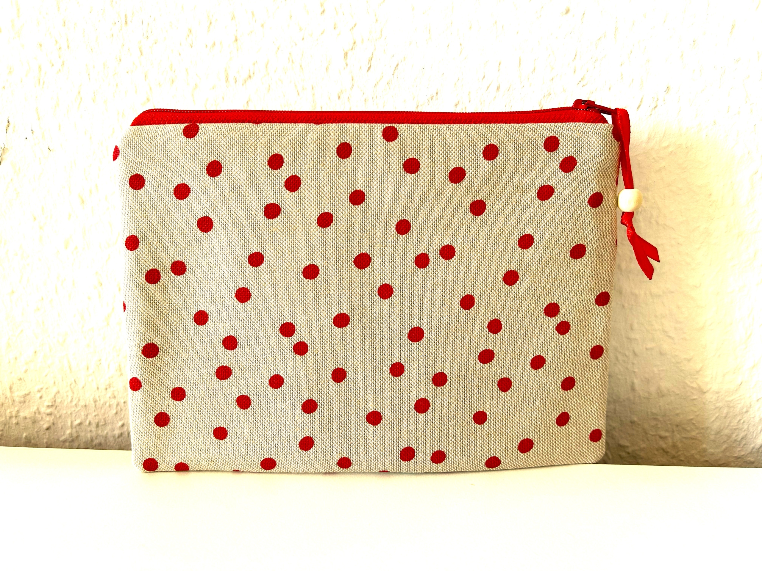 Flaches Reißverschlußtäschchen in beige mit roten Punkten.
