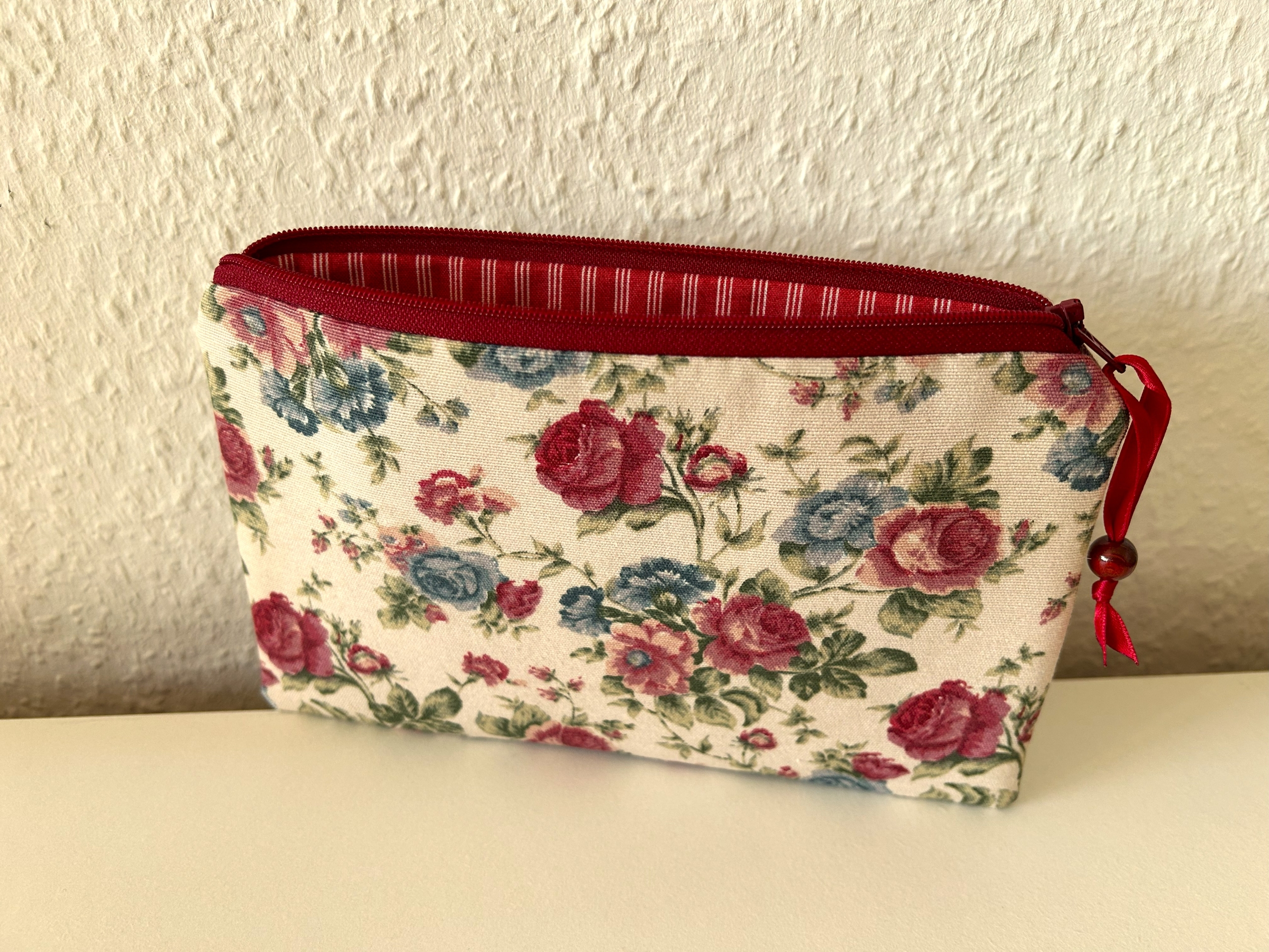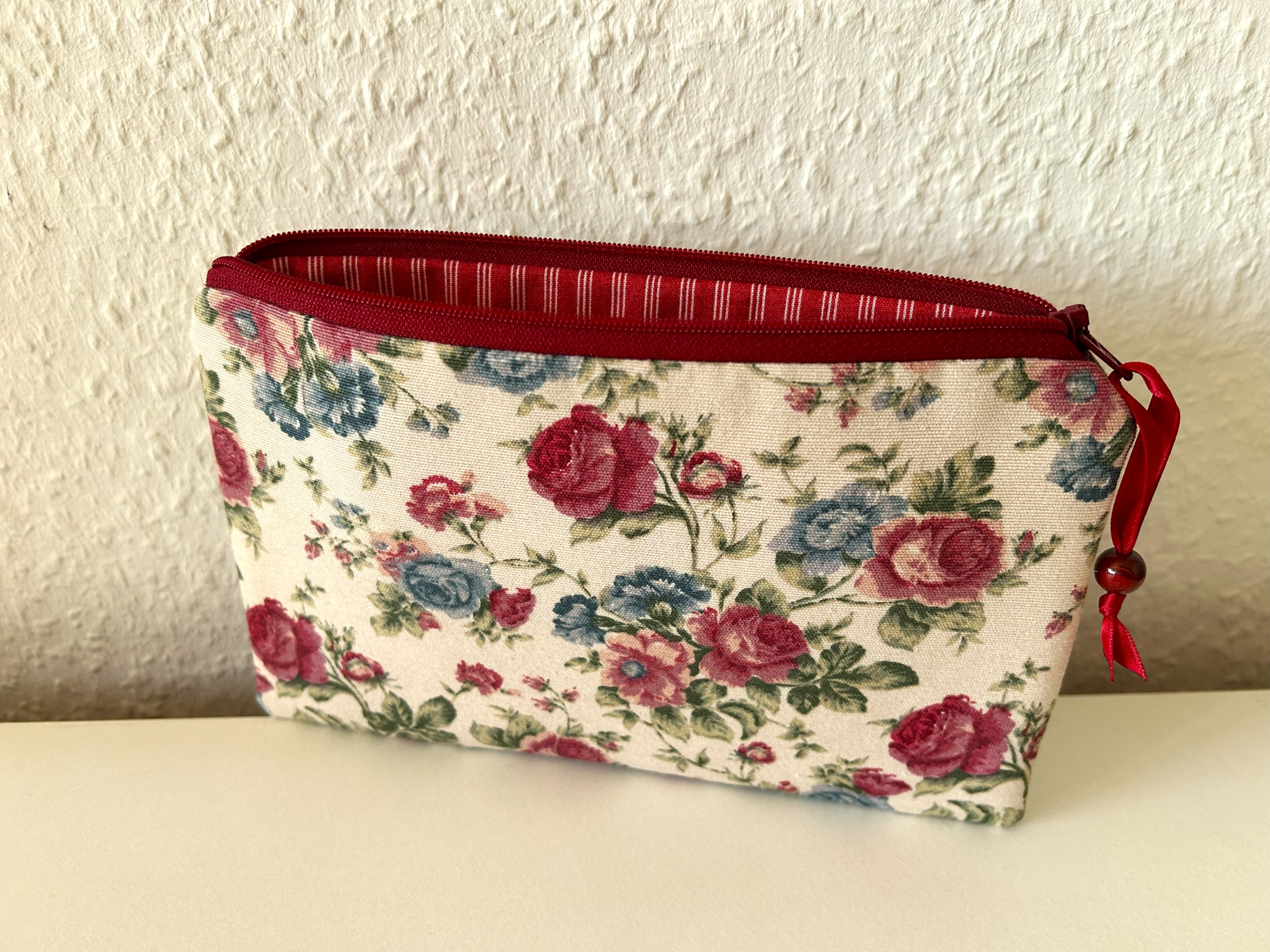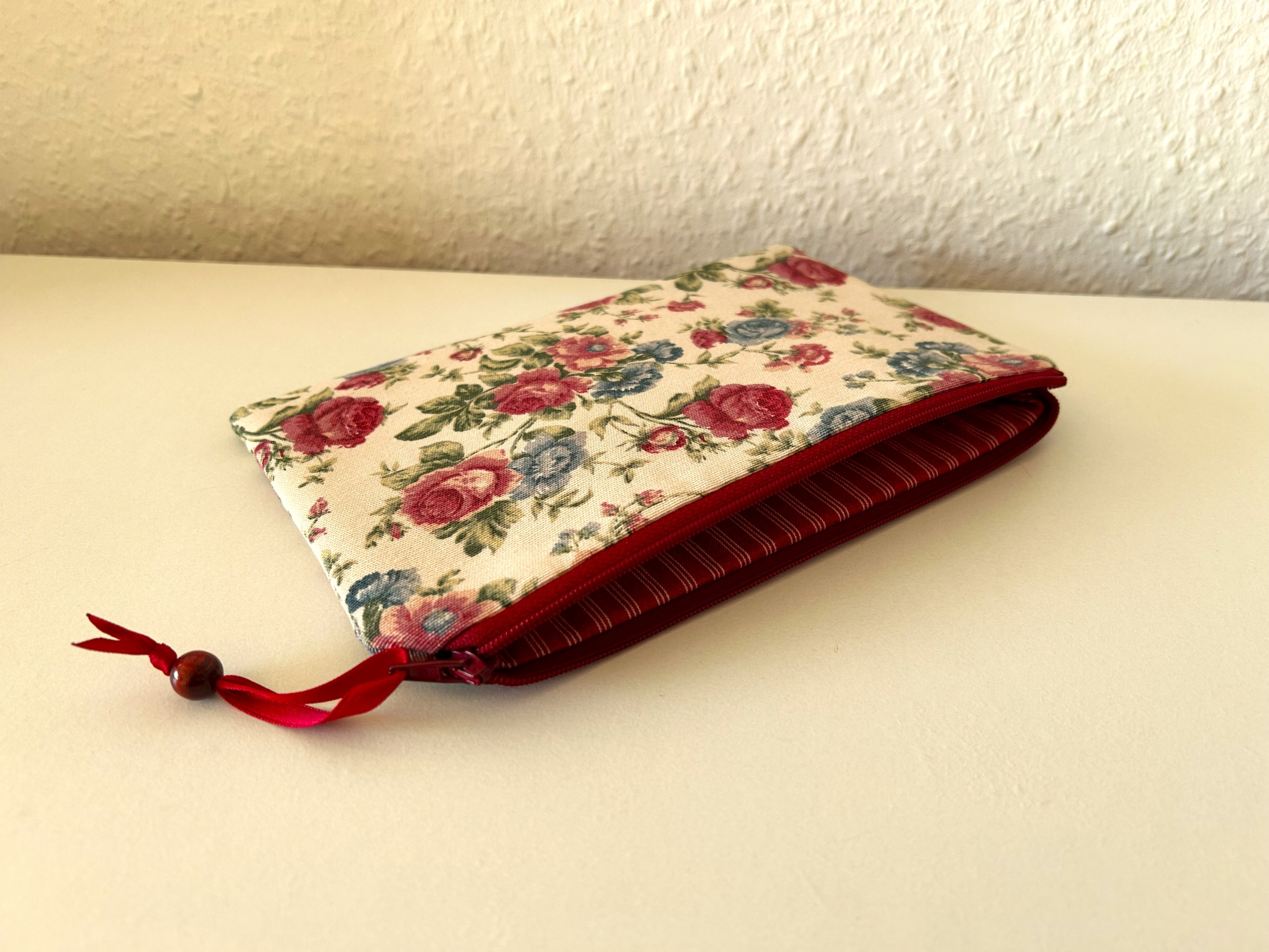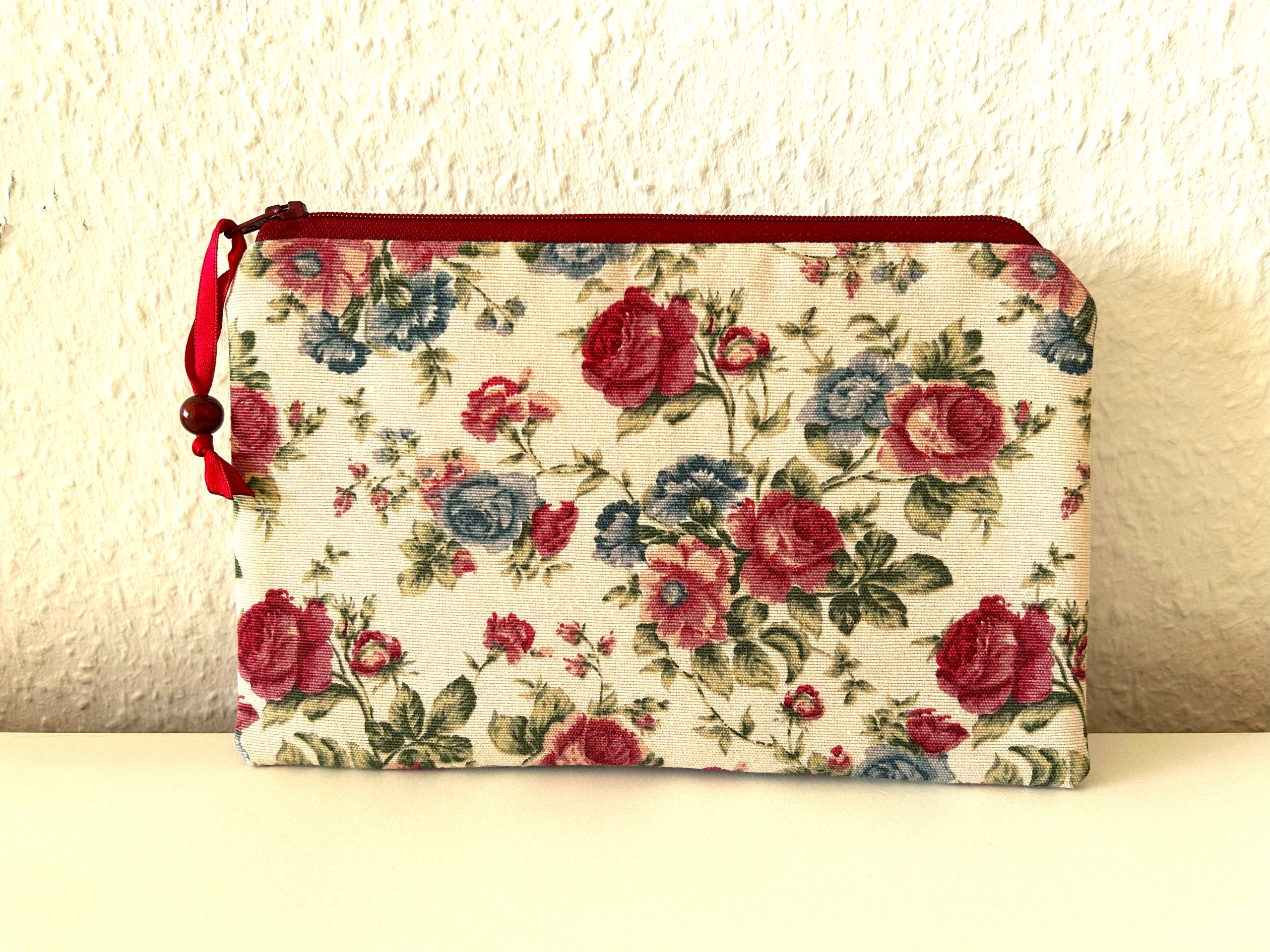 Flaches Reißverschlußtäschchen in beige mit Rosenmuster.