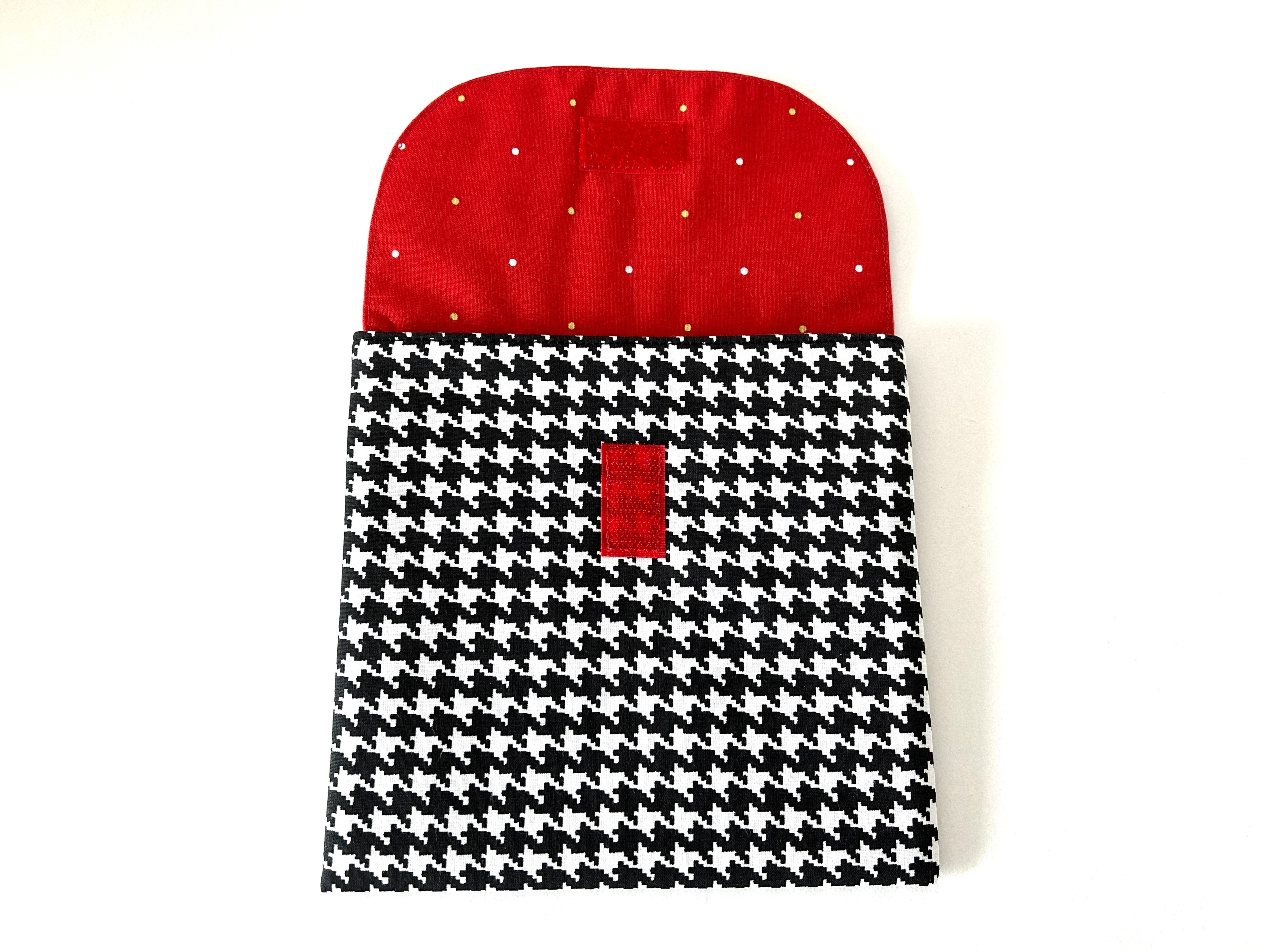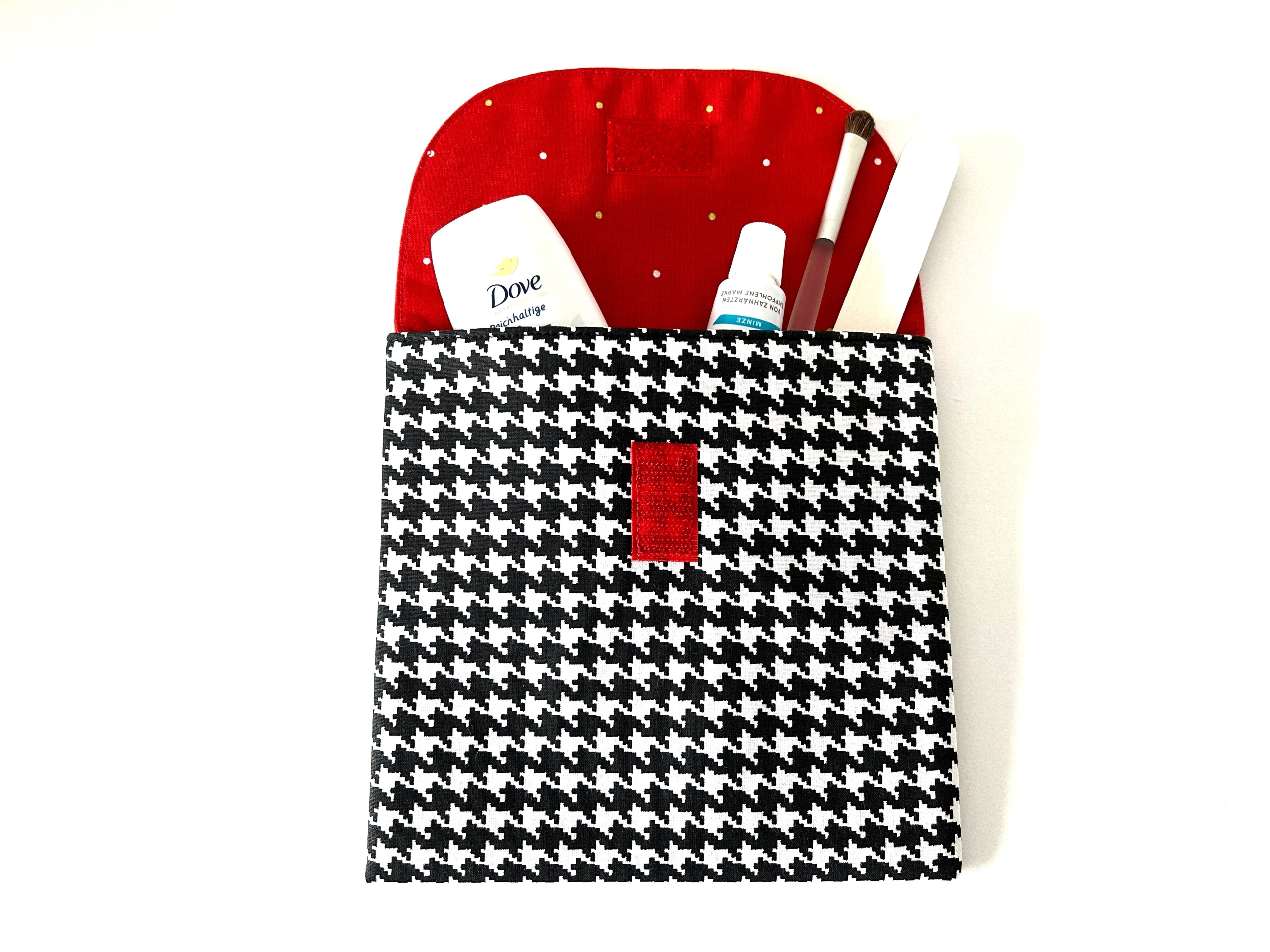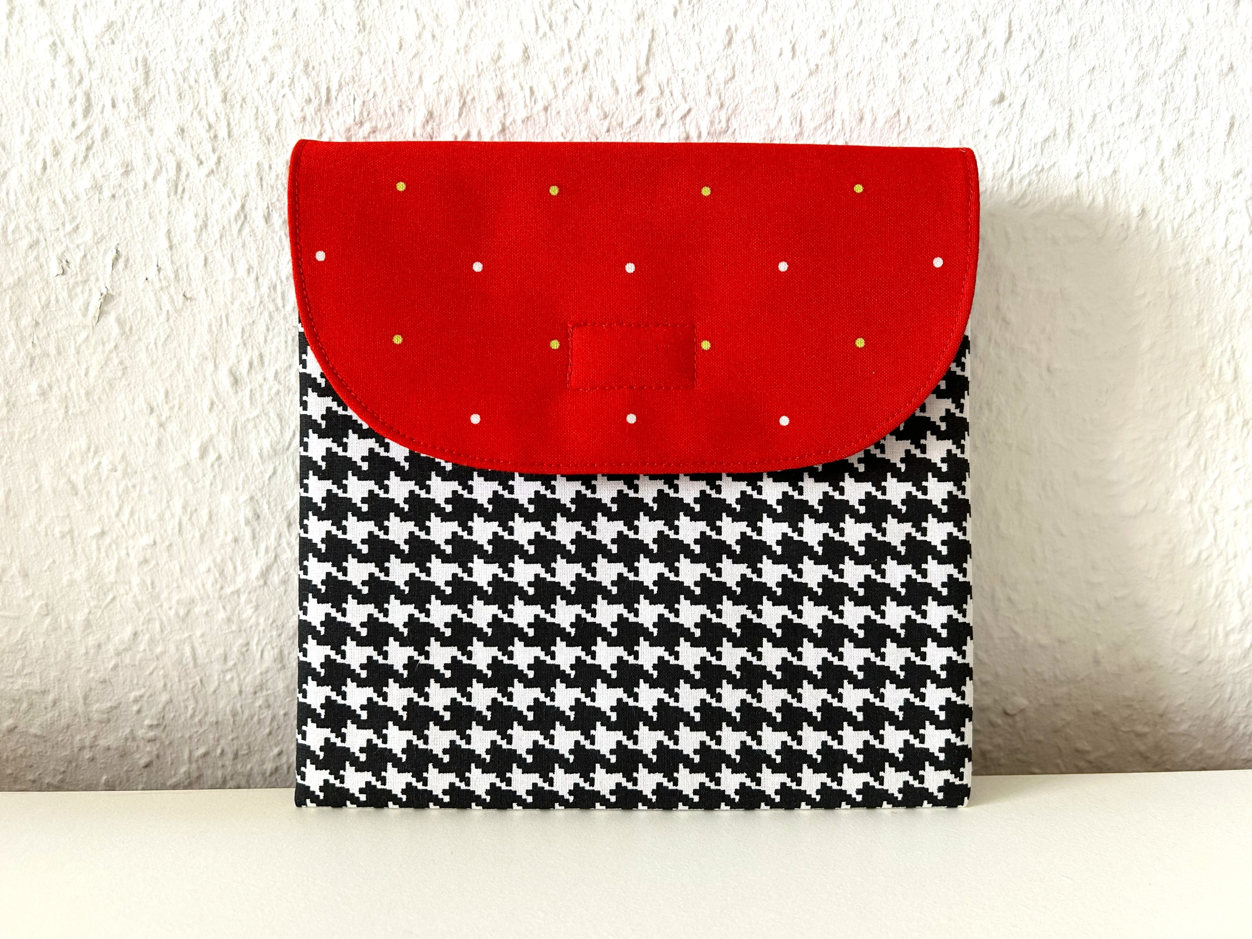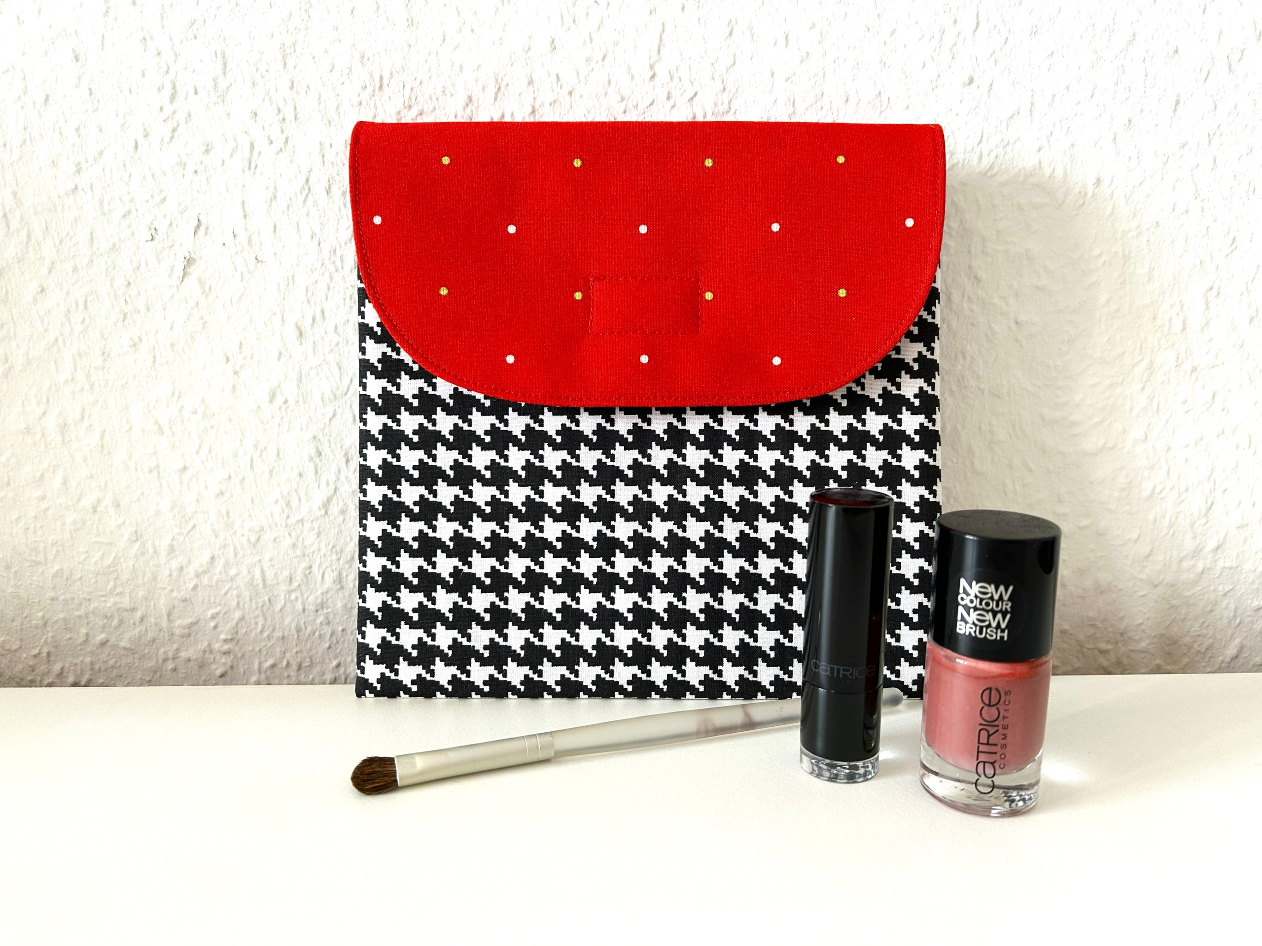 Schönes Täschchen mit schwarz-weißem Hahnentrittmuster und roter Klappe mit Pünktchen.