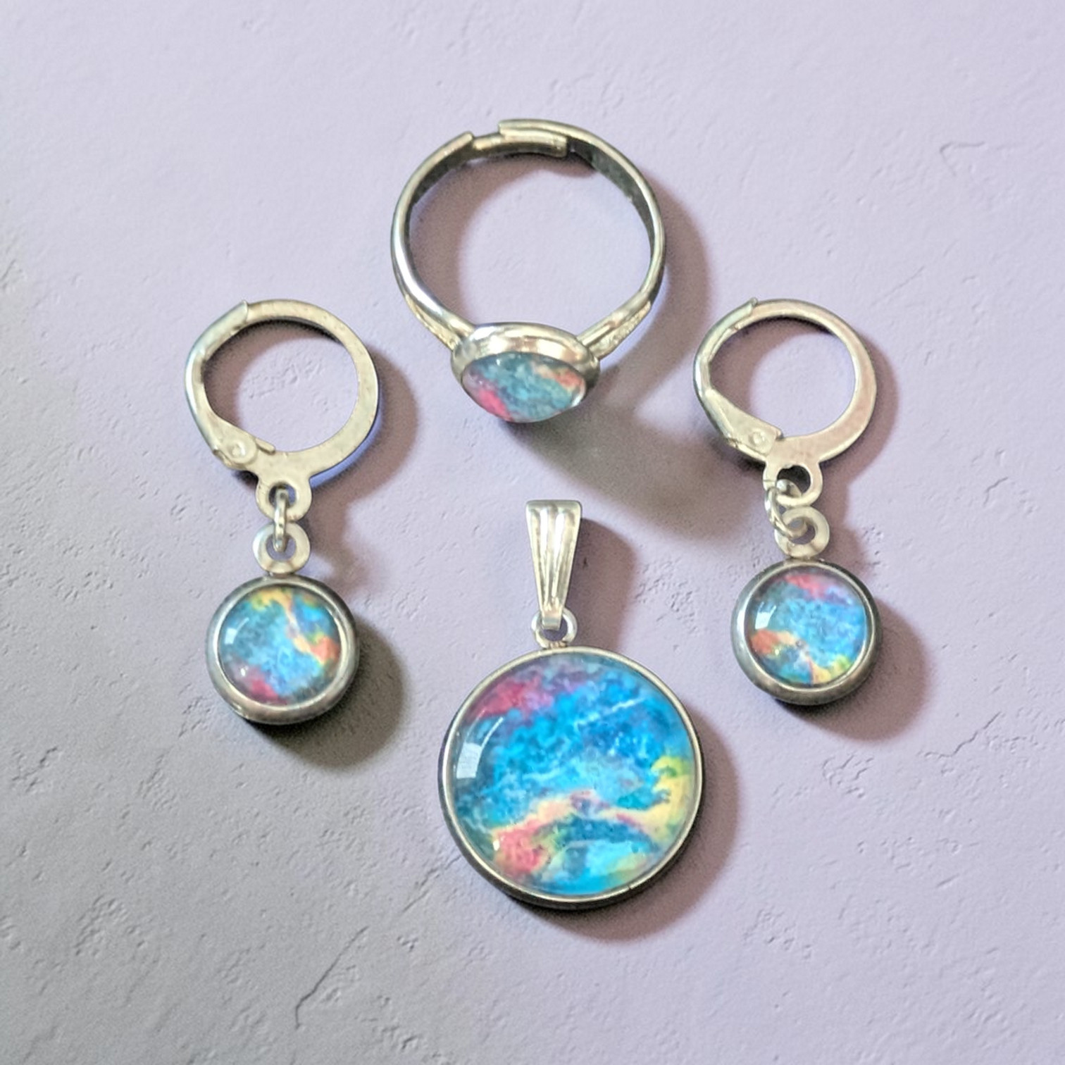 Ein schönes Schmuckset, bestehend aus 1 Paar Ohrringen, 1 Fingerring und 1 Kette mit passendem Anhänger.