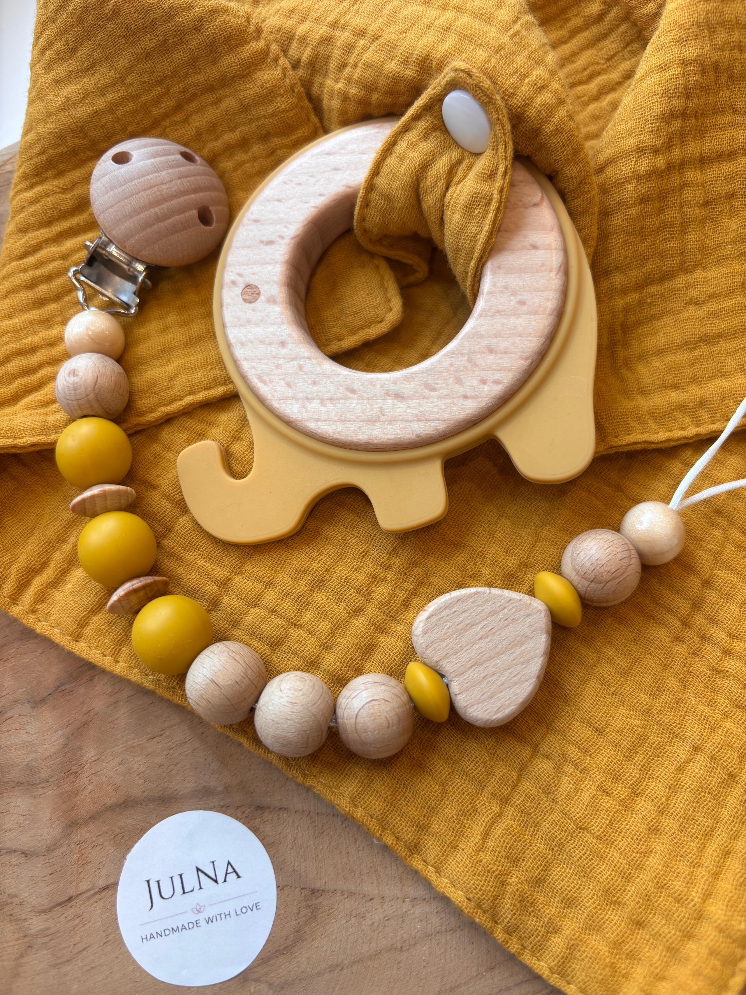~ Musselintuch mit Holz/Silikonelefant und Schnullerkette SET