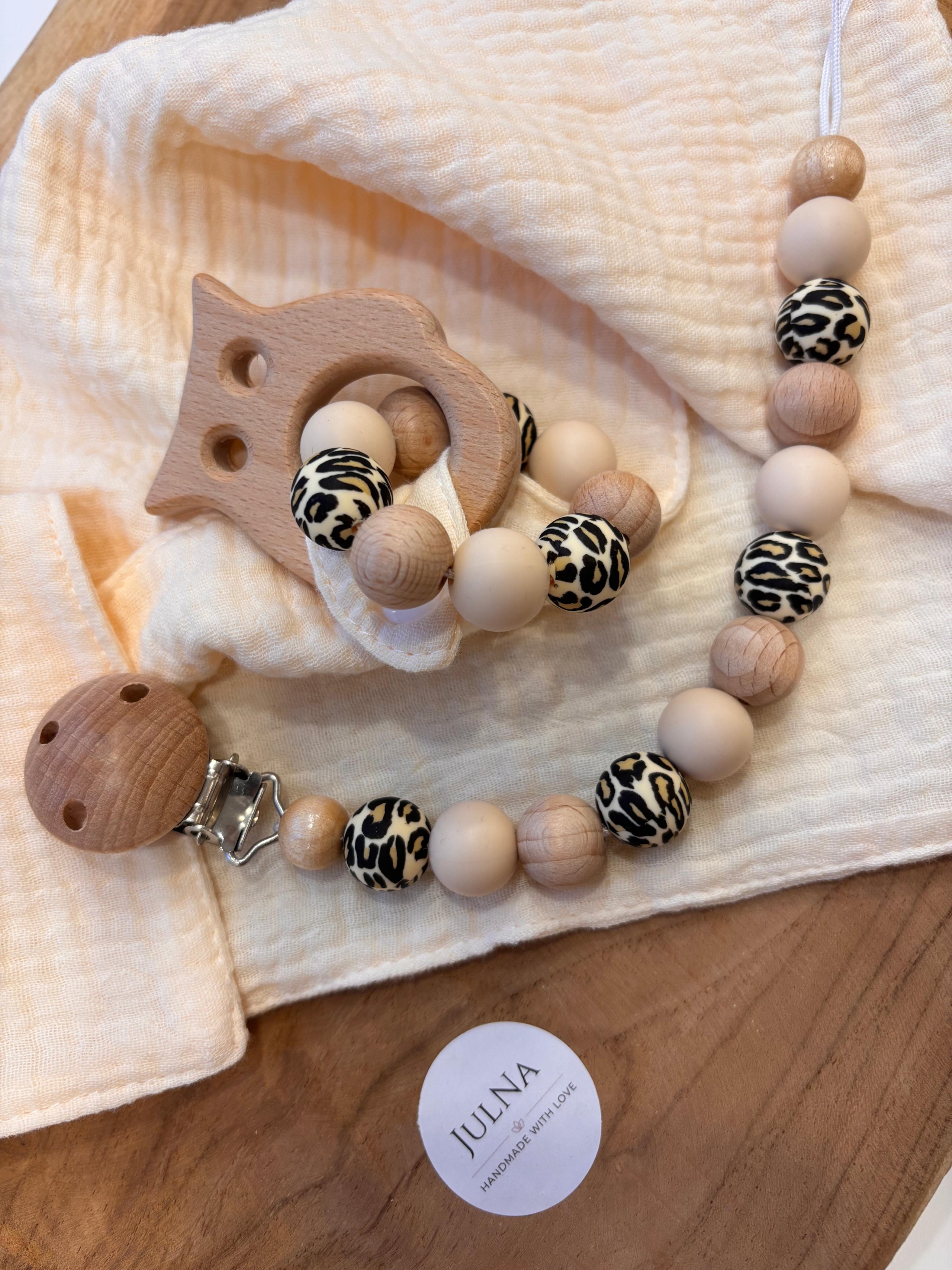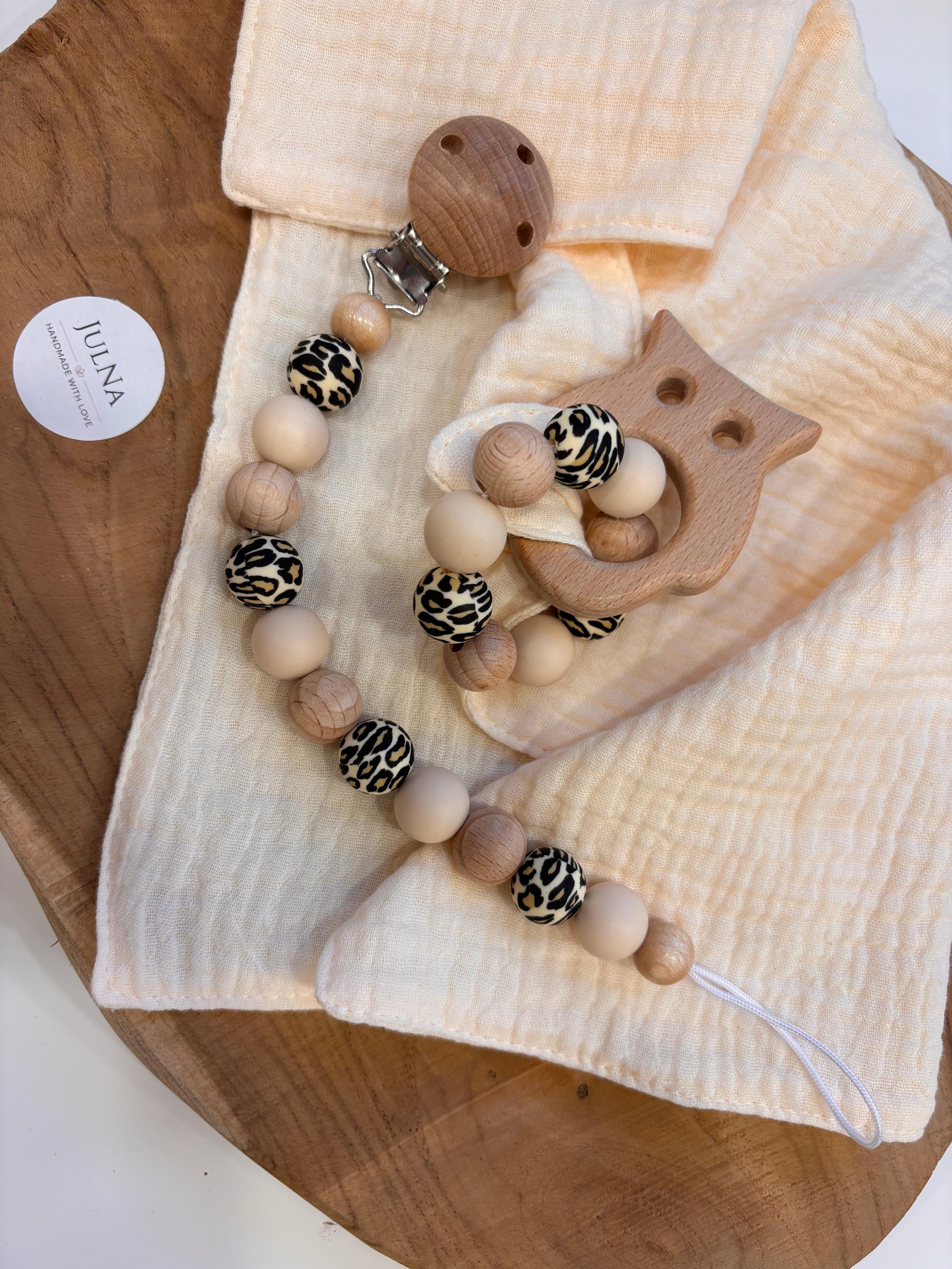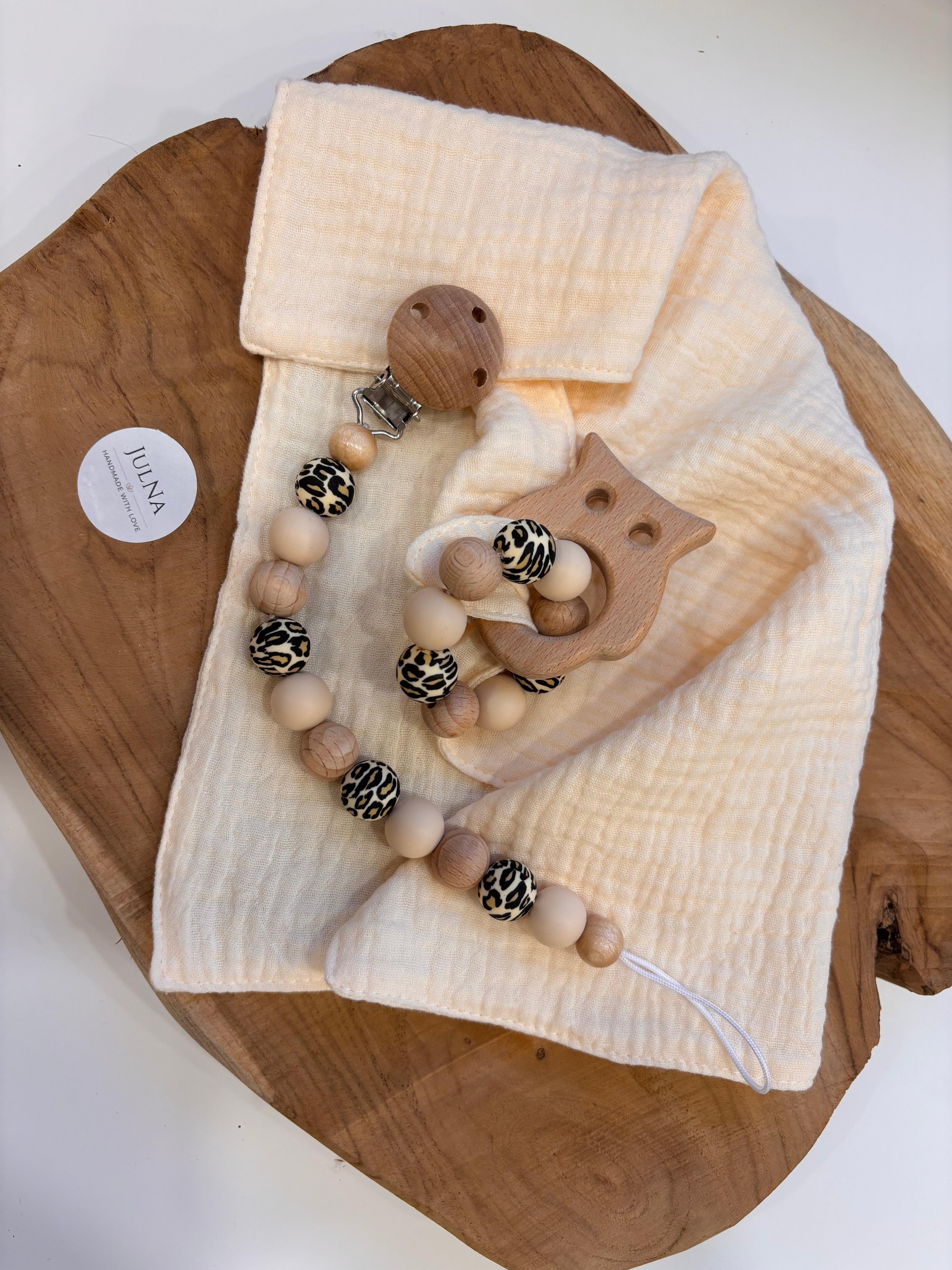 ~ Musselintuch mit Holztierchen und Schnullerkette SET