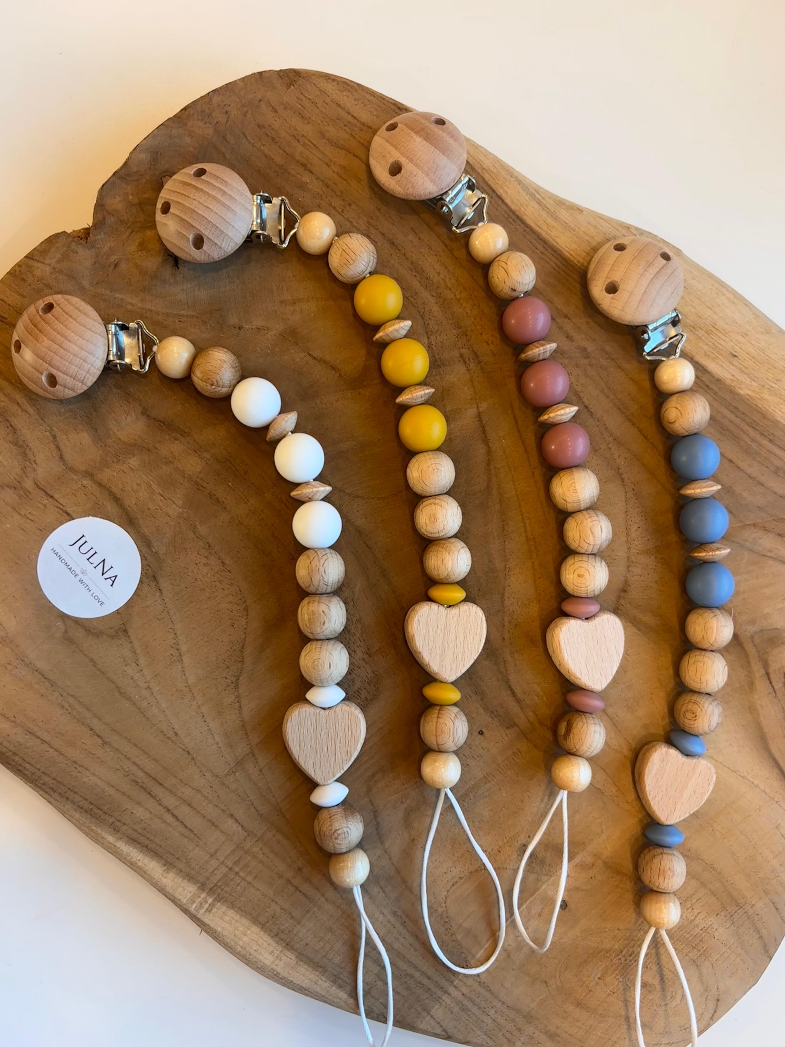 Liebevoll von uns gefertigte Schnullerkette, bestehend aus Holz und Silikon. Die Schnullerkette eignet sich hervorragend als Geschenk zur Geburt oder als Geschenk zur Babyparty. Durch die Möglichkeit der Personalisierung machst Du diese zu einem Unikat.
