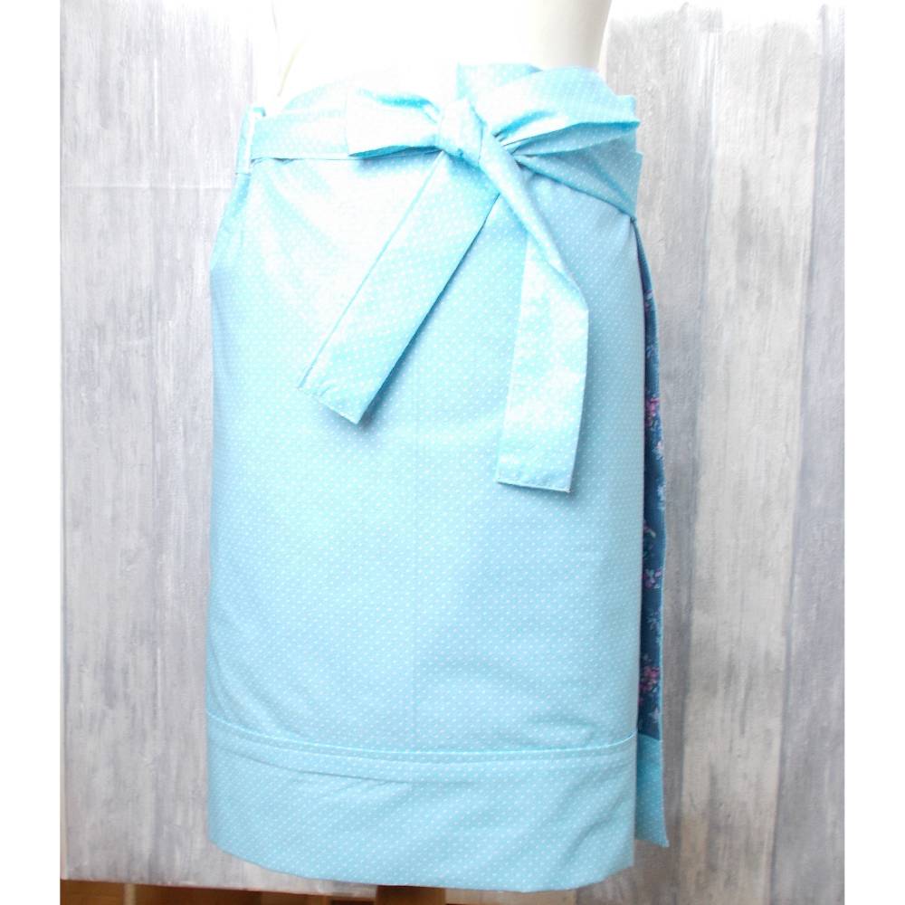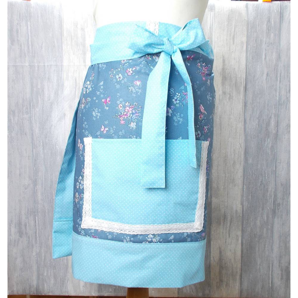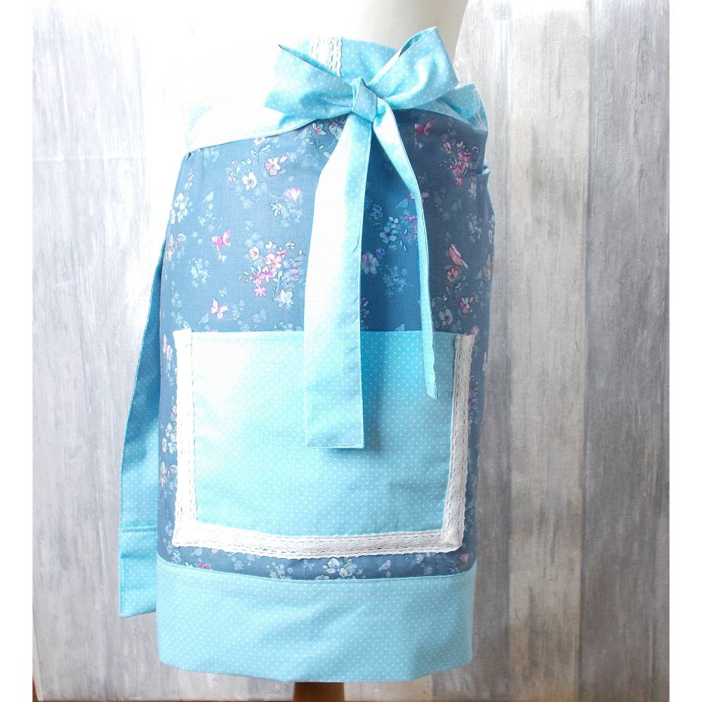 Bezaubernde Wendeschürze aus Baumwollstoffen in romantischem Design,auf der einen Seite mit einem süßen Blütendekor mit großer Tasche ,die mit Spitze eingefasst wurde,auf der anderen Seite mit einem zartblauem Baumwollstoff mit kleinen weißen Punkten,genäht. Die Blende wurde auch mit der gleichen Spitze verziert,mit der die Tasche eingefasst wurde.