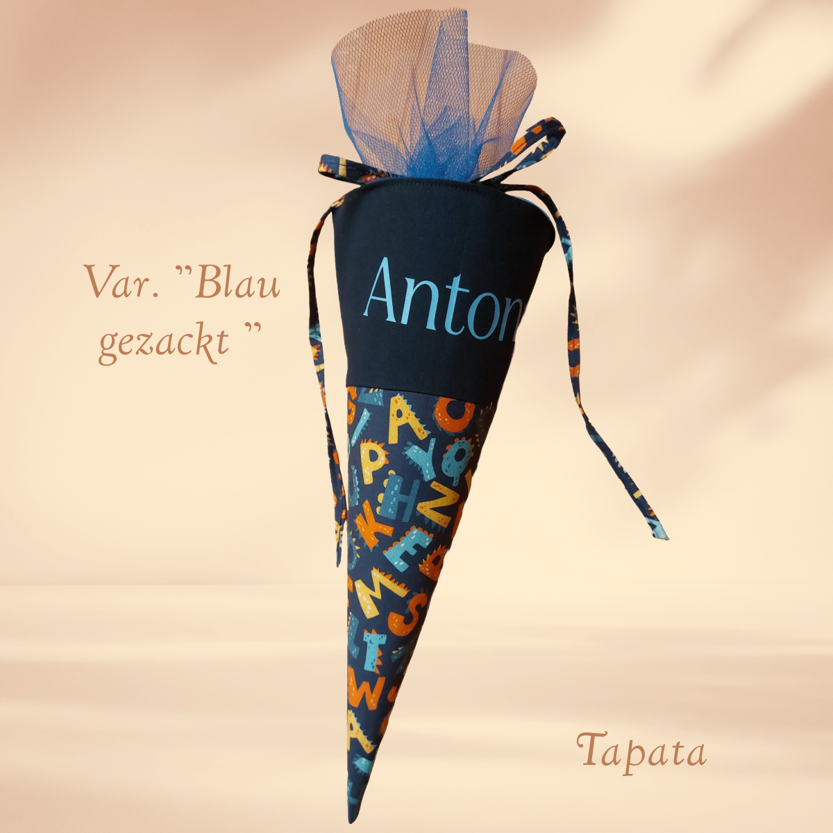 *Blau Gezackt: mit kleinen gezackten Buchstaben, Tüll: dunkelblau, Schrift hellblau
