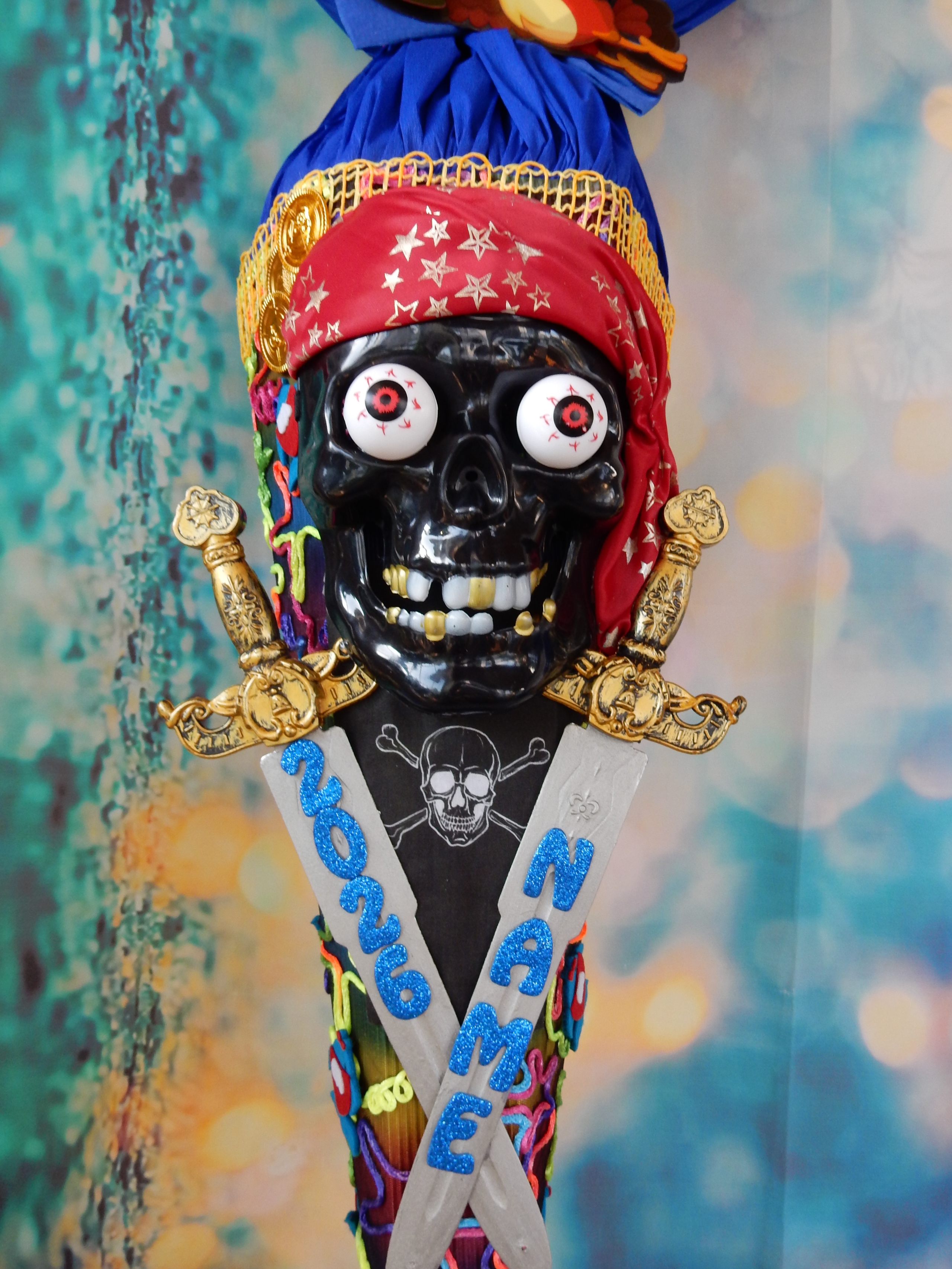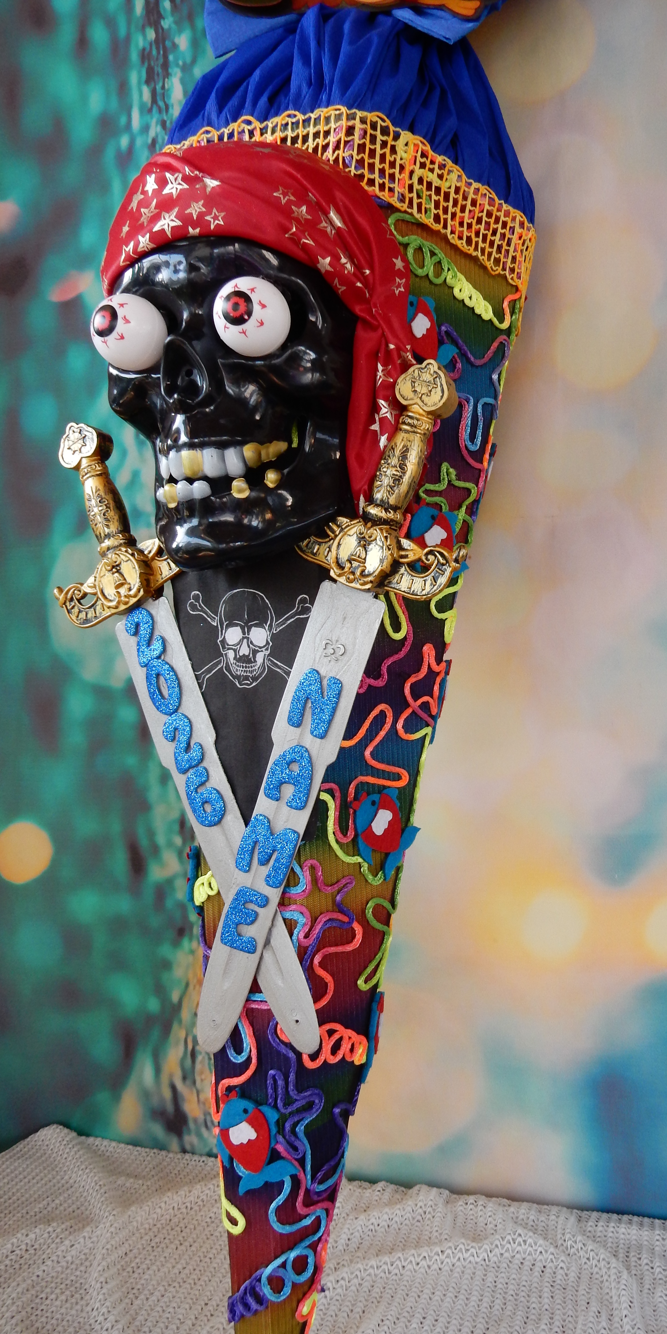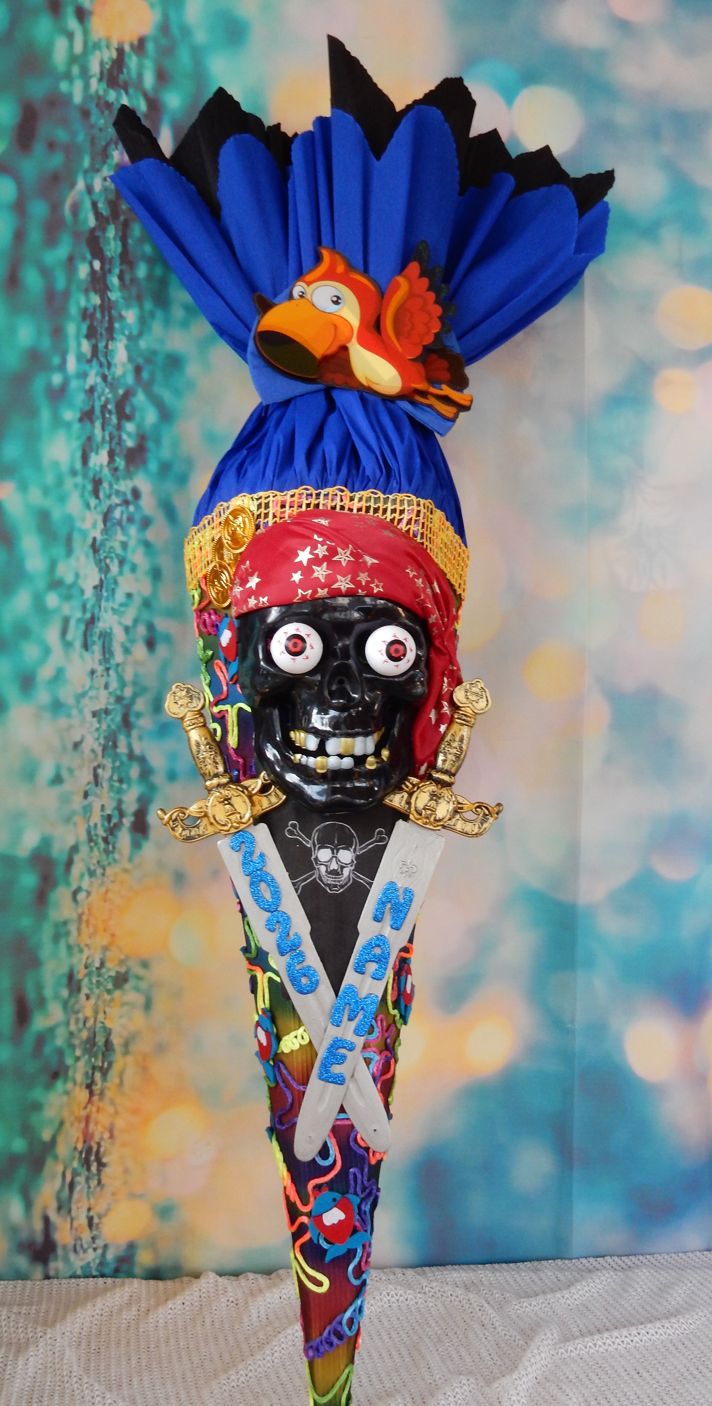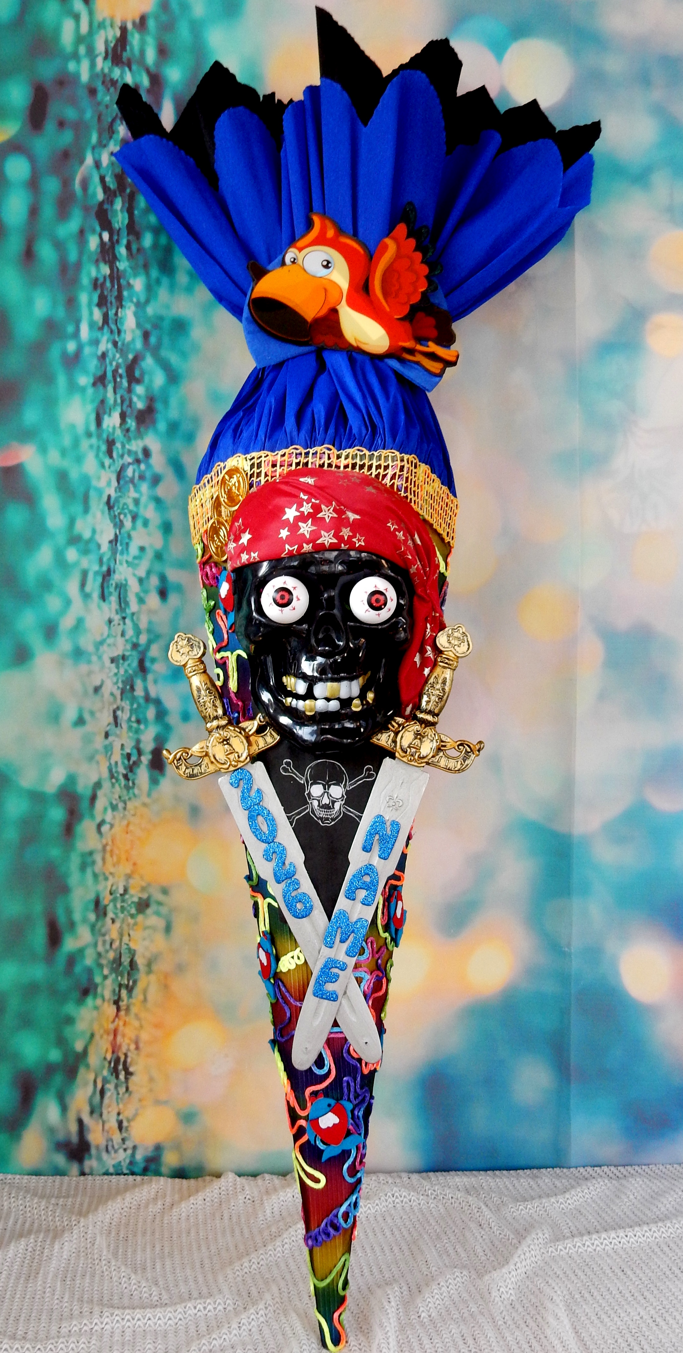 Die Zuckertüte ist aus einem 6 eckigen 3D-Wellpappenrohling mit Kreppverschluss.