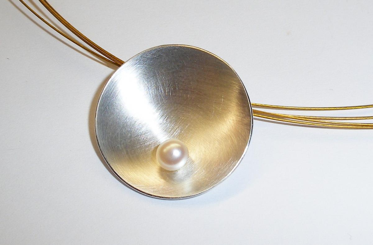 Wunderschöne Silberschale 925/00 mit weißer Süsswasserperle, matt gebürstet und am Rand poliert. Auf der Rückseite zwei Ösen.
