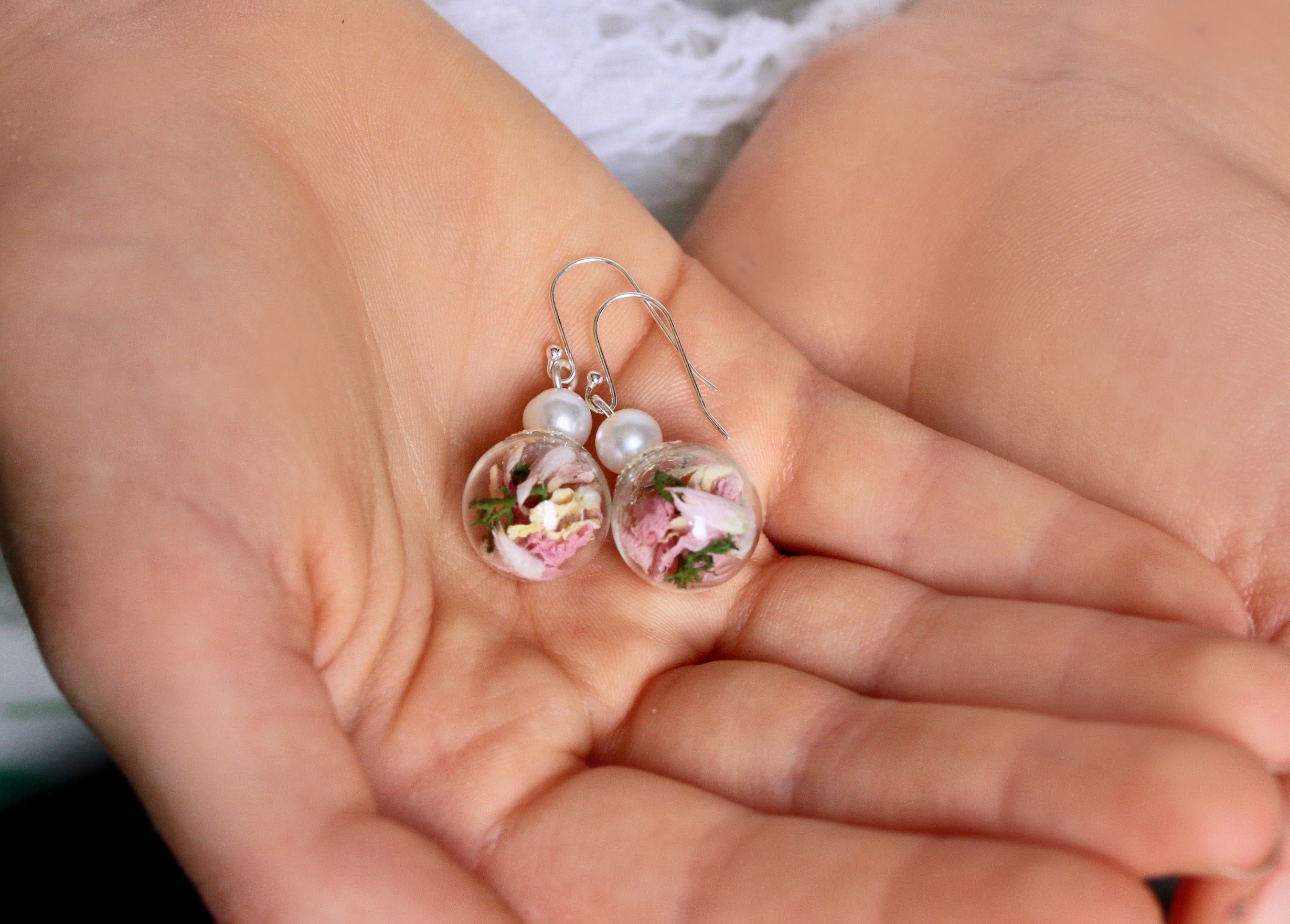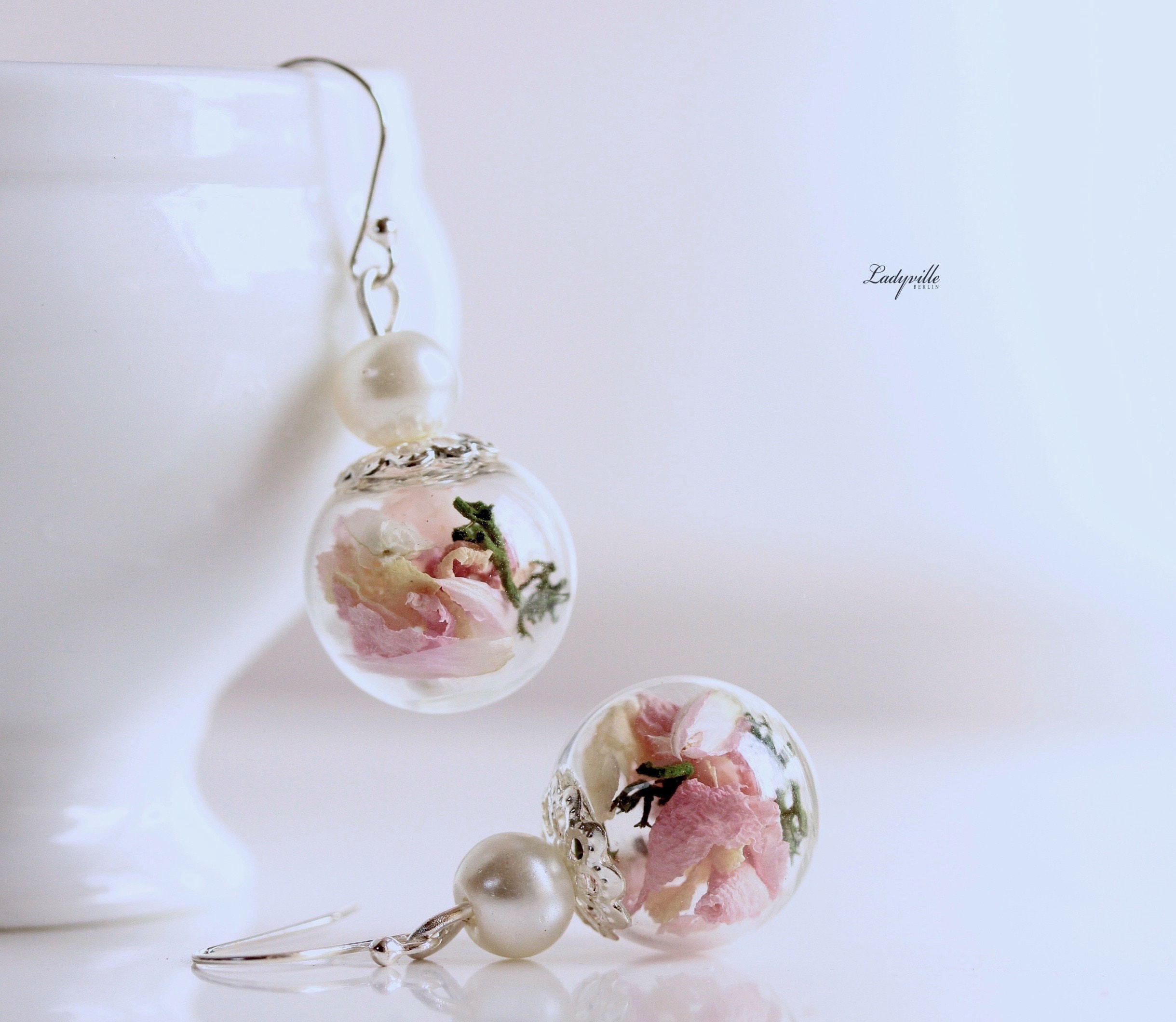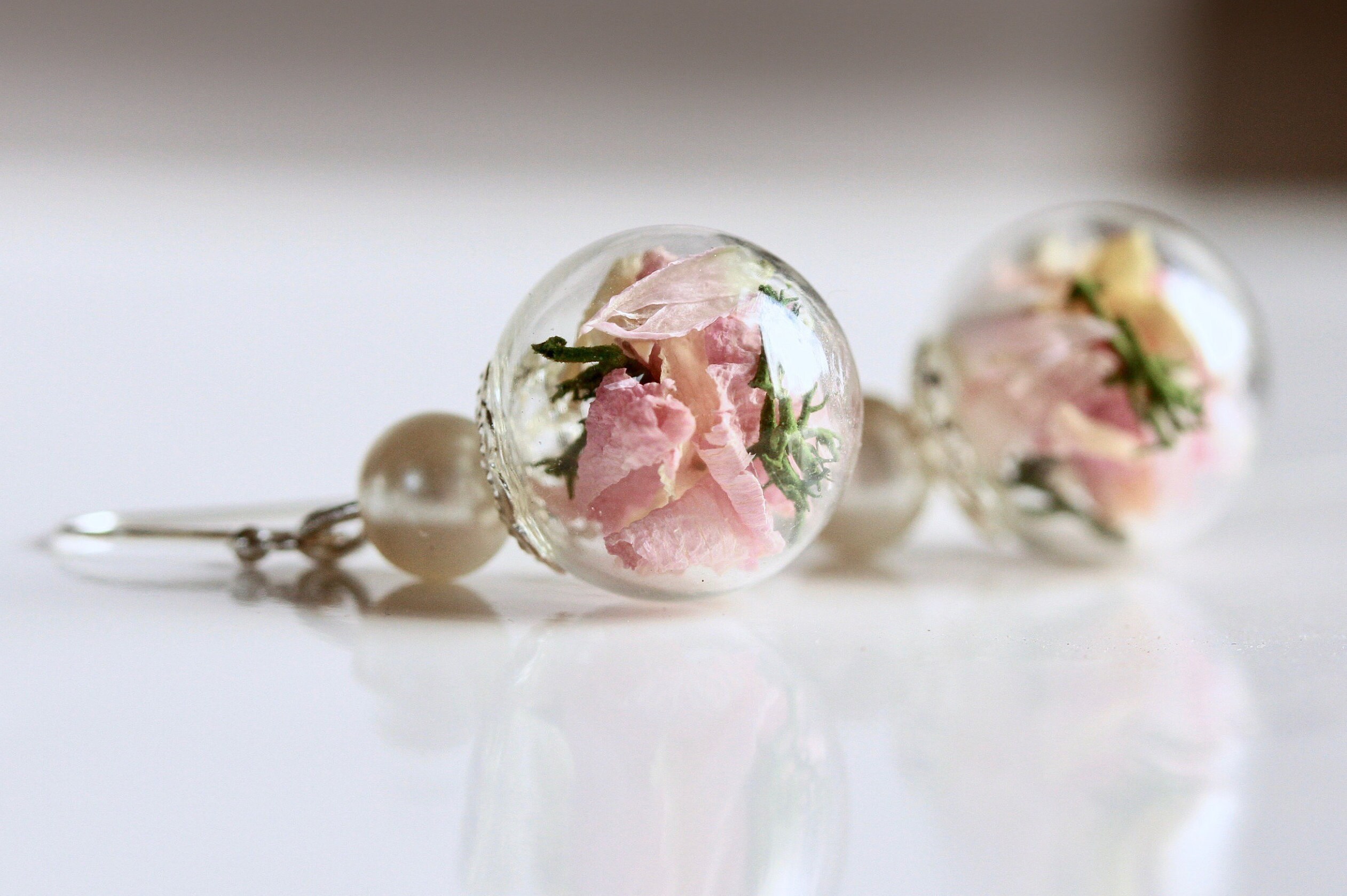 Feine Ohrhänger aus 925 Sterling Silber mit Blüten in verschiedenen Rosatönen, u.a. mit Teilen von Rosenblättern und ein wenig grünen Moos, die in einer Glaskugel für die Ewigkeit festgehalten wurden. Das Ganze wurde mit einer kleinen Glaswachsperle verschönt.