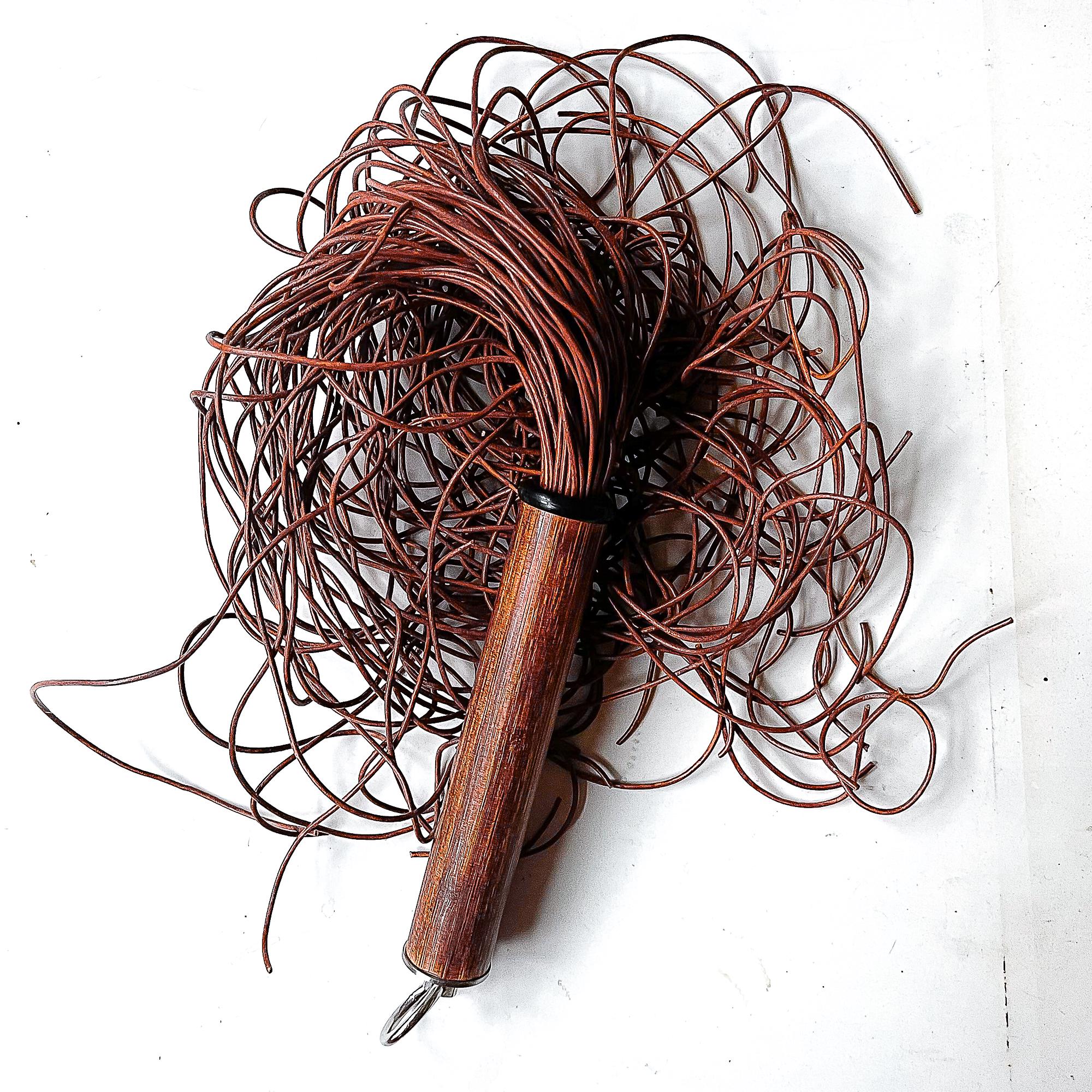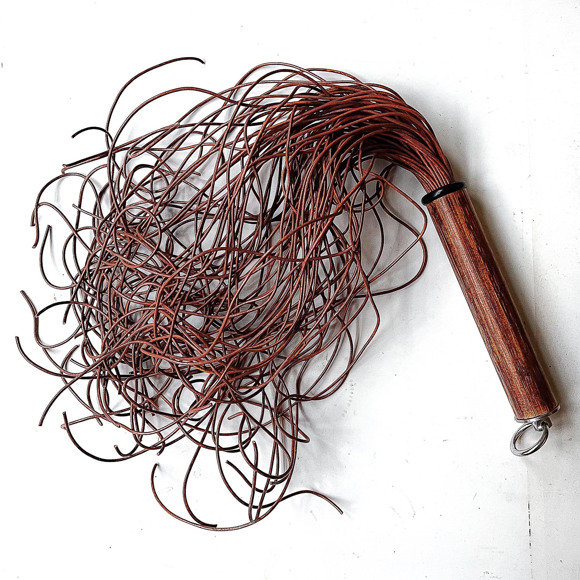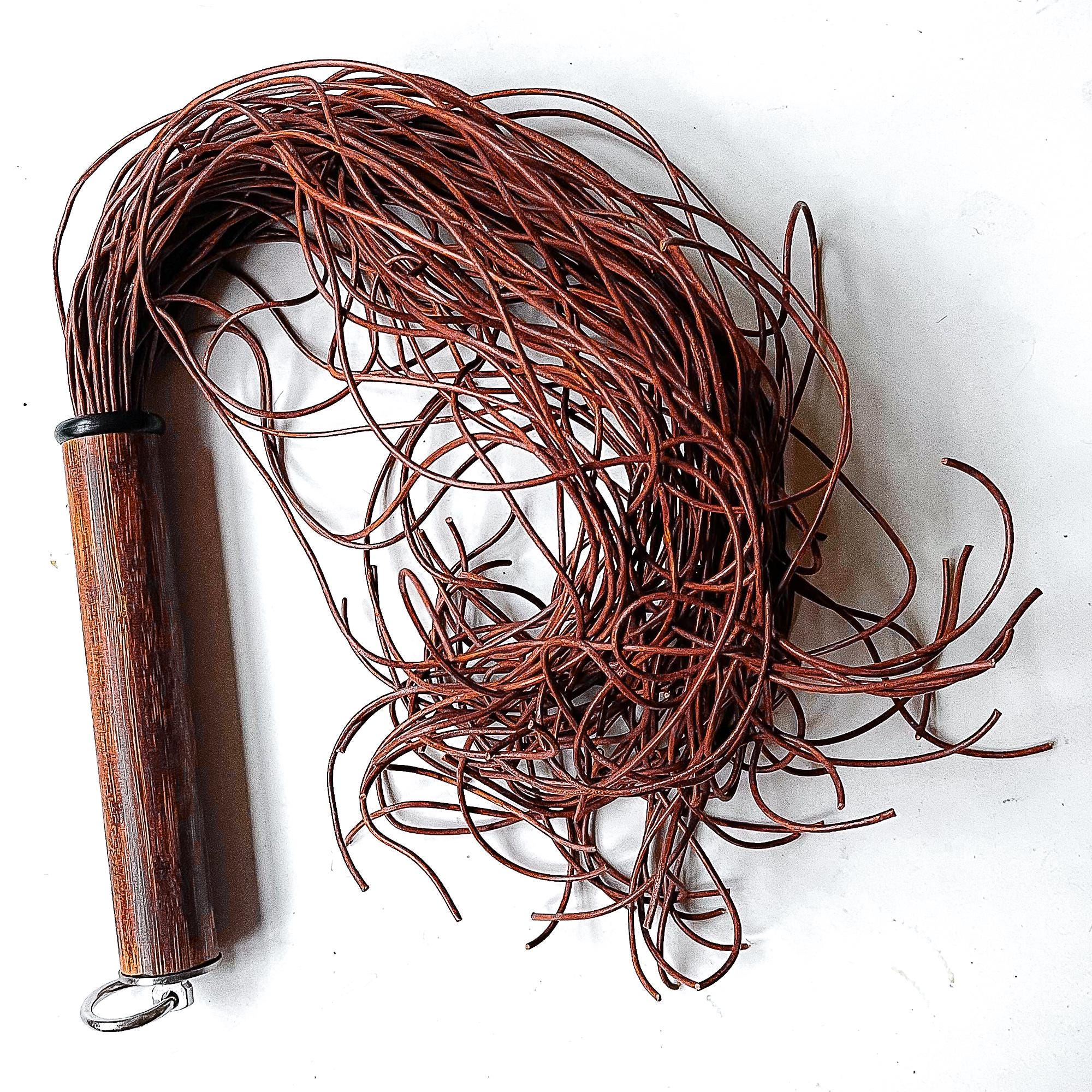 Flogger mit mindestens 80 Strängen aus vintage-braunen 2mm runden Lederschnüren, ca. 61cm/24", davon ca. 17cm/7“ Griff aus individuell gefärbtem Bambusholz, veredelt mit feinstem Lack und mit einem Abschluss aus V2A Edelstahl.