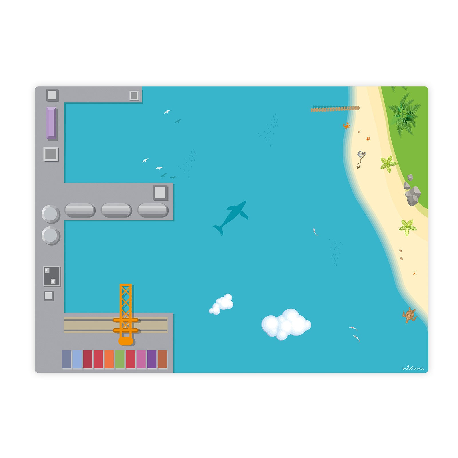 Der Spielteppich auf dem Tisch. Ihr Kind kann aufrecht stehen und bequem mit seinen Booten und Tieren spielen.