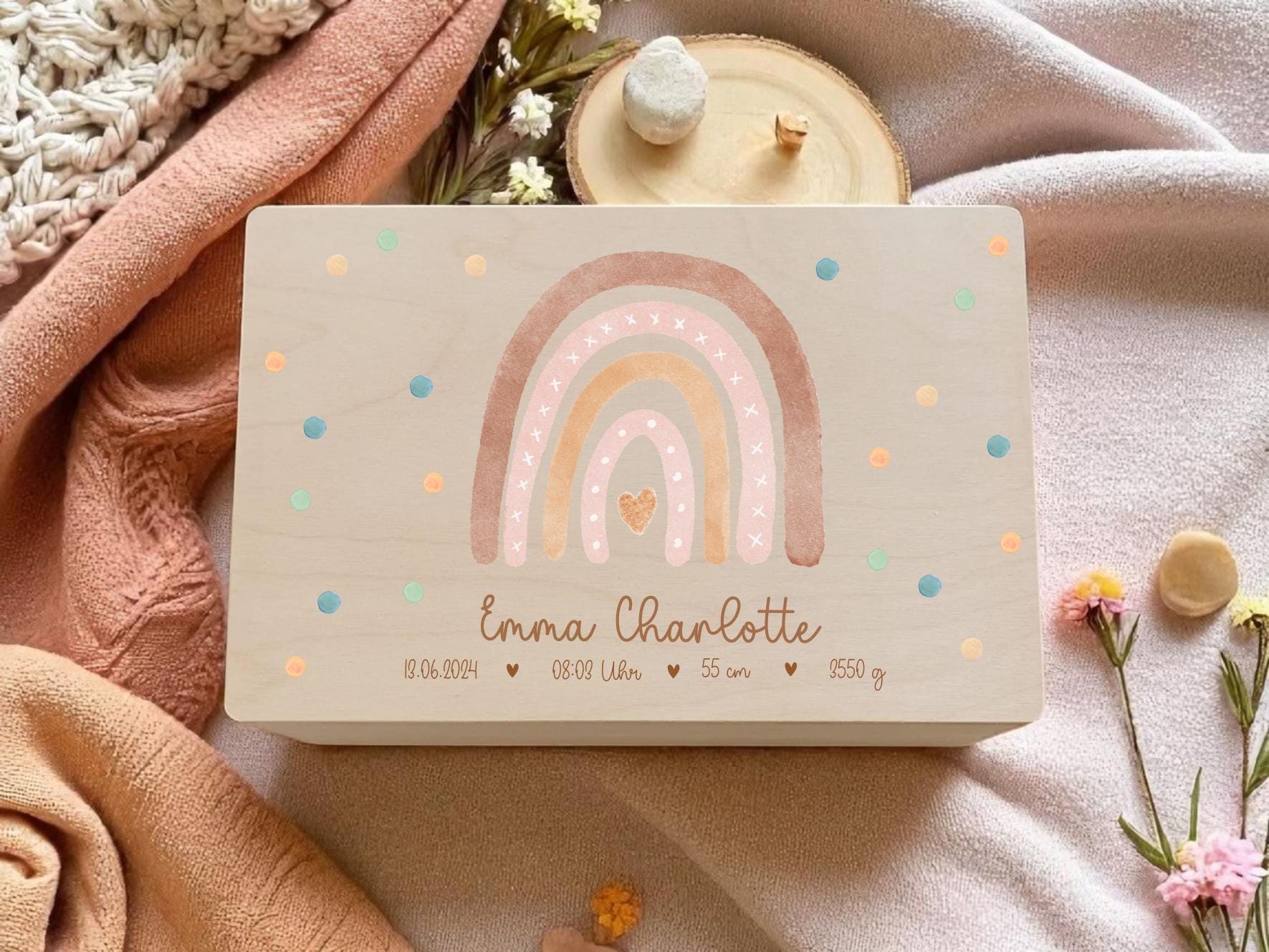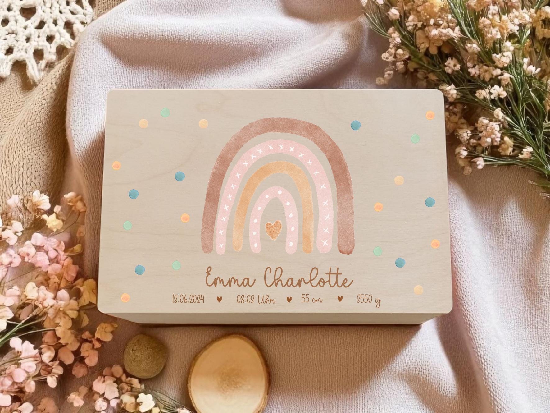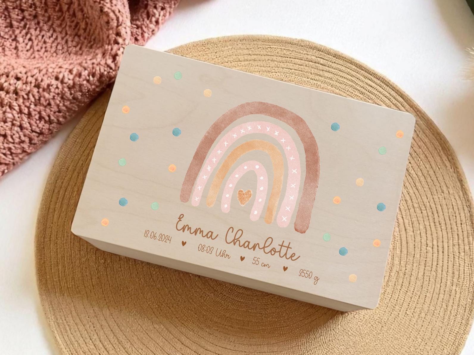 • Schenke ein Unikat, das mitwächst! Diese hochwertige Holzkiste besticht durch ein zeitloses Design im angesagten Boho-Stil. Ein wunderschöner Regenbogen in sanften Pastelltönen bildet das Herzstück, spielerisch umrahmt von feinen, farblich abgestimmten Pastell-Punkten, die sich über die Kiste verteilen.